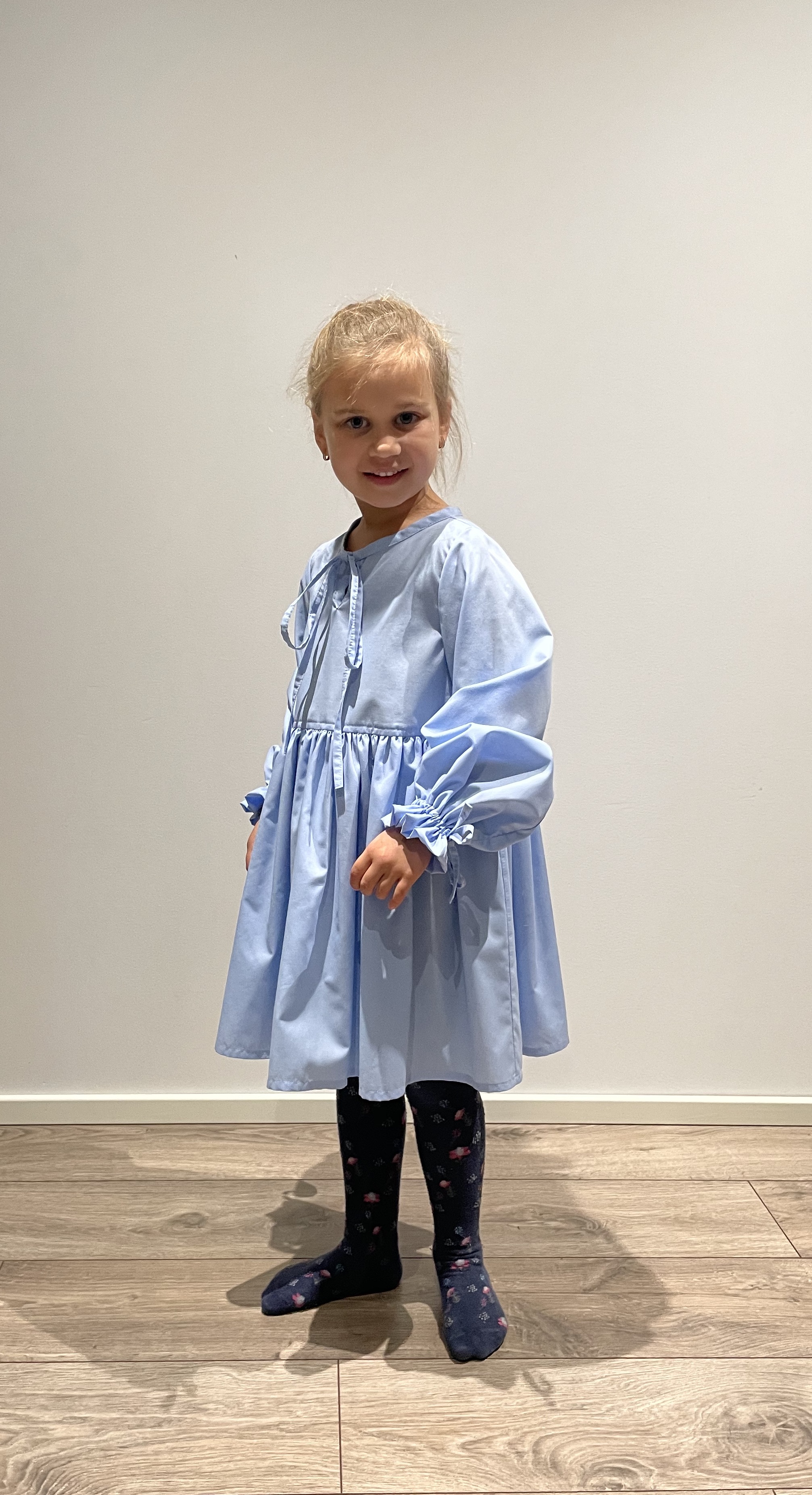 Helesinine kleidike laia seelikuosa ja efektsete varrukatega. Kleidi pikkus 60 cm.
