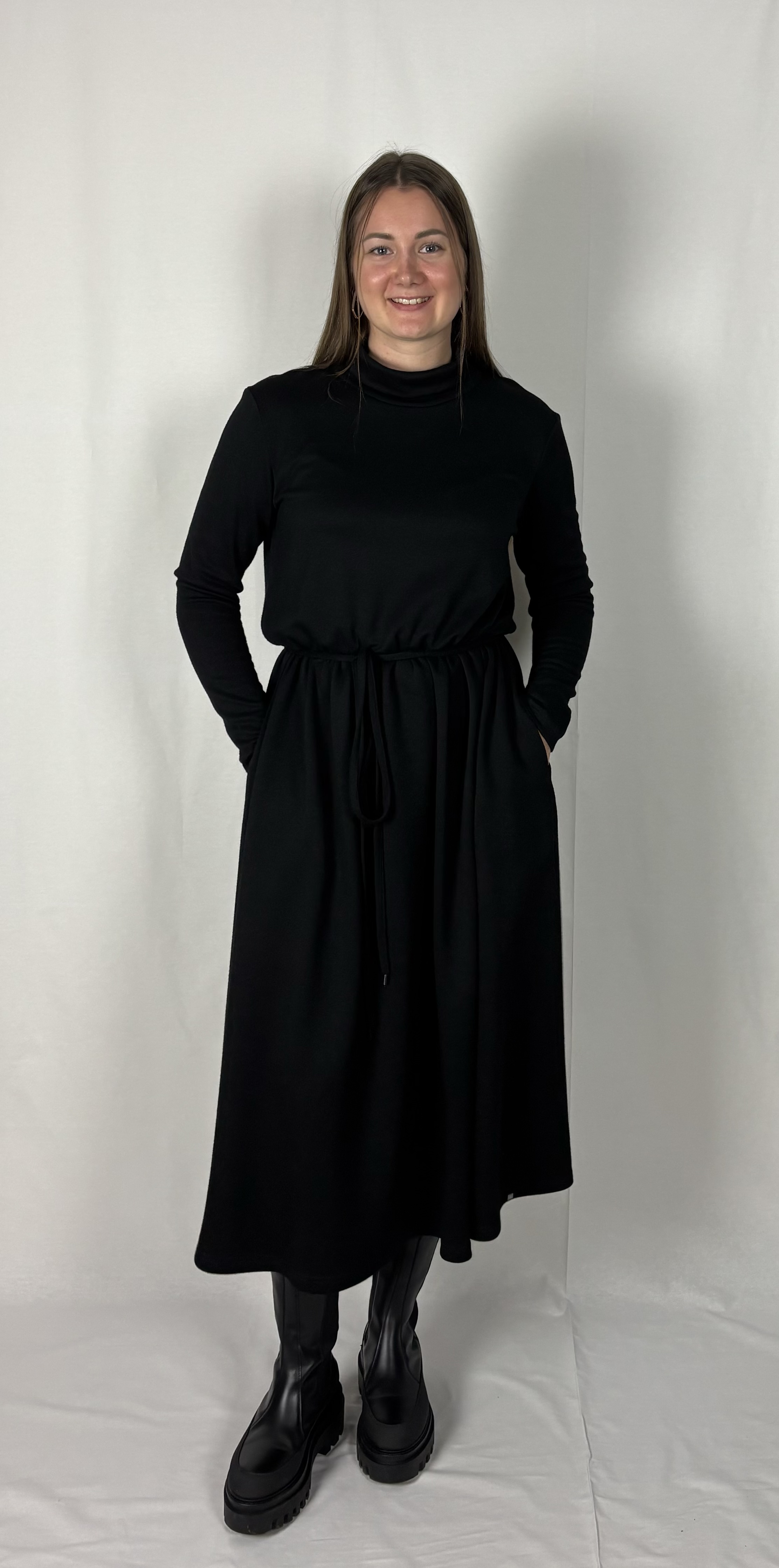 Kleit on vööjoonelt läbilõikega, seelikuosa on kloššlõikeline, vööjoon elastne, taskud küljeõmblustes. Kleidil on kõrge kaelus.