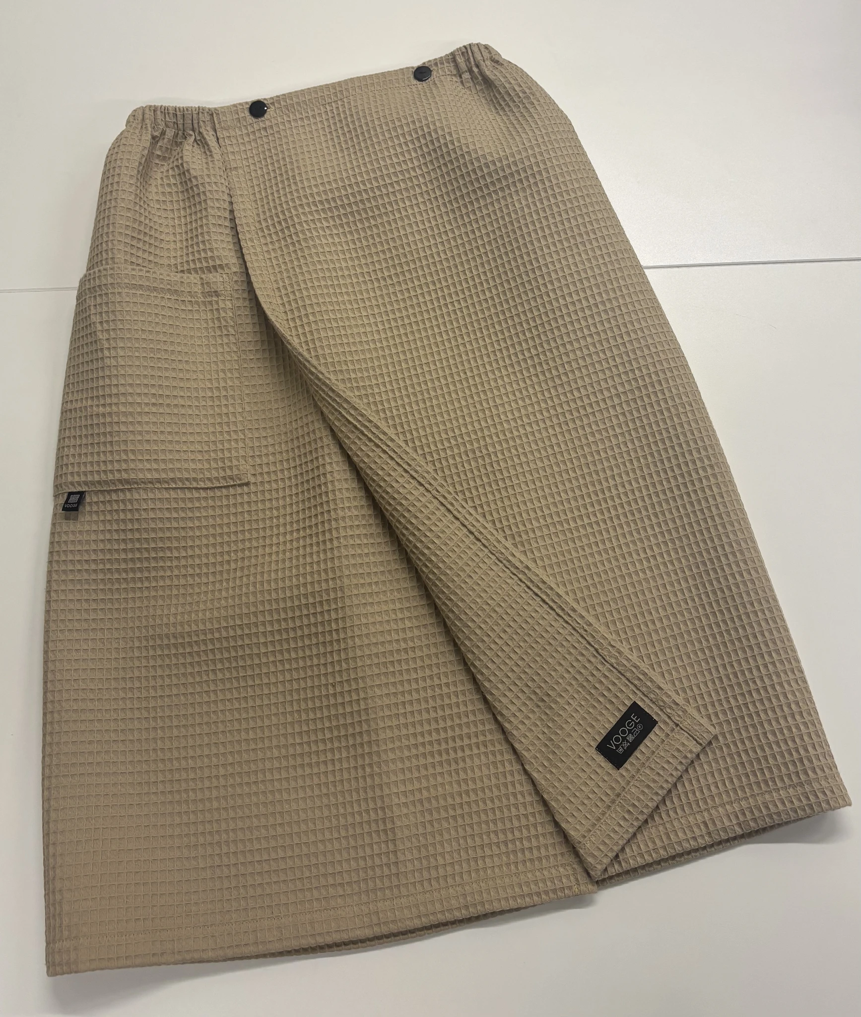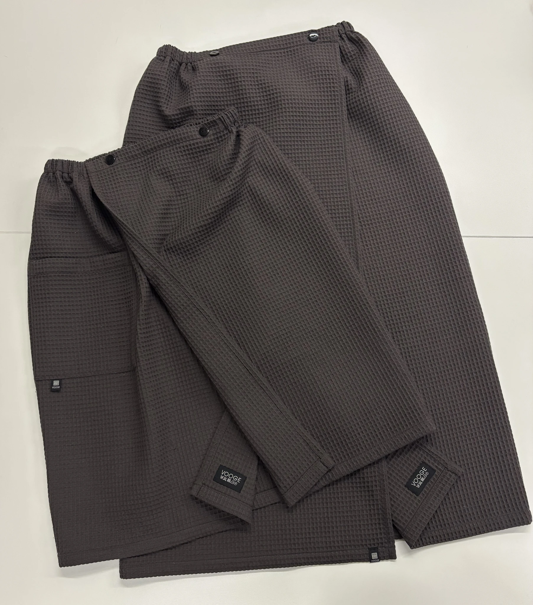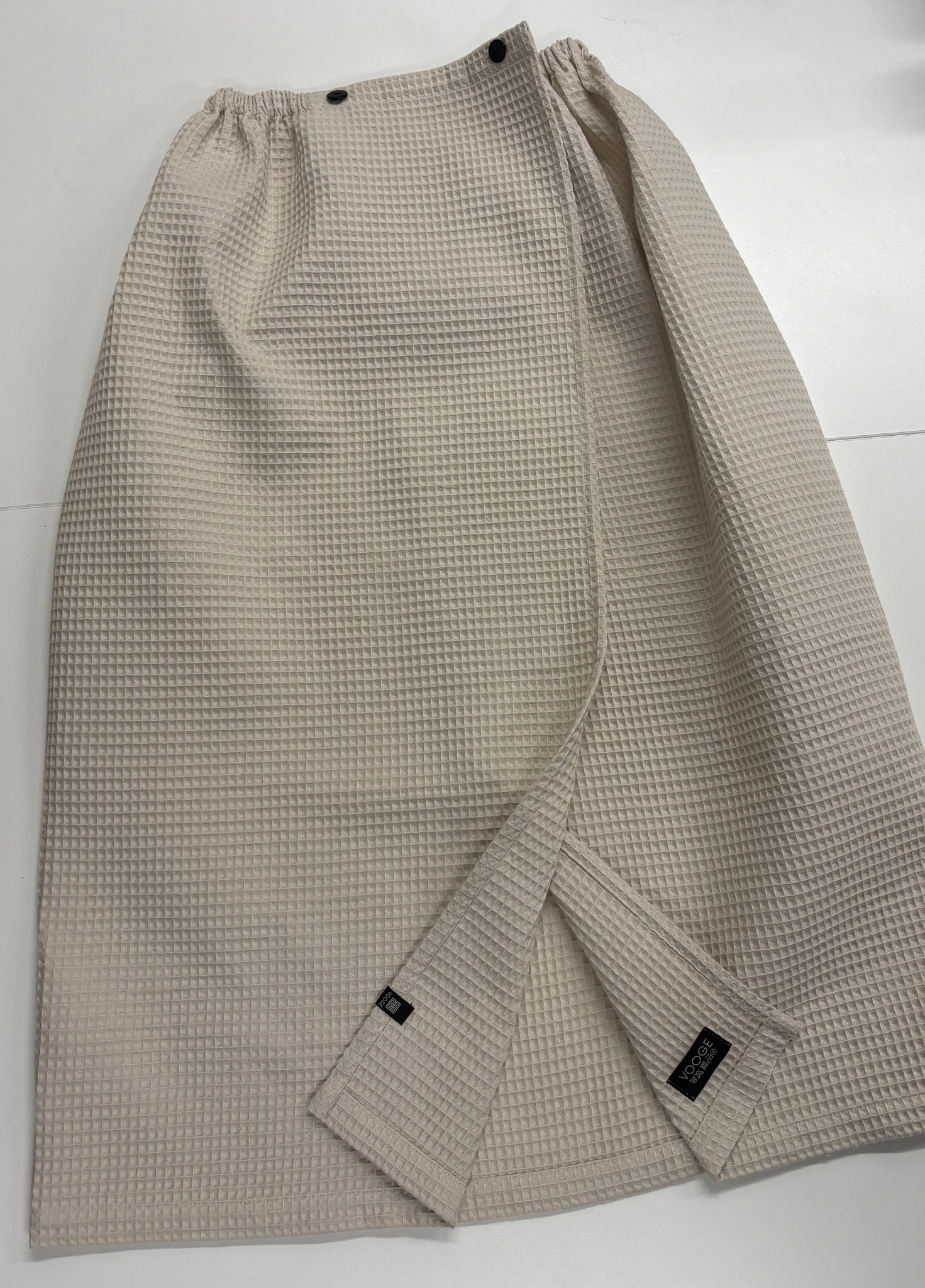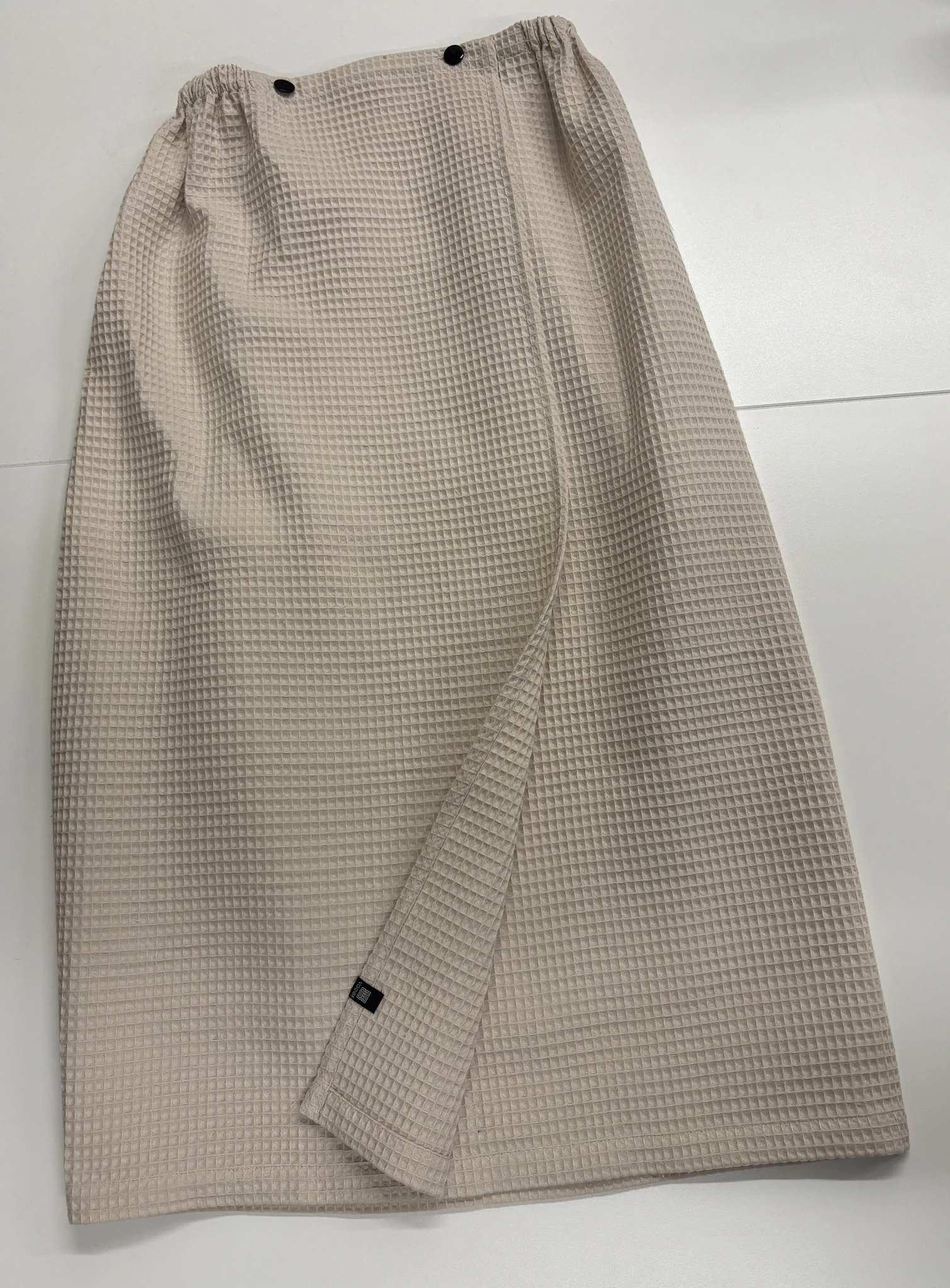 100% puuvillasest vahvelkangast saunaseelikud nii naistele kui ka meestele. Kõik saunaseelikud on elastse kinnitusega, kõikide saunaseelikute kinnituskoha mõõt venitamata on 74 cm. Venib vabalt kuni 100 cm. Meeste saunaseelikul on pealeõmmeldud tasku ja on saadaval kahes pikkuses. Naiste saunaseelik on ilma taskuta ja ühes mõõdus. Meeste saunaseelik taskuga –