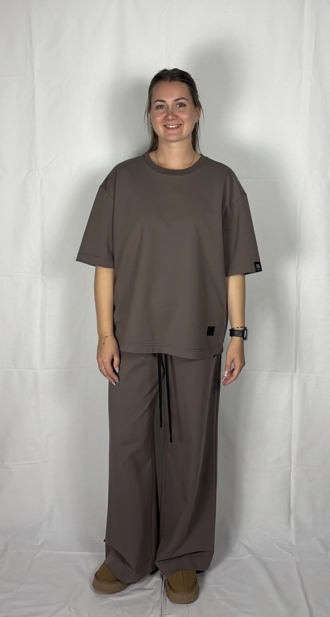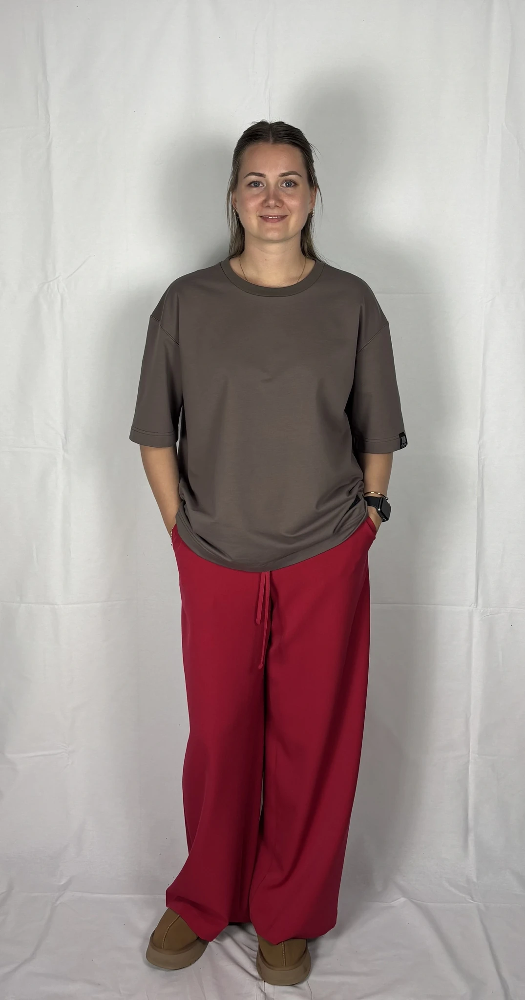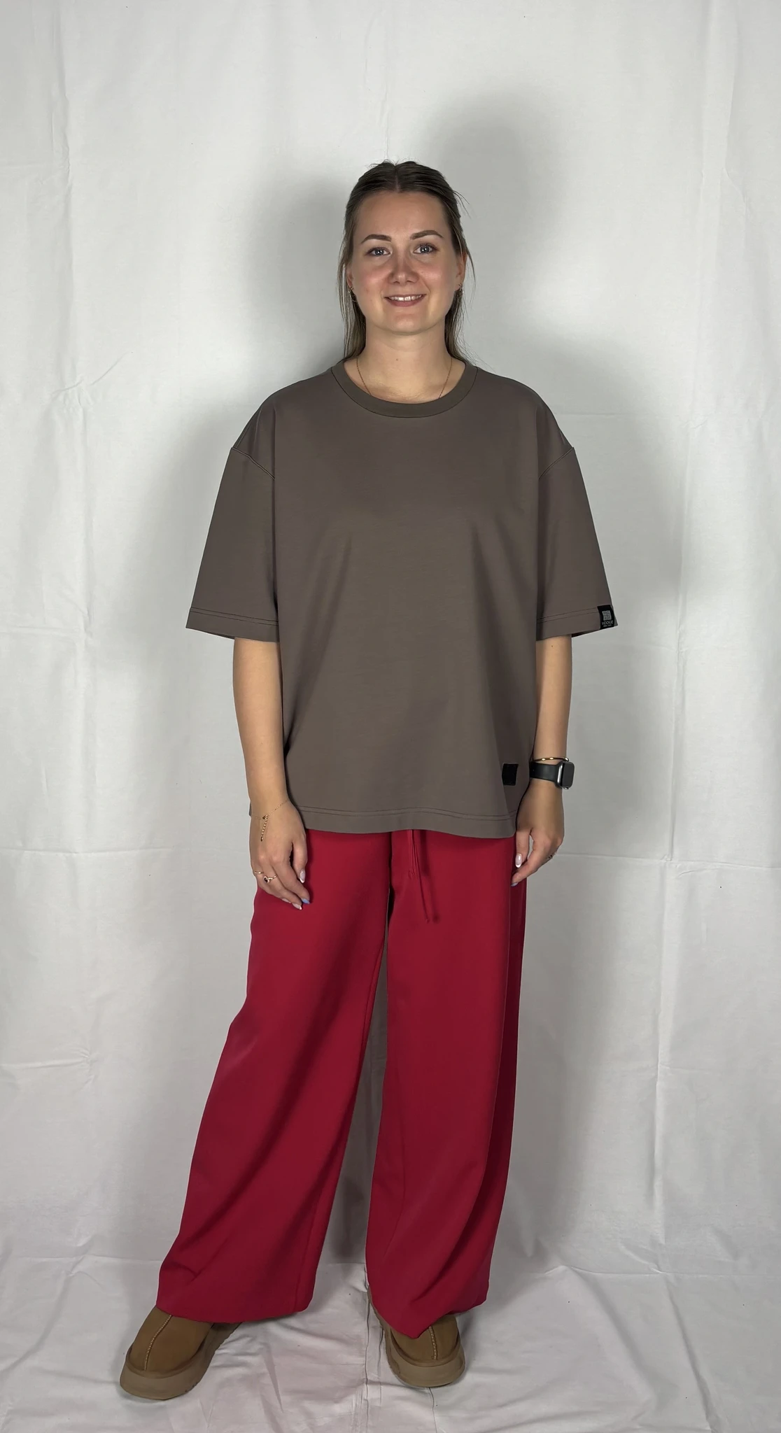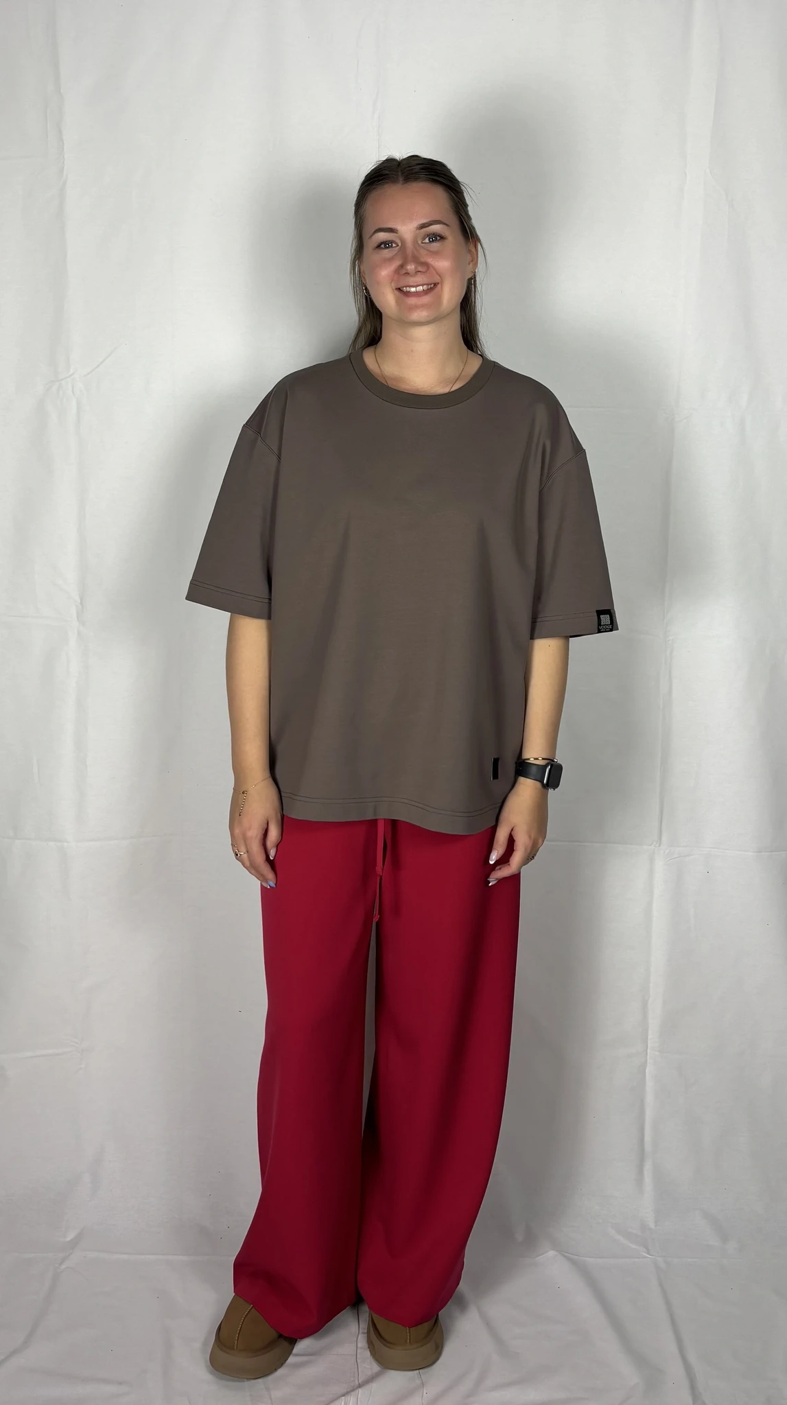 Modellil on seljas kakaopruuni värvi T-särk, suurus M. Modelli pikkus on 165 cm.