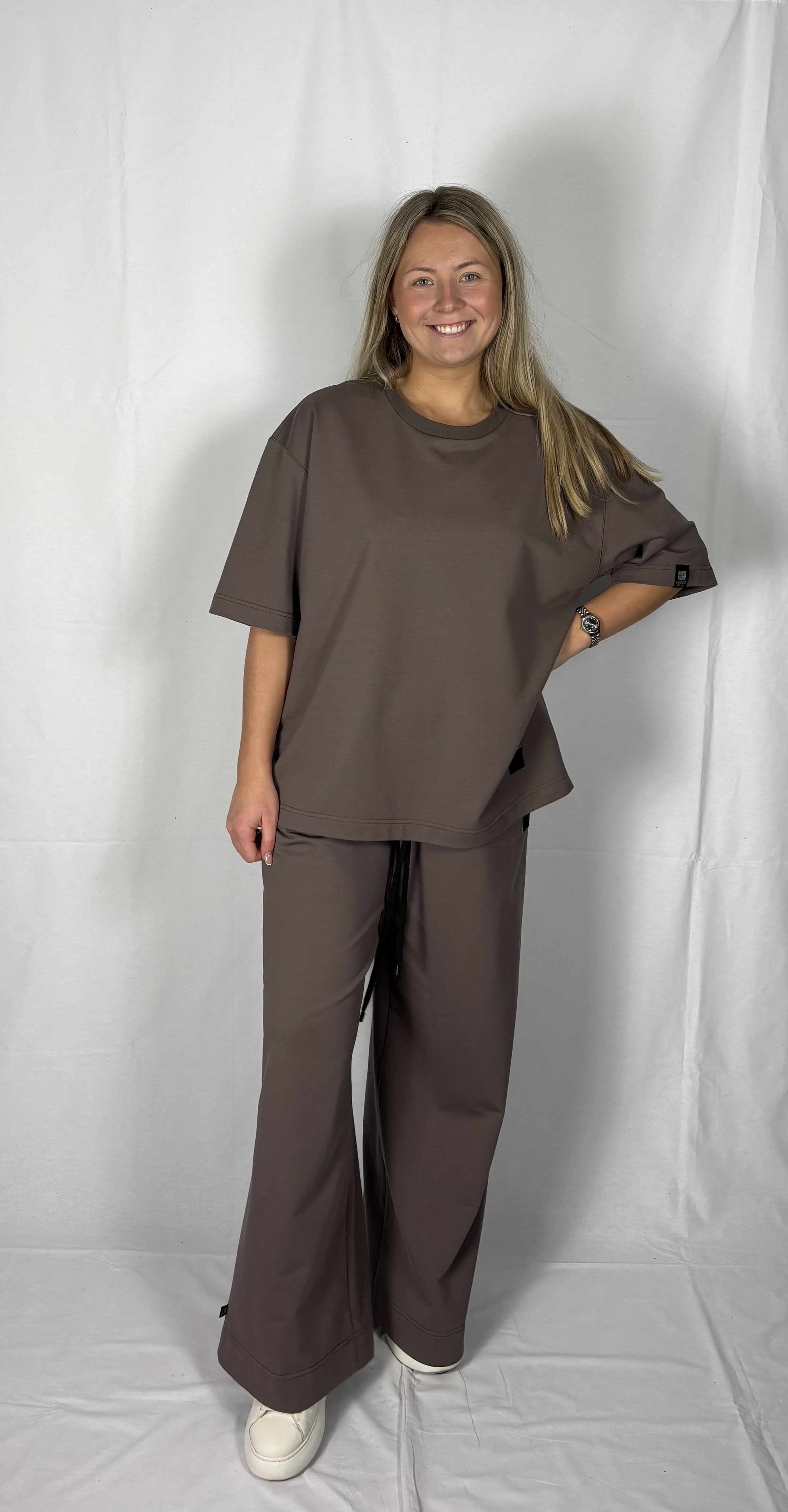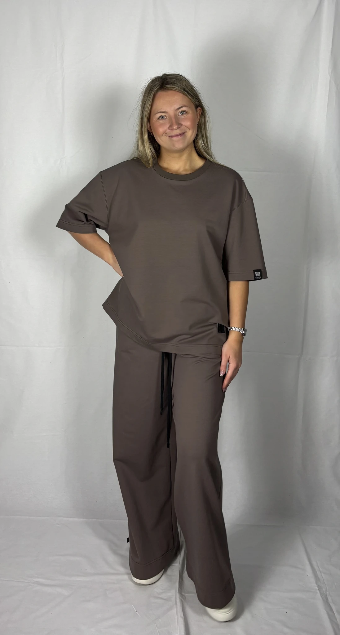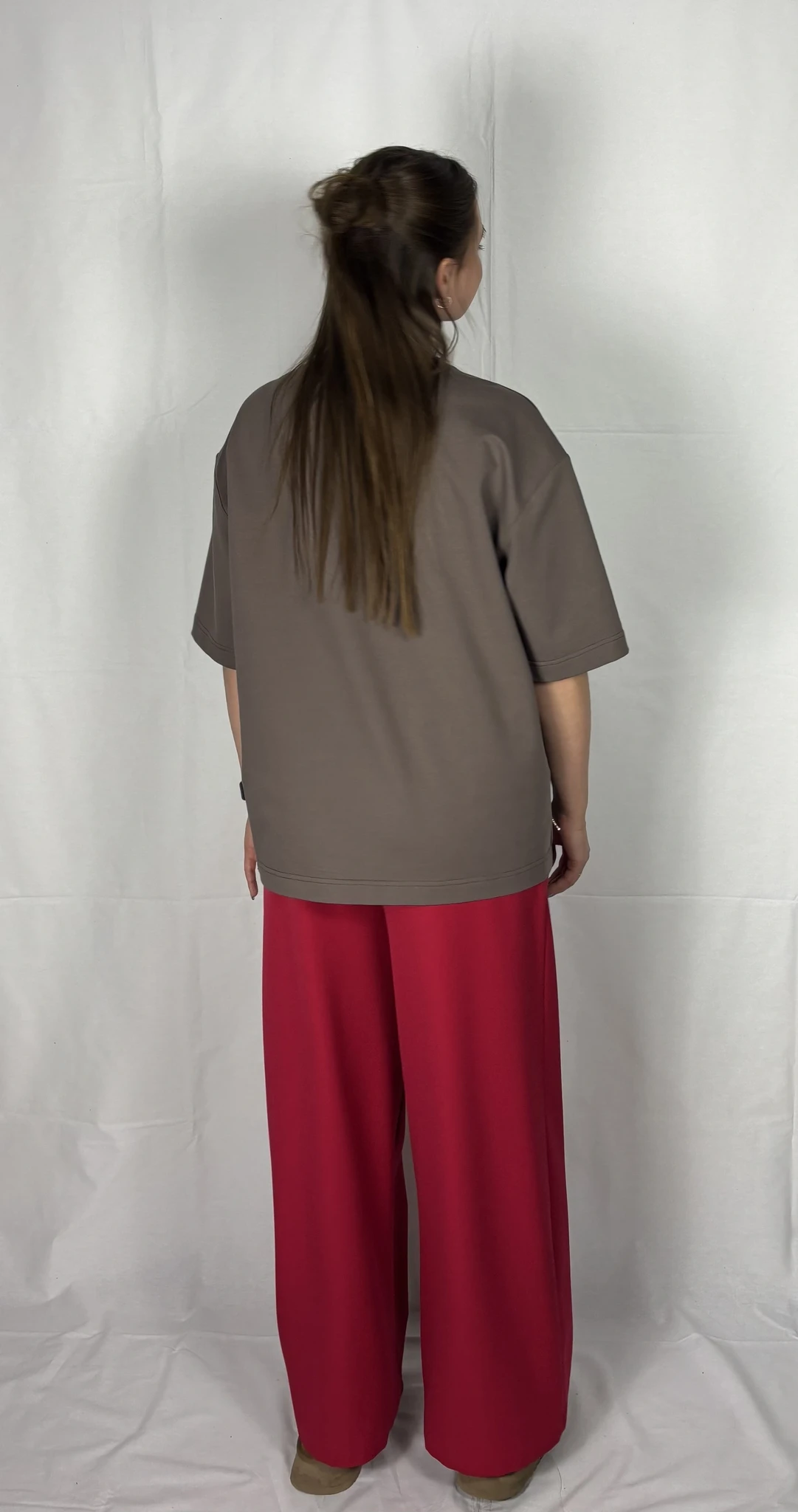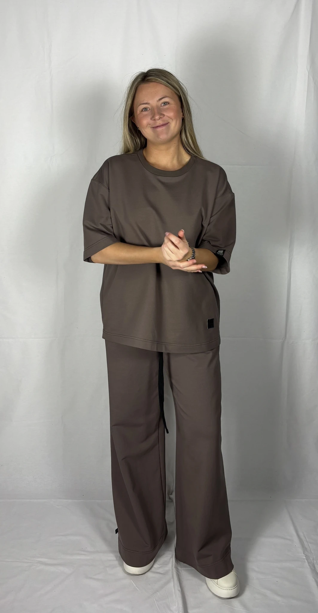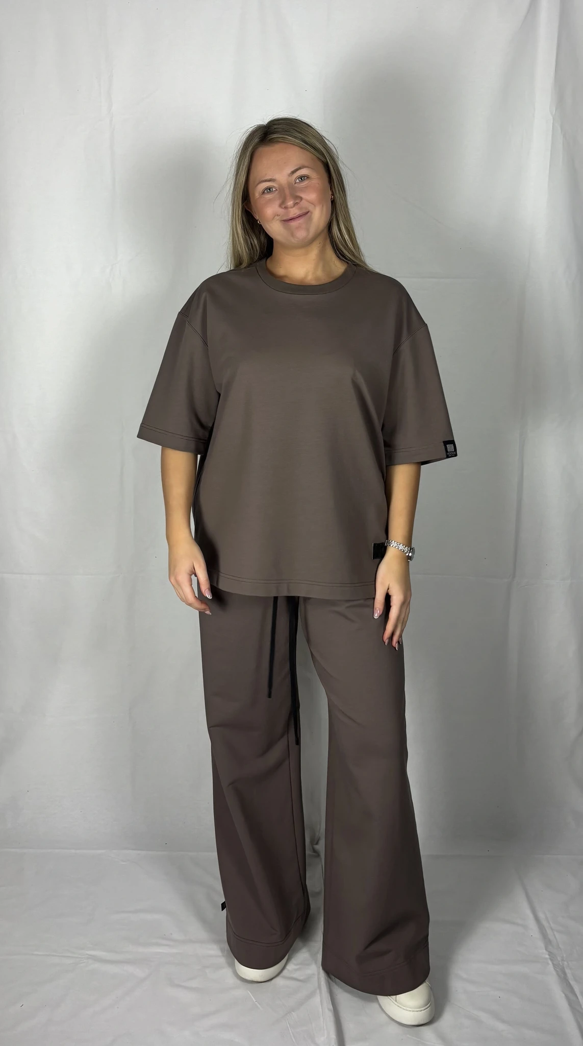 Modellil on seljas kakaopruuni värvi T-särk, suurus M. Modelli pikkus on 165 cm.