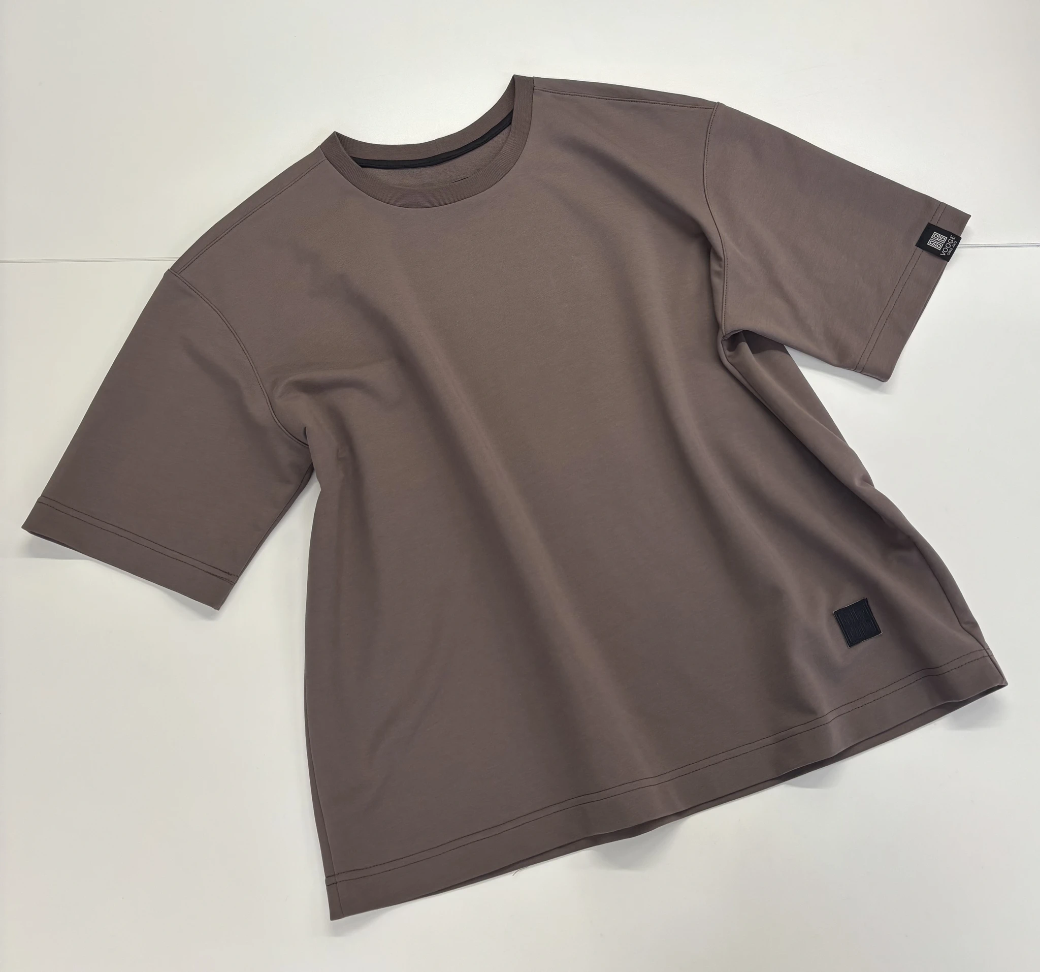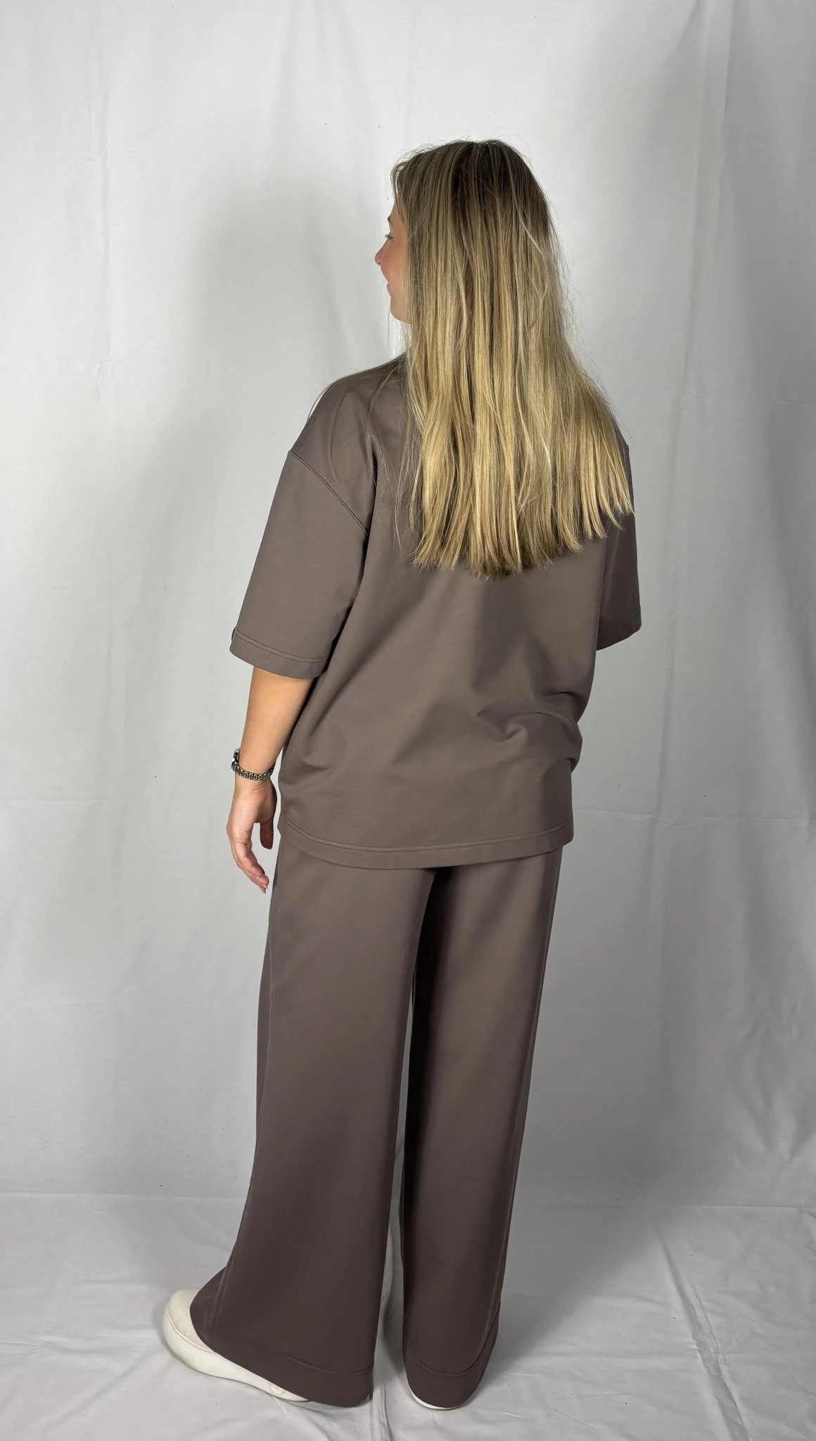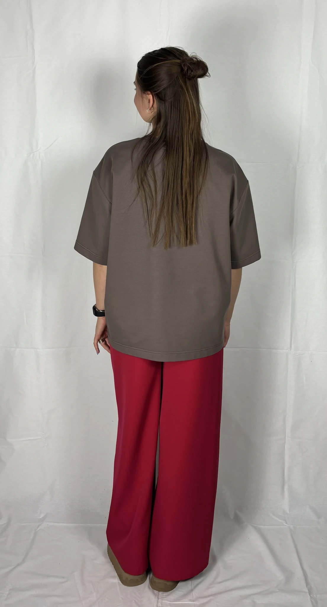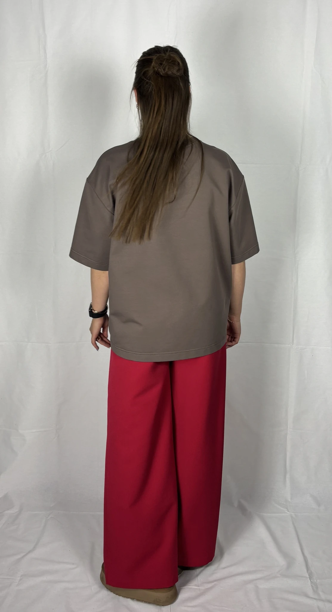 Modellil on seljas kakaopruuni värvi T-särk, suurus M. Modelli pikkus on 165 cm.