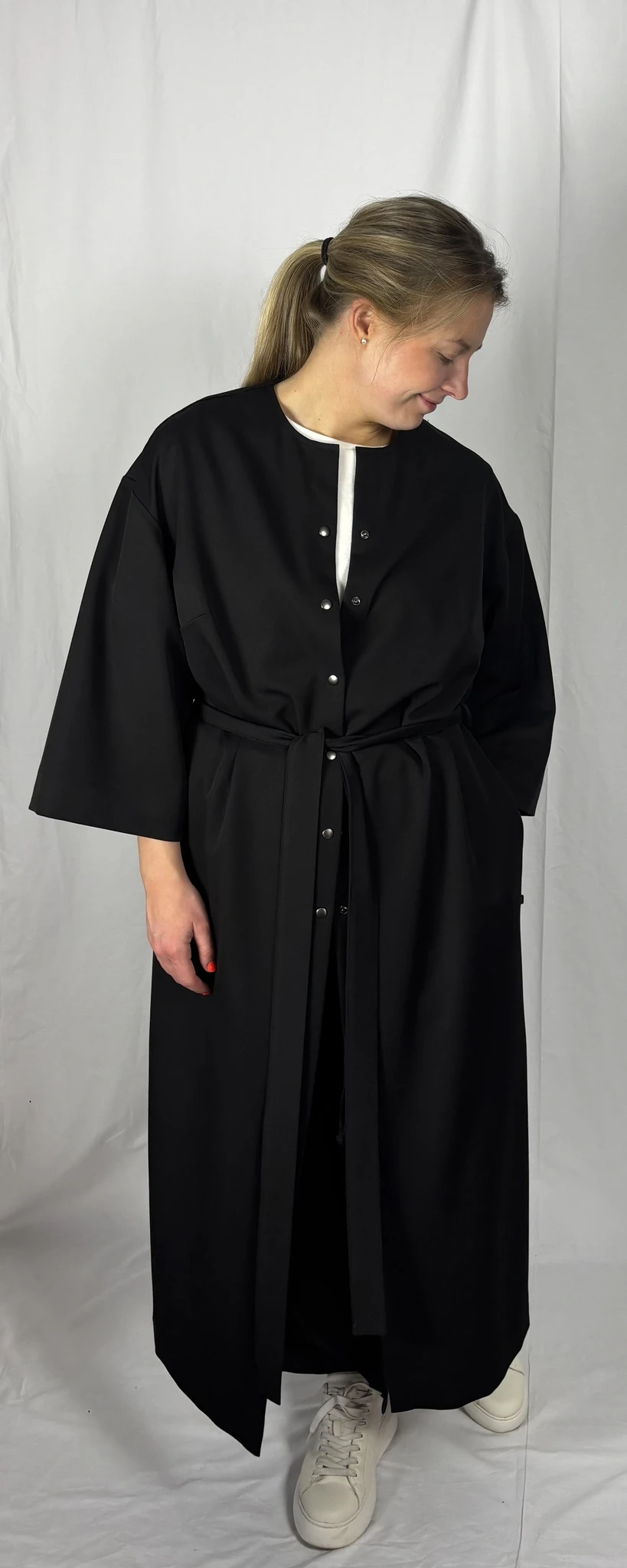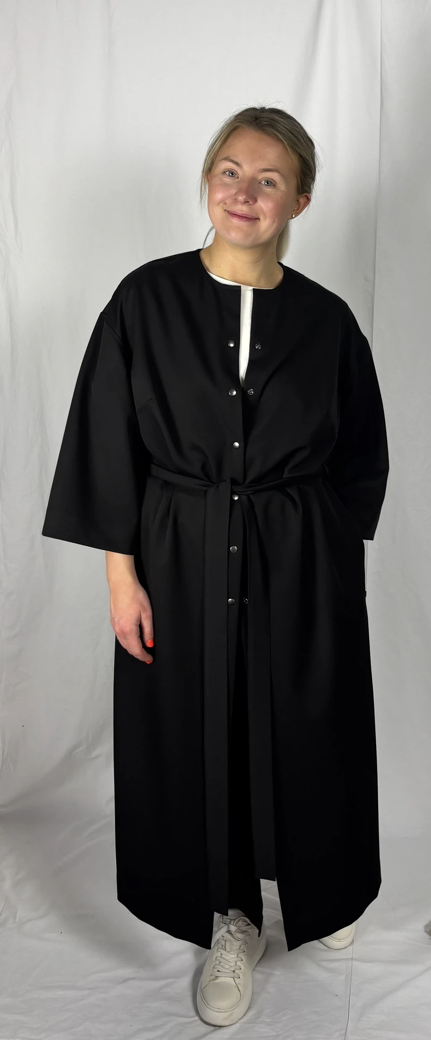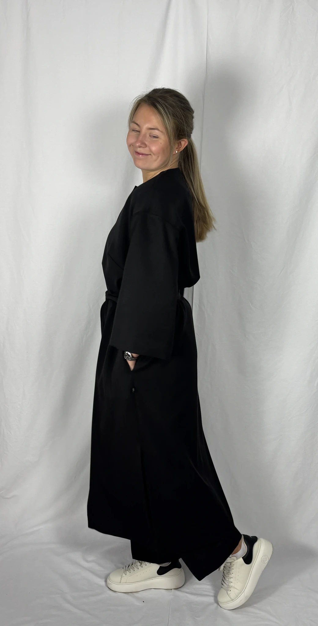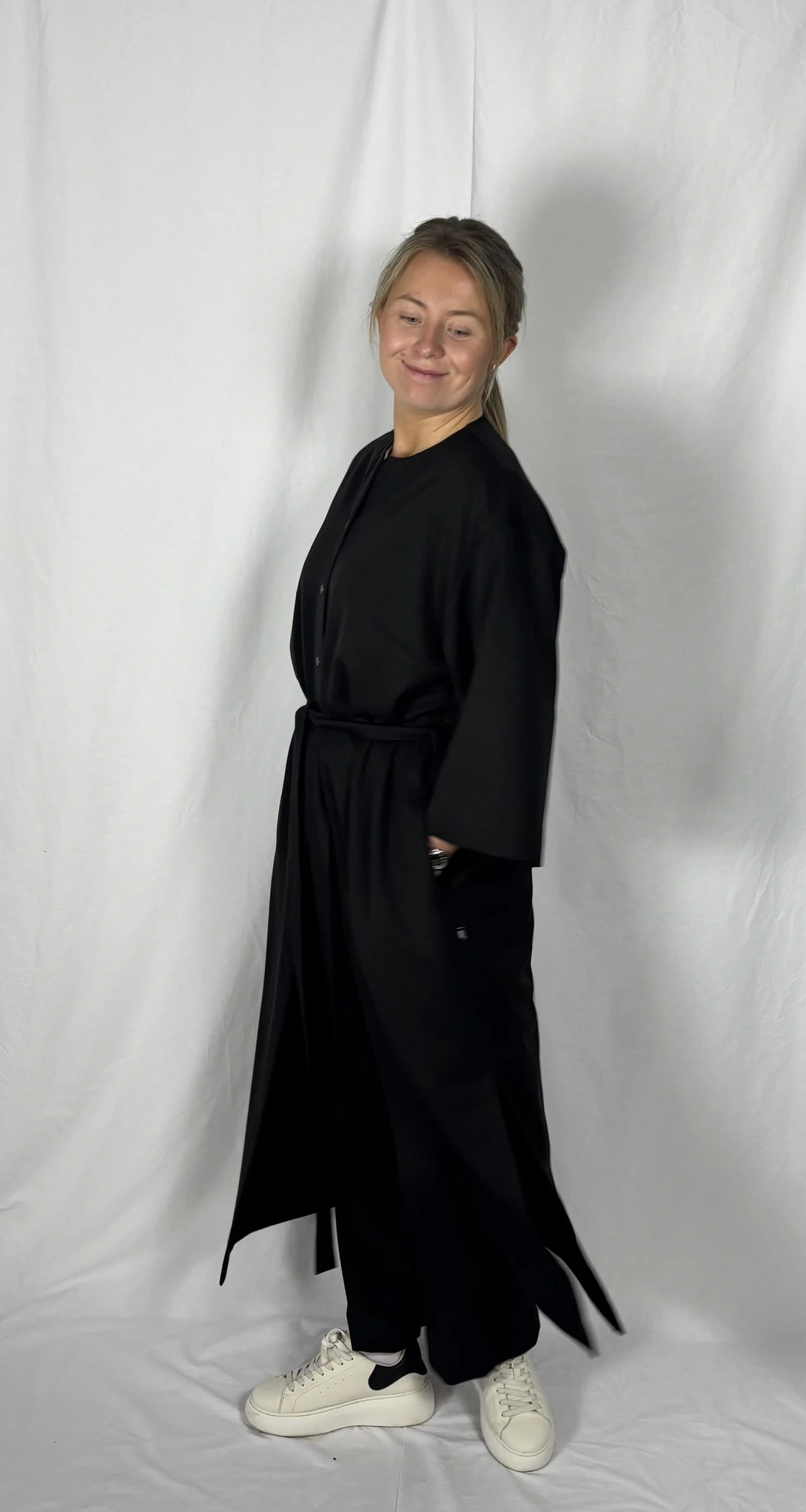 Modellil on seljas musta värvi pikk jakk, suurus M. Piltidel värvid -