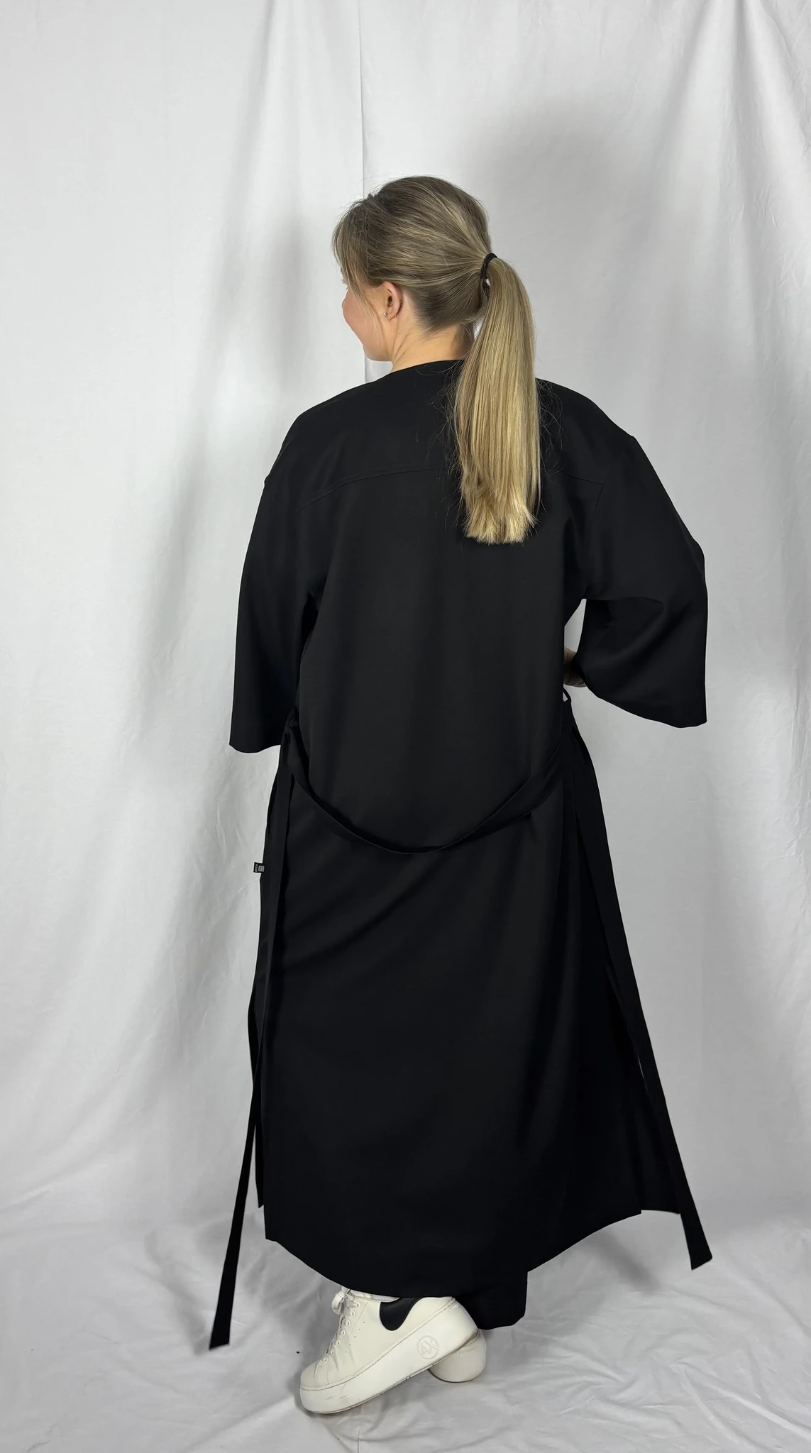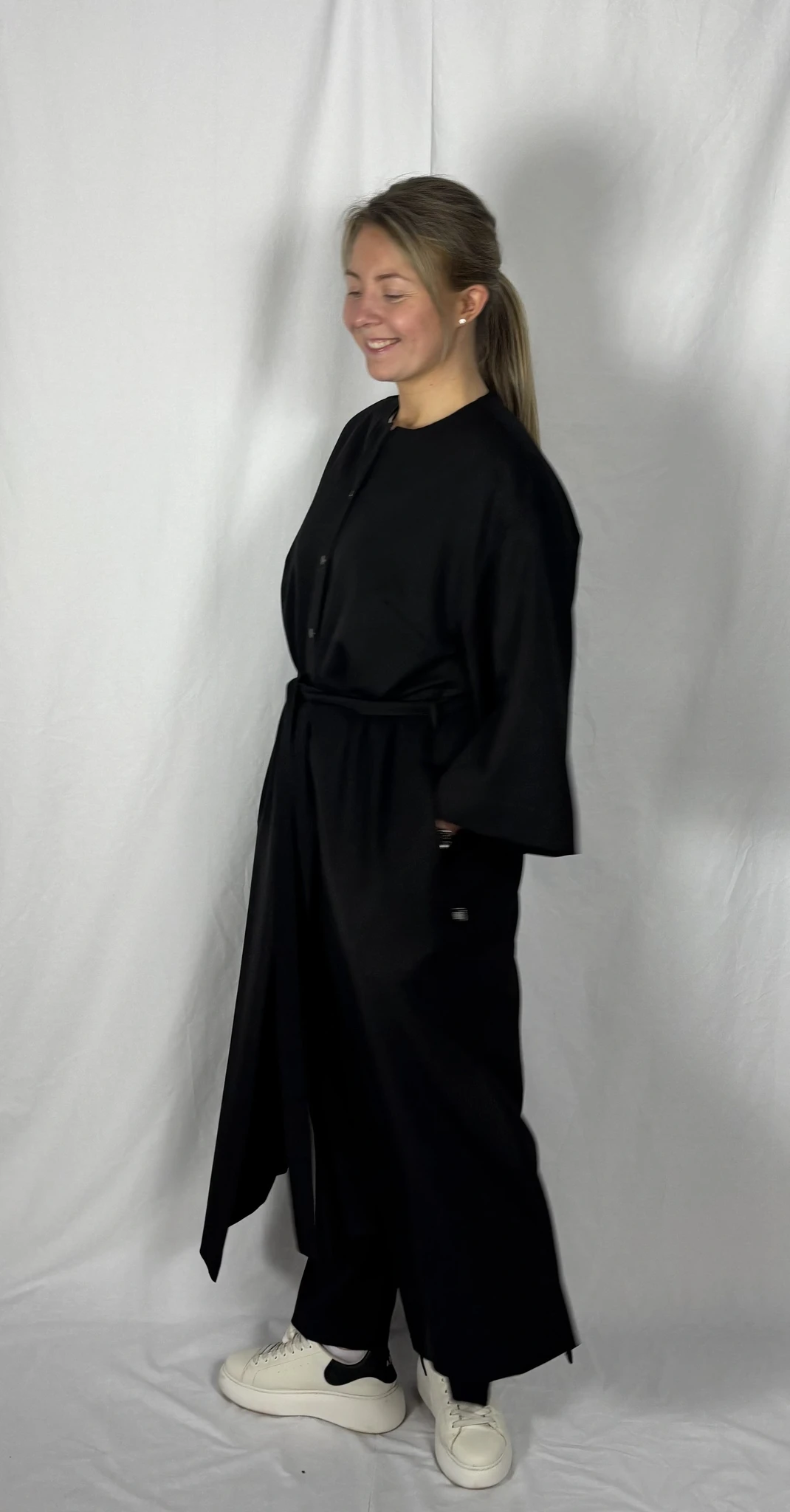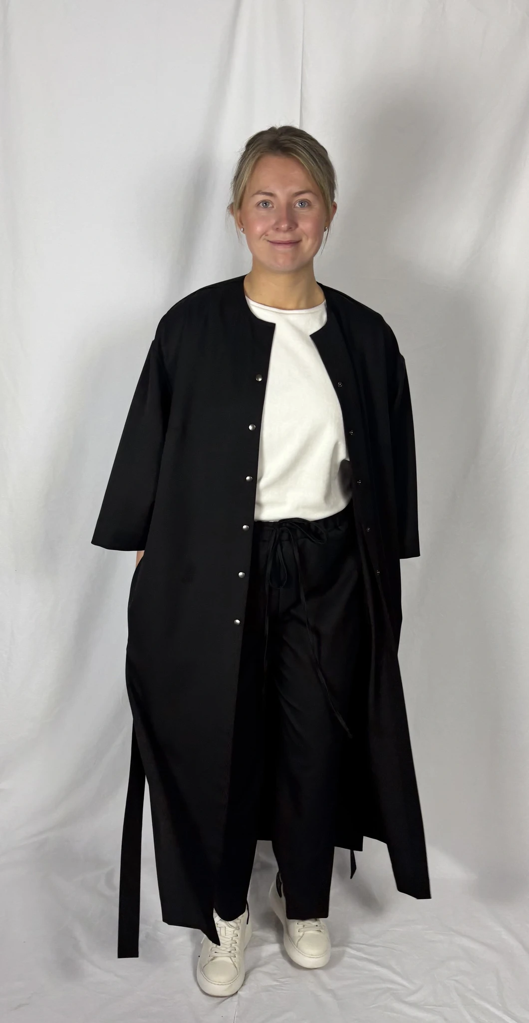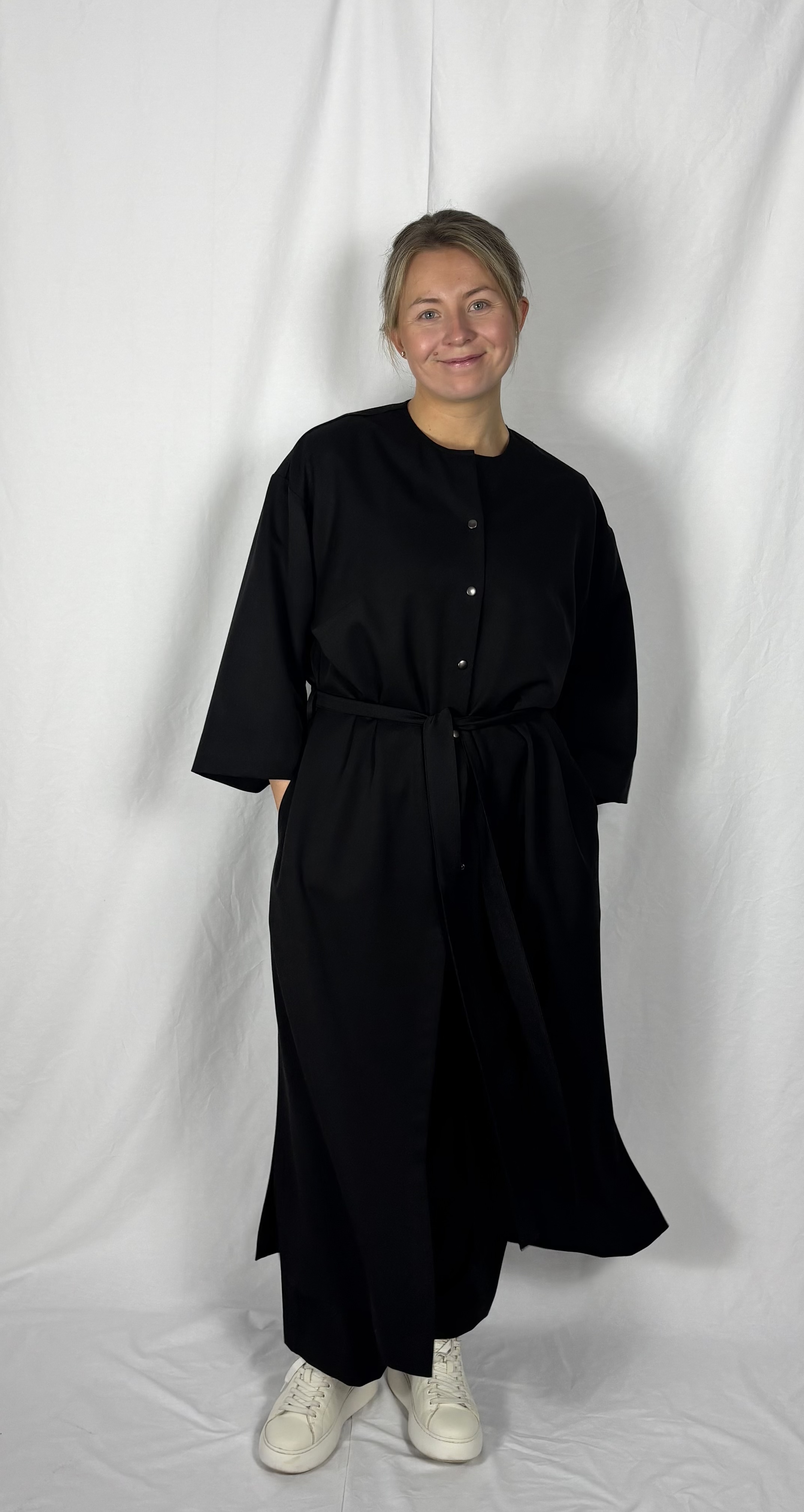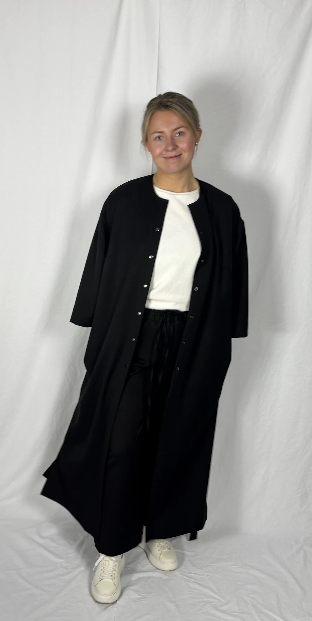 Modellil on seljas musta värvi pikk jakk, suurus M. Piltidel värvid -