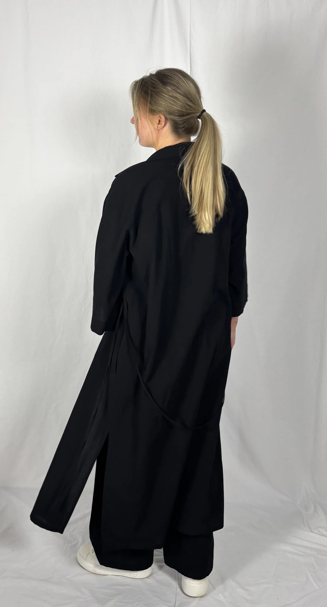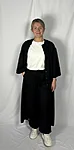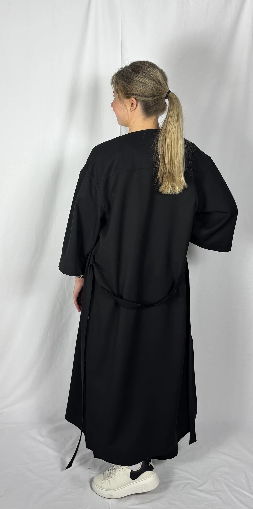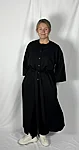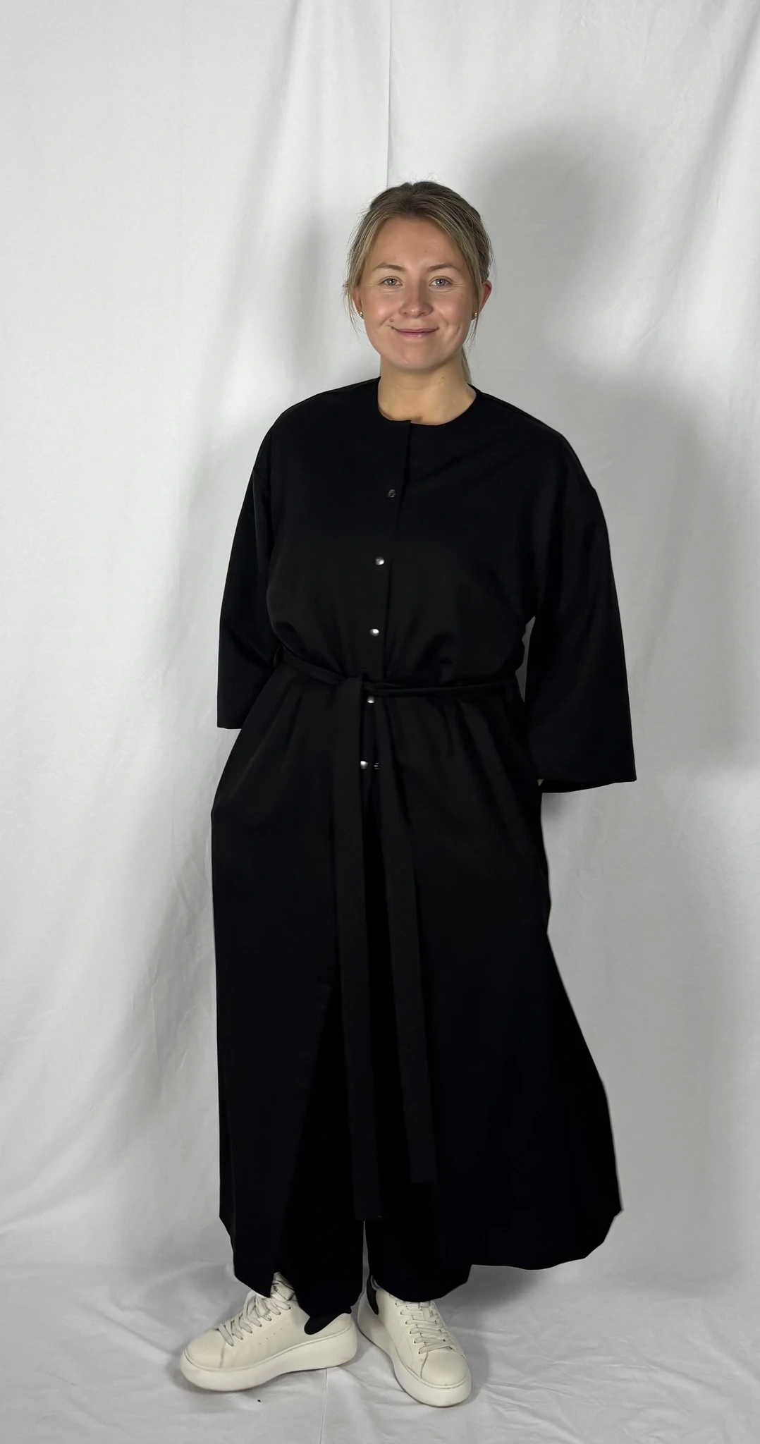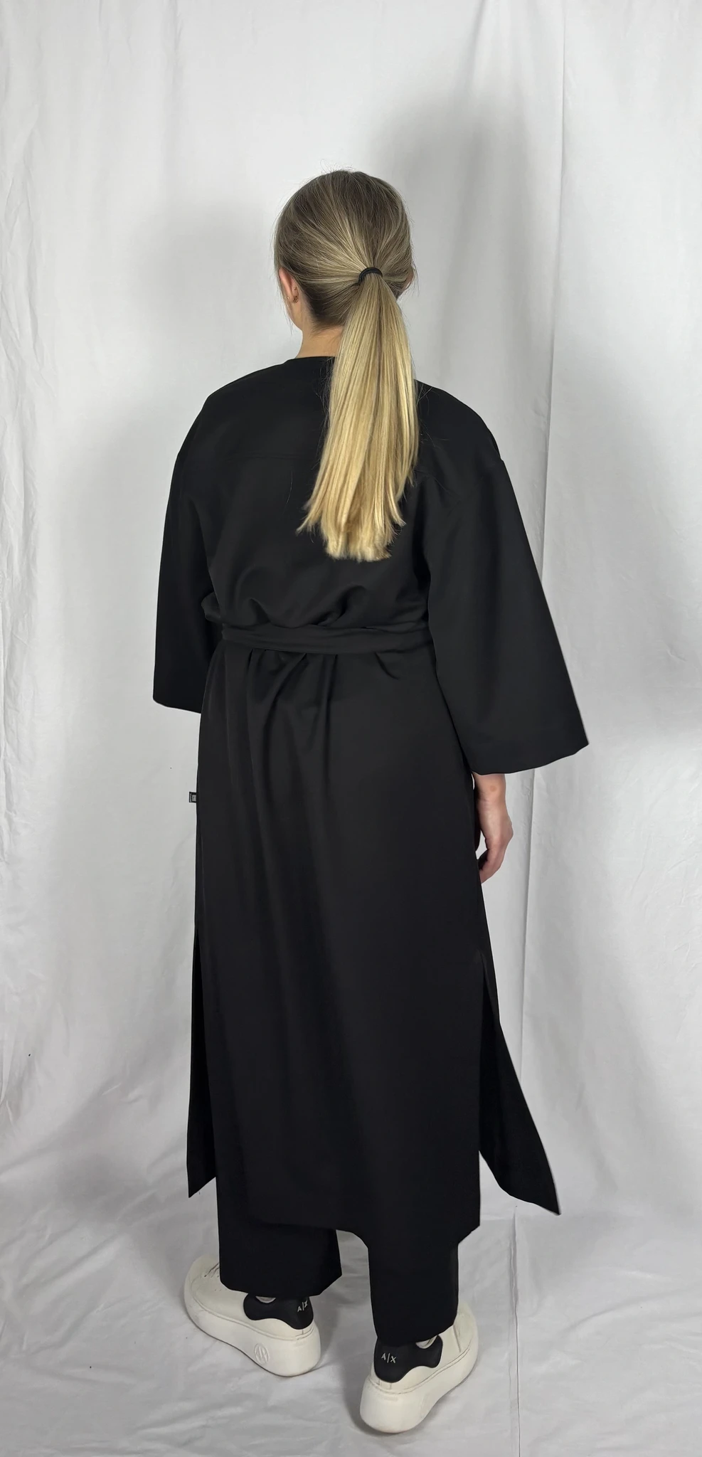Modellil on seljas musta värvi pikk jakk, suurus M. Piltidel värvid -