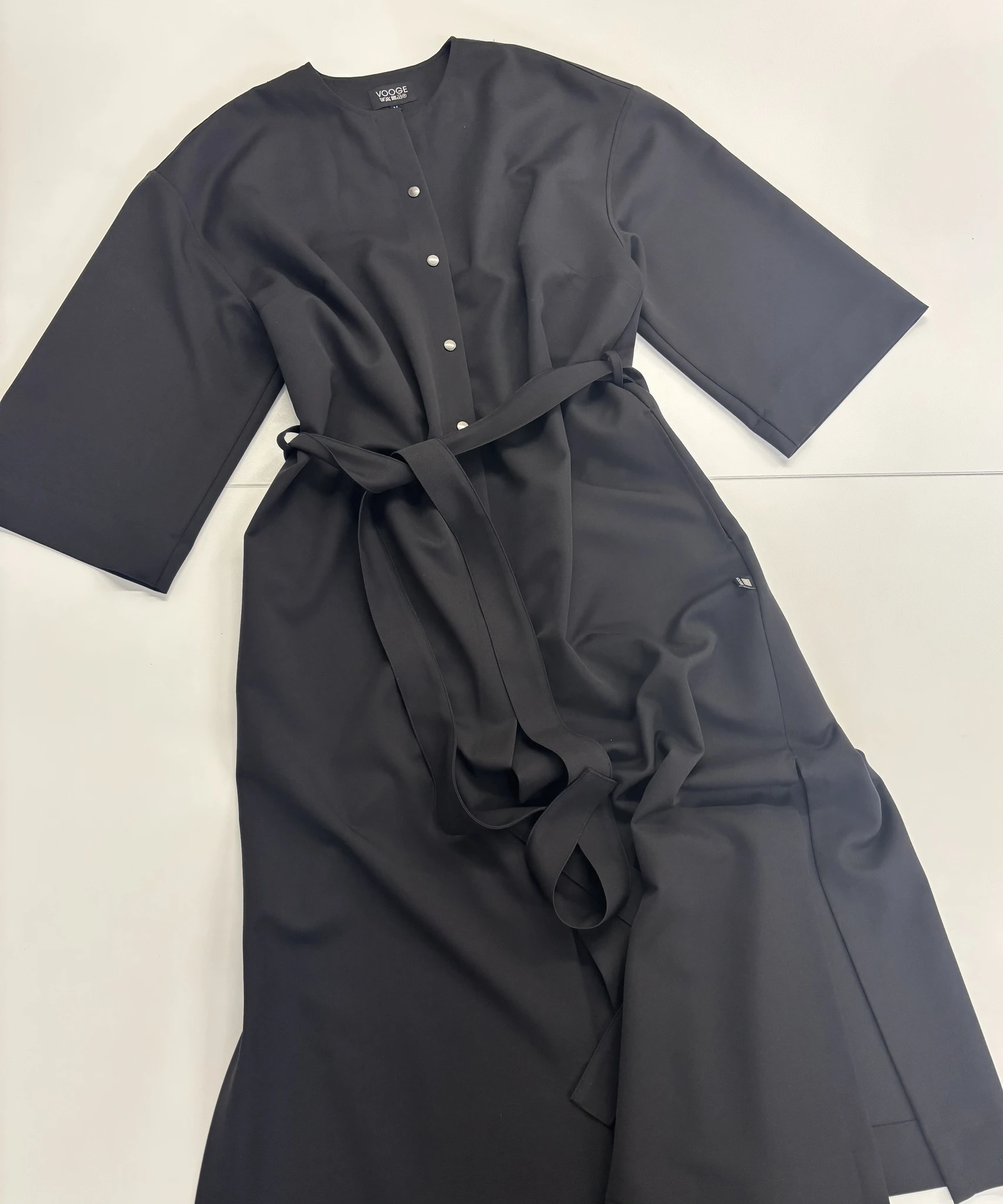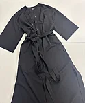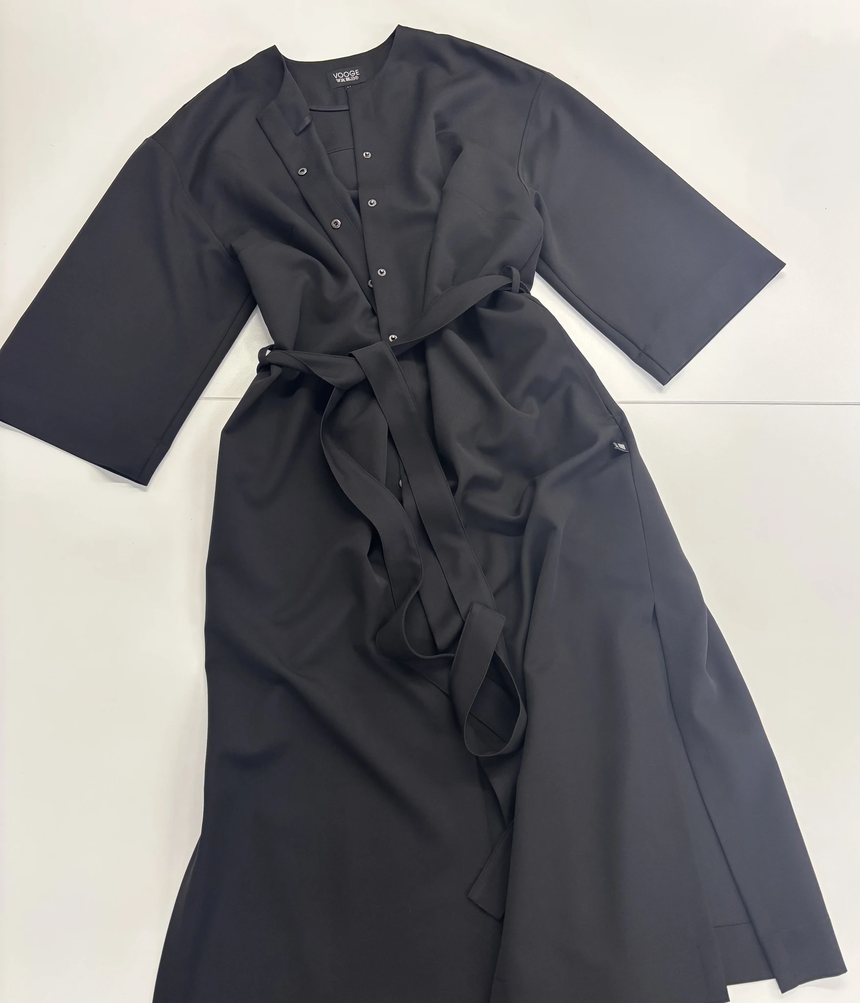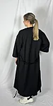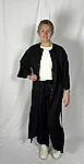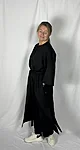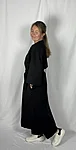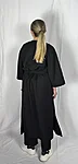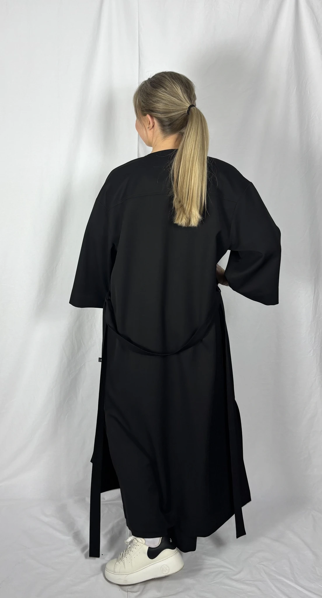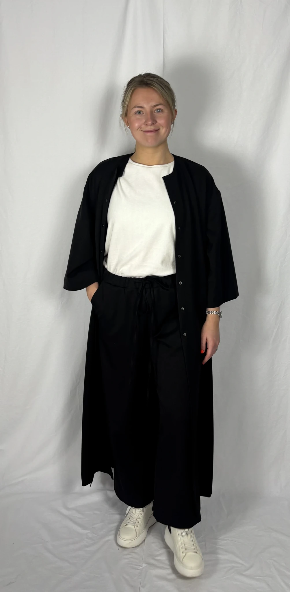 Modellil on seljas musta värvi pikk jakk, suurus M. Piltidel värvid -