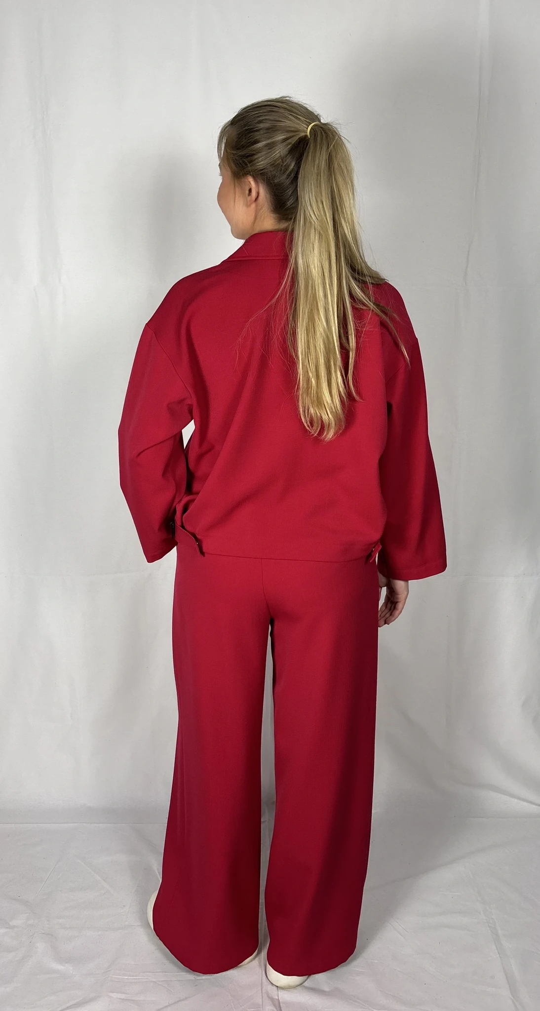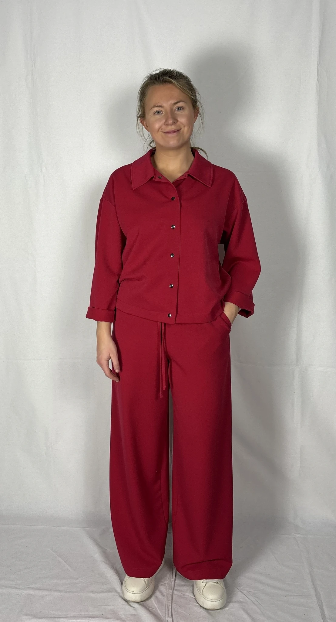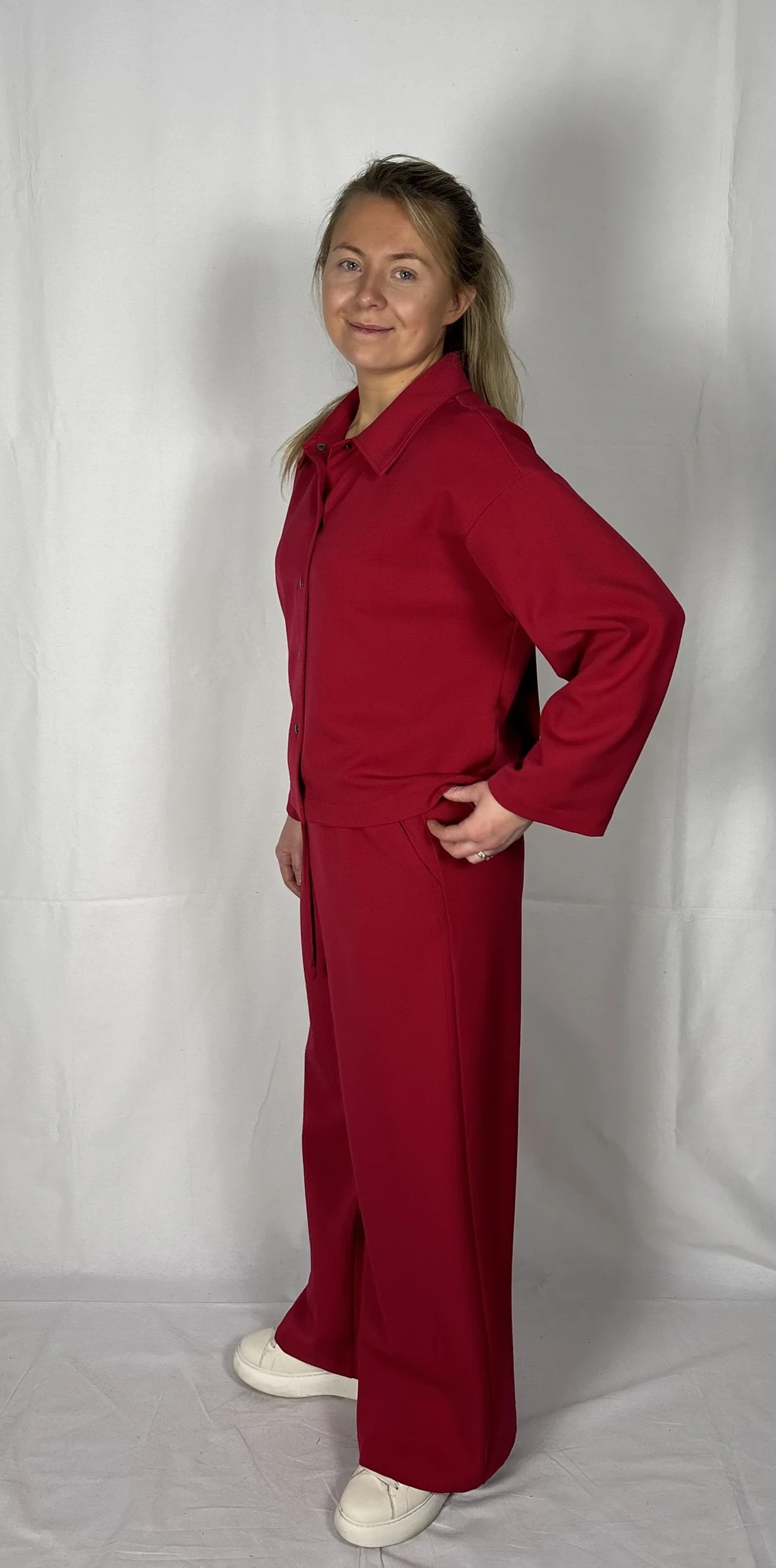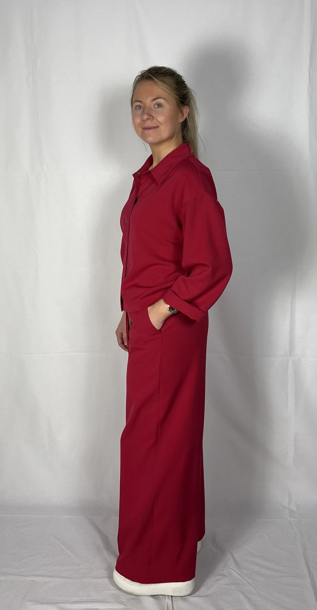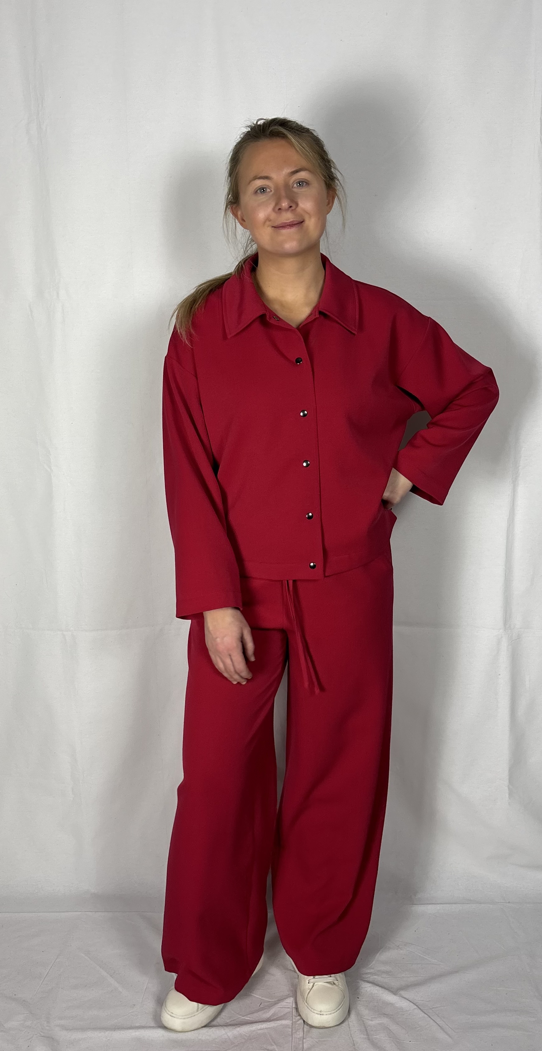 Modellil on seljas punast värvi särk/jakk, suurus S. PILTIDEL VÄRVID -