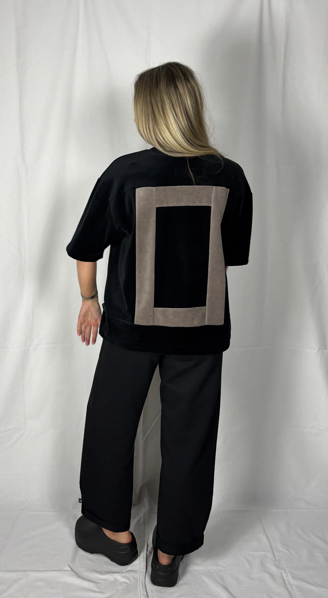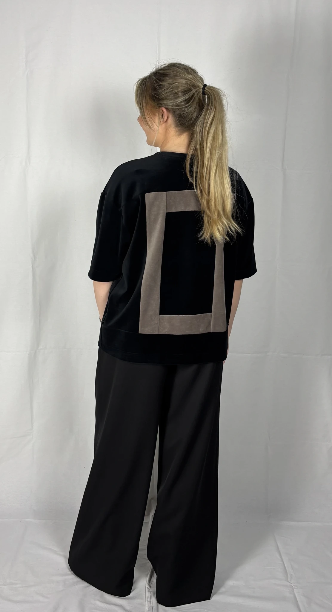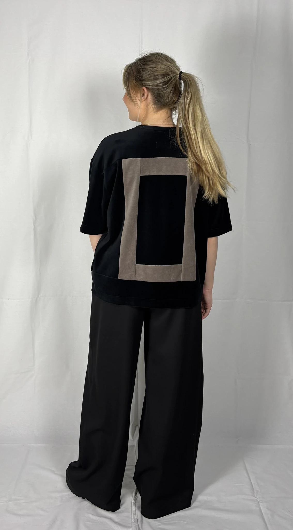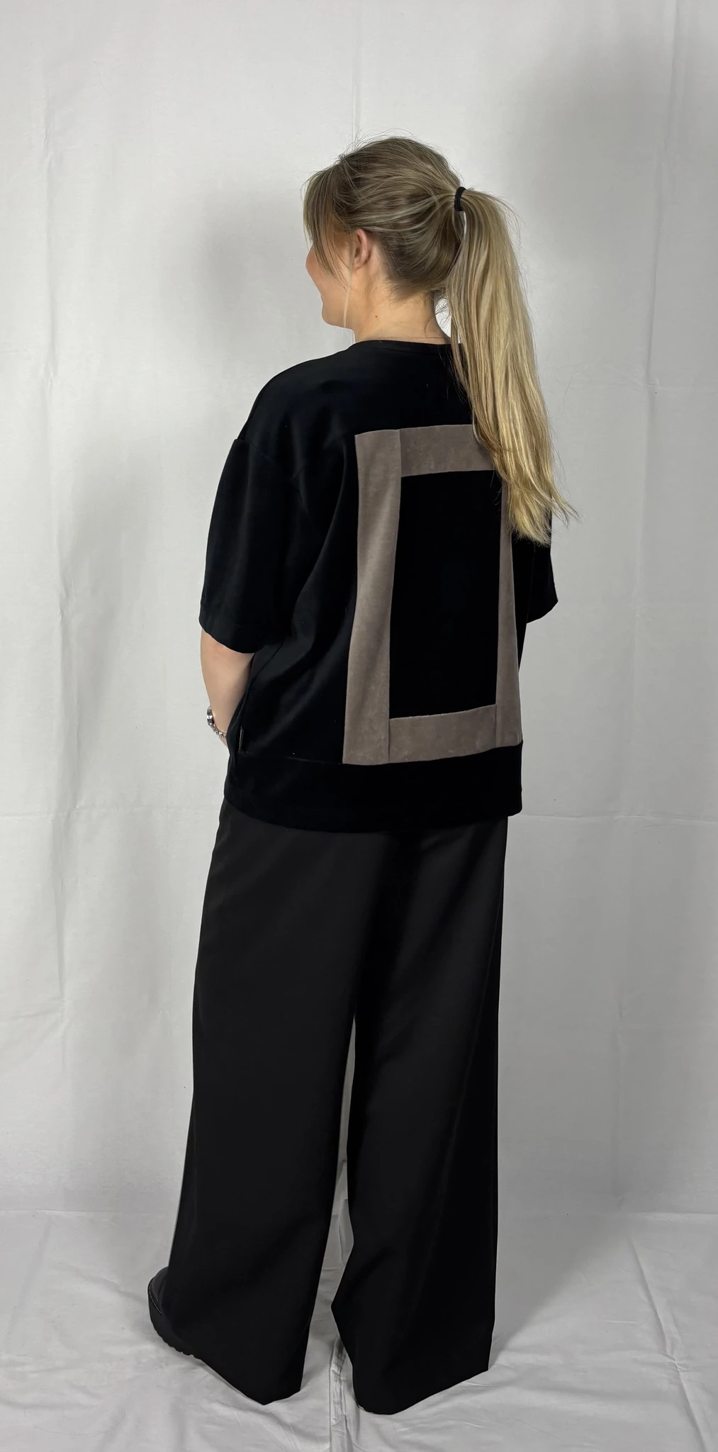 Modellil on seljas musta värvi särk, suurus S. Lisadetail taupe värvi. Piltidel värvid -