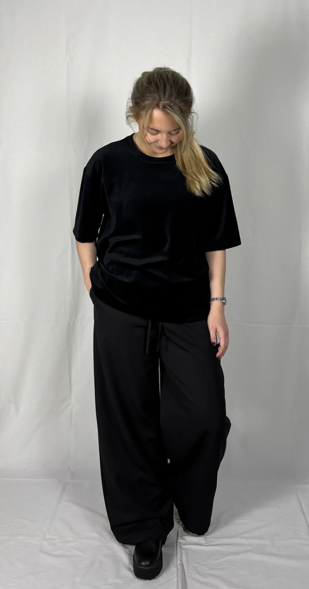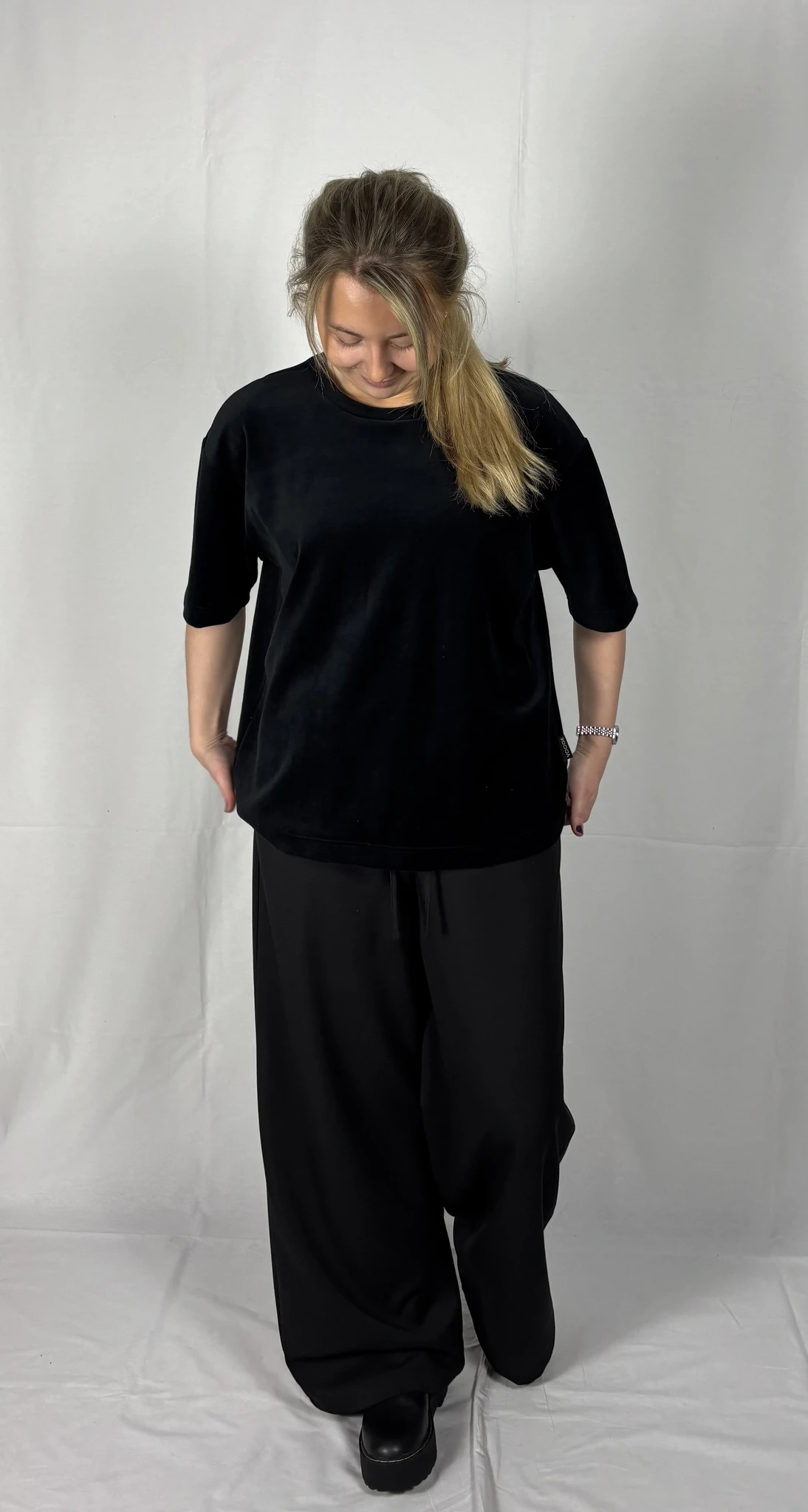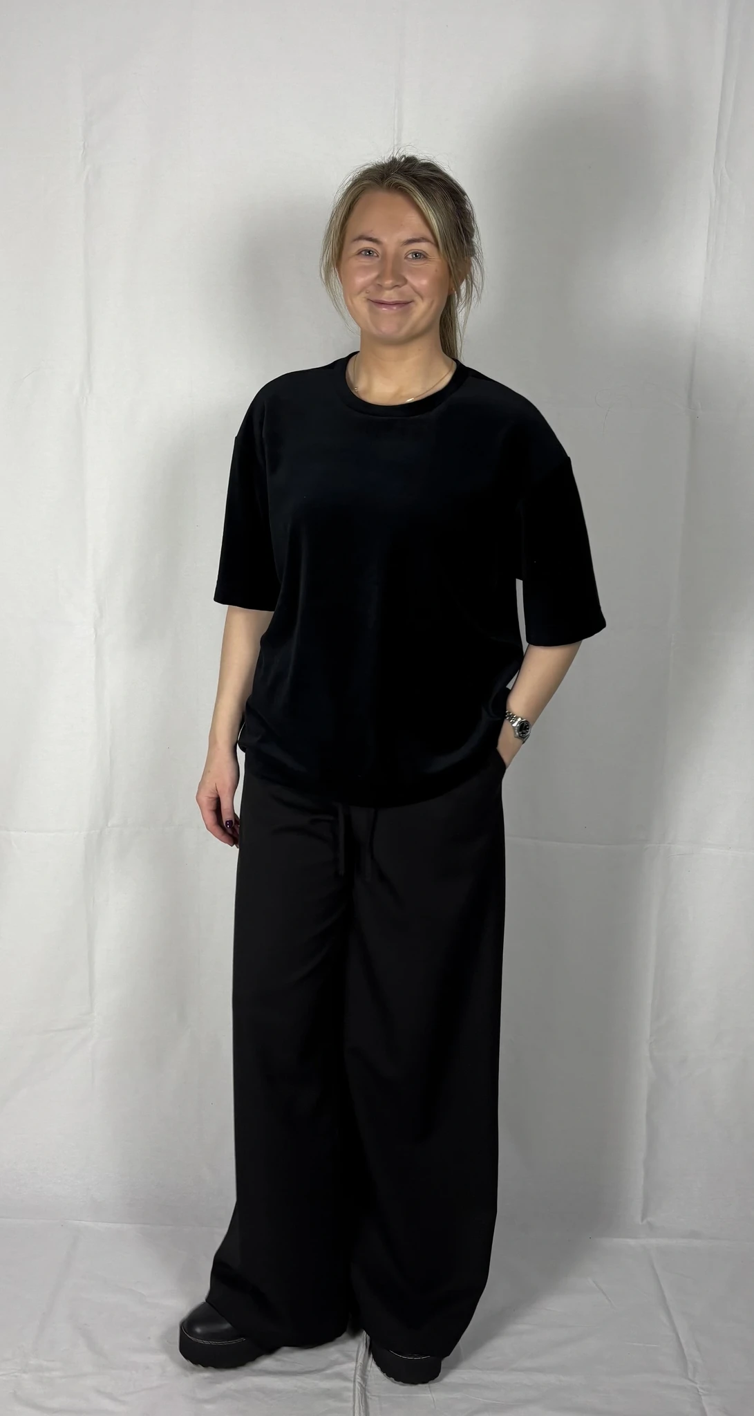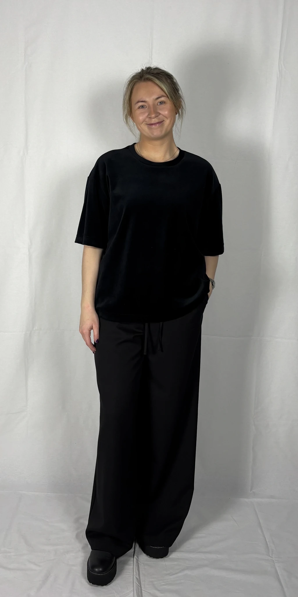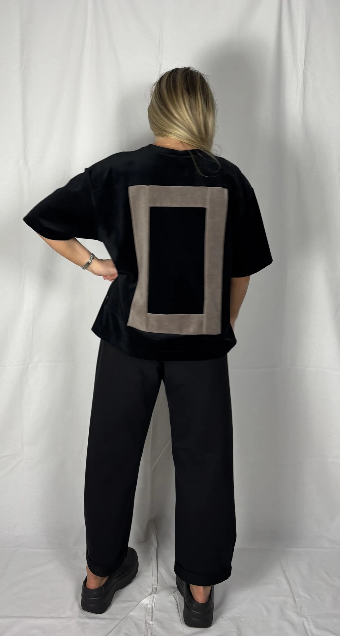 Modellil on seljas musta värvi särk, suurus S. Lisadetail taupe värvi. Piltidel värvid -
