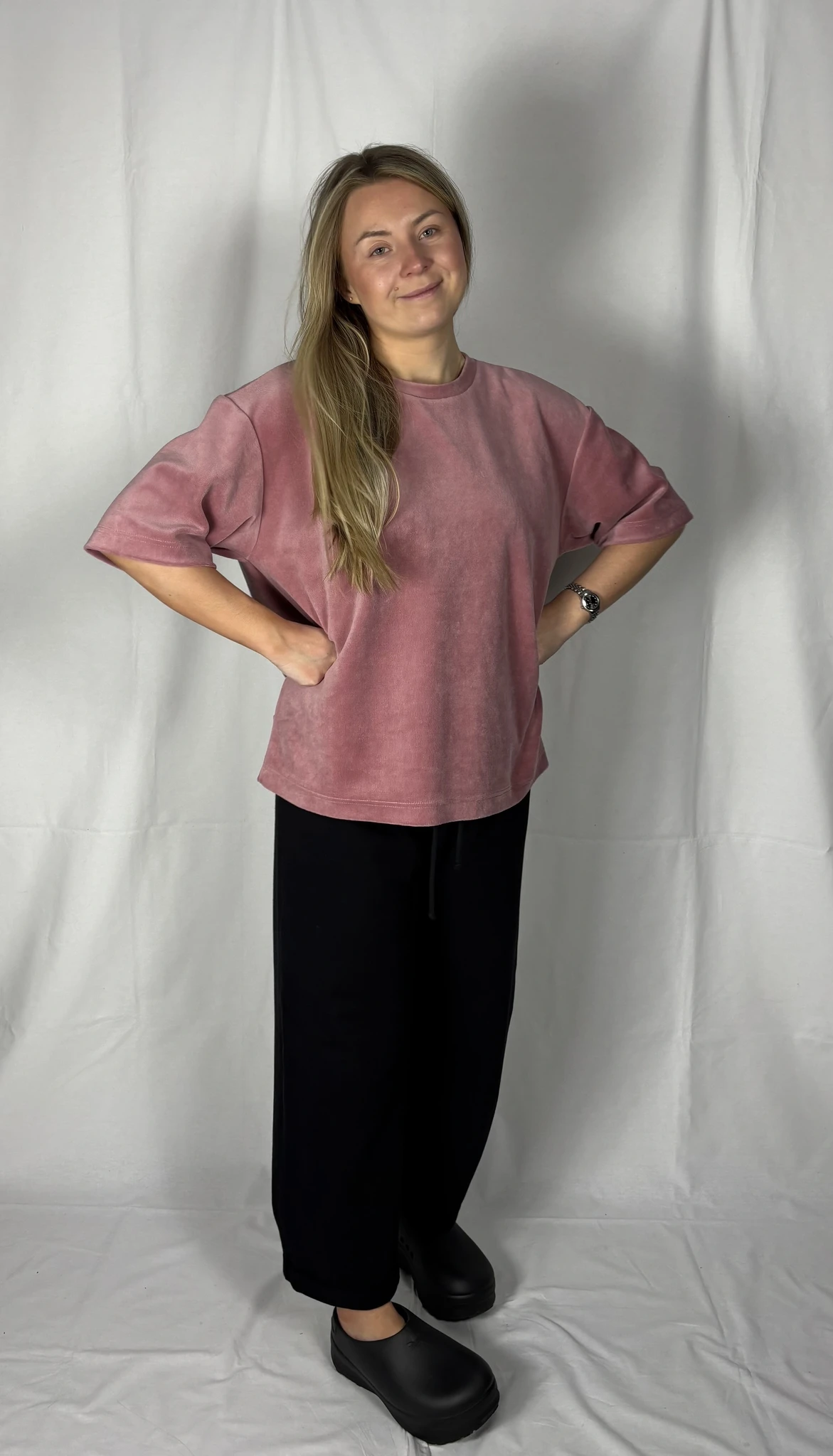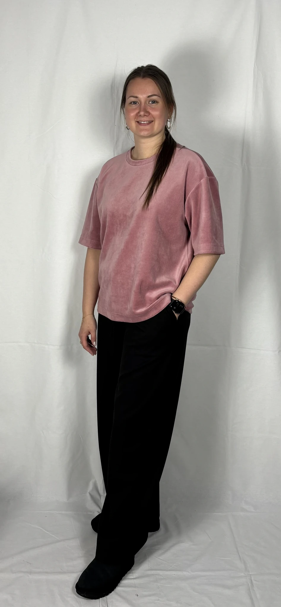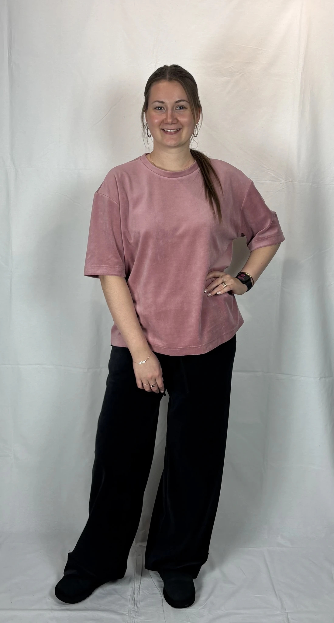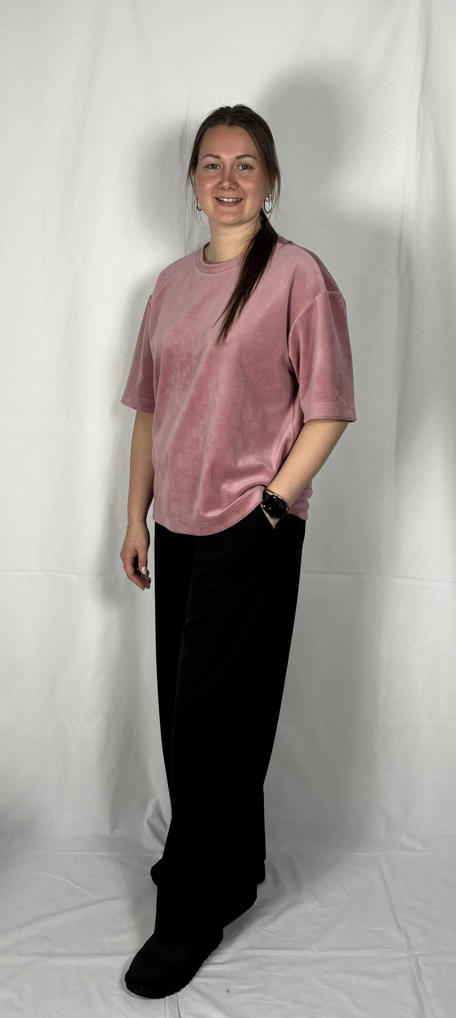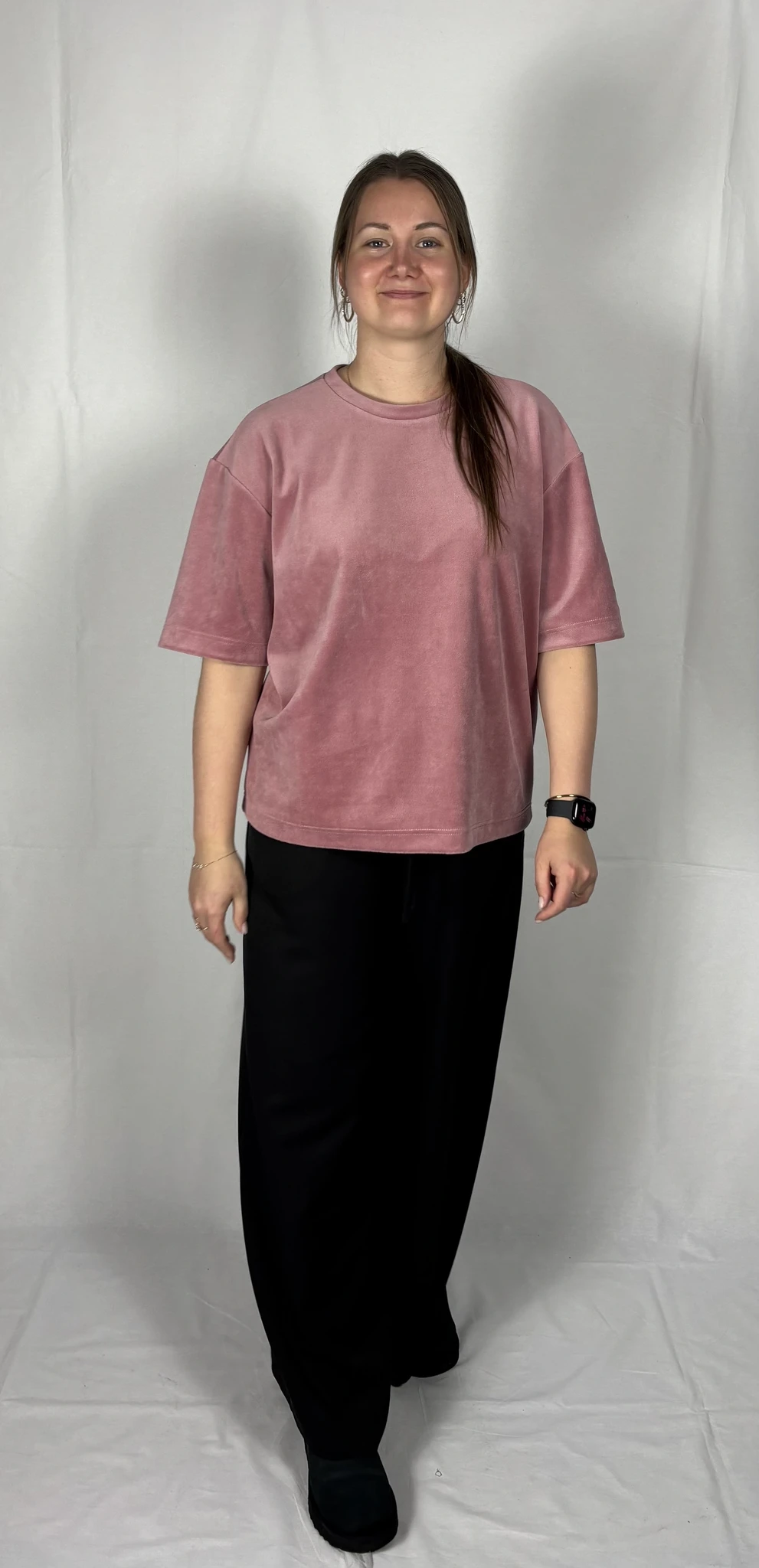 Modellil on seljas vanaroosat värvi särk, suurus S, musta värvi lisandiga.Piltidel värvid -