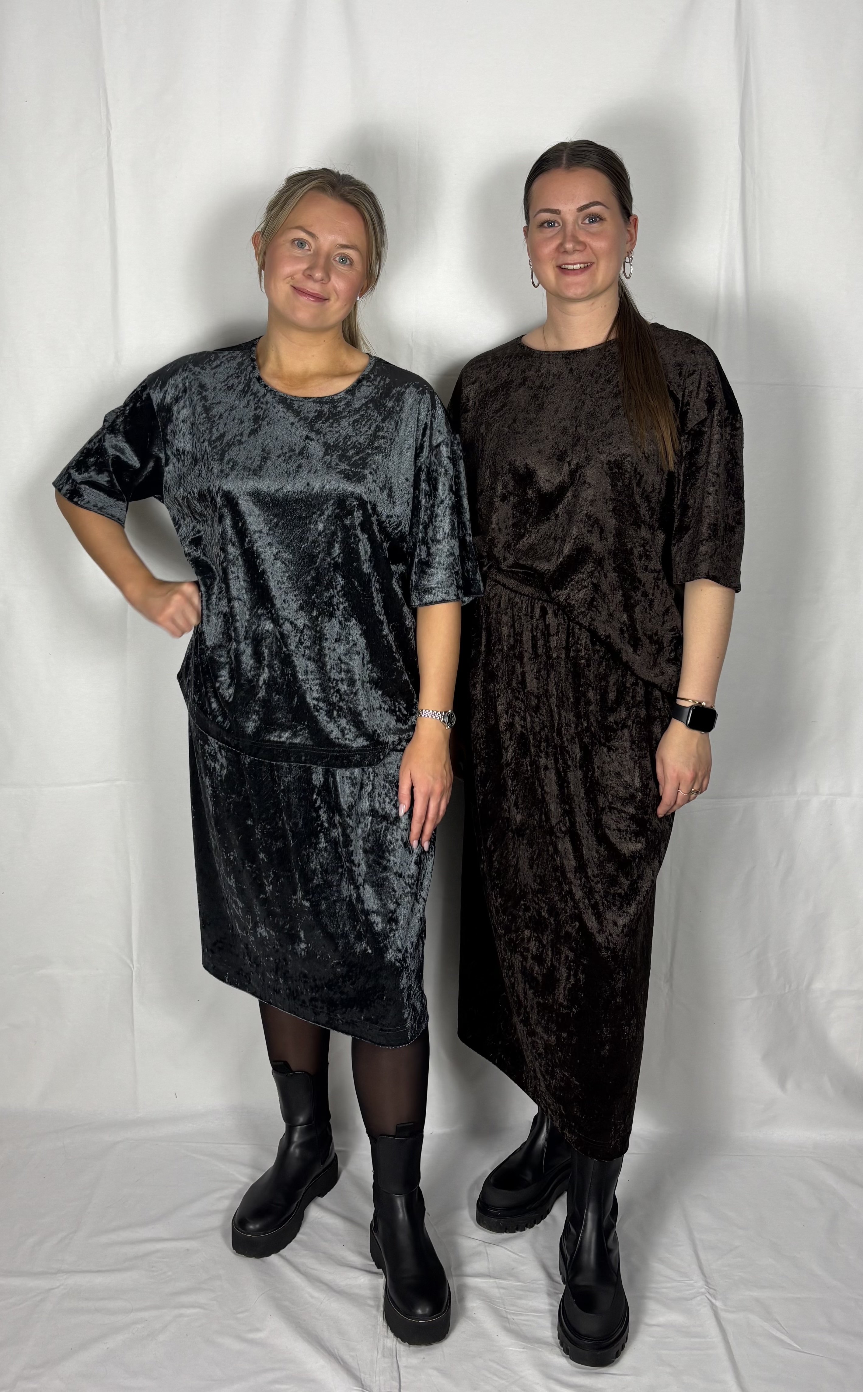 Modellil on seljas tumepruuni värvi särk, suurus M ja tumehalli värvi särk suurus S. Piltidel värvid -