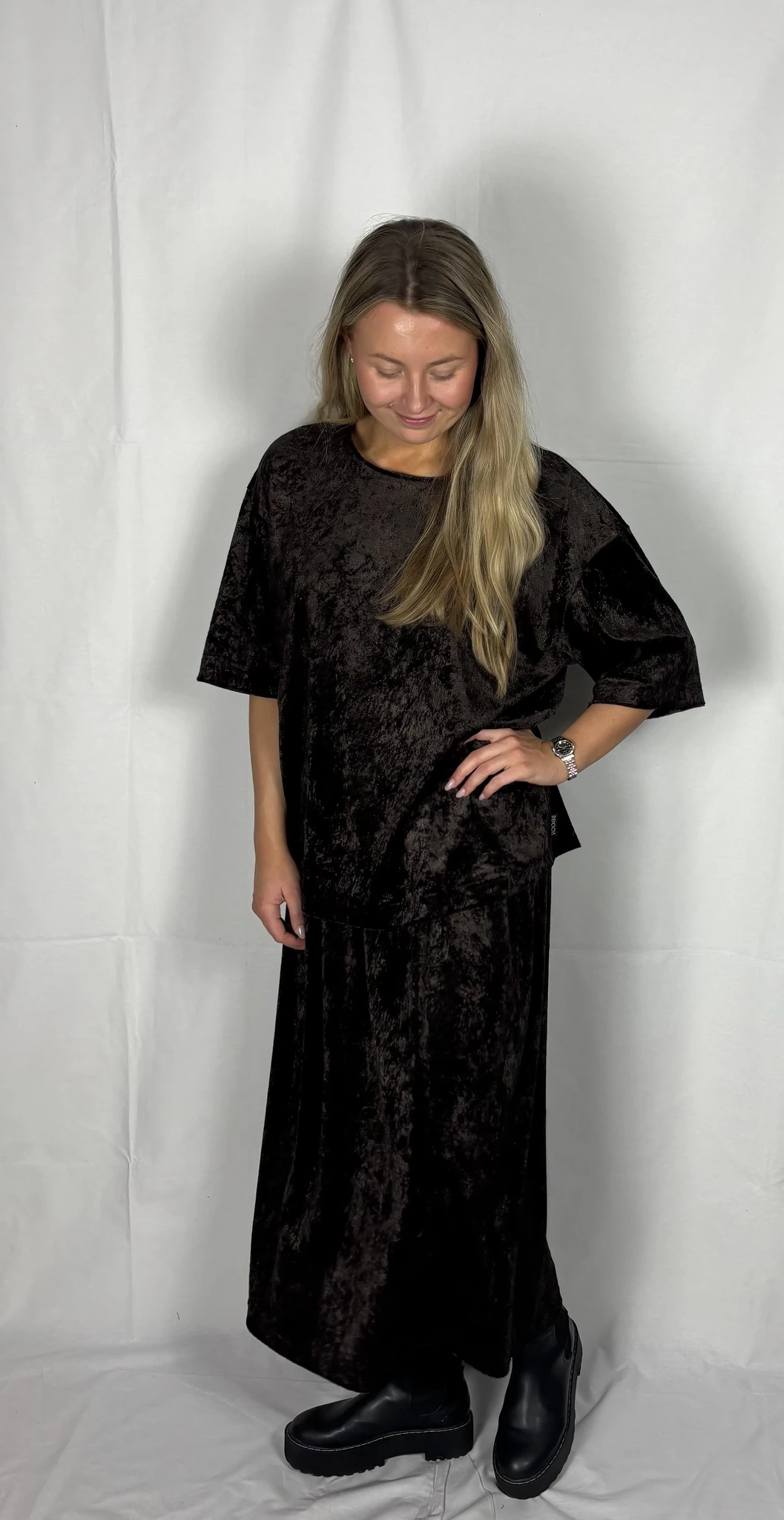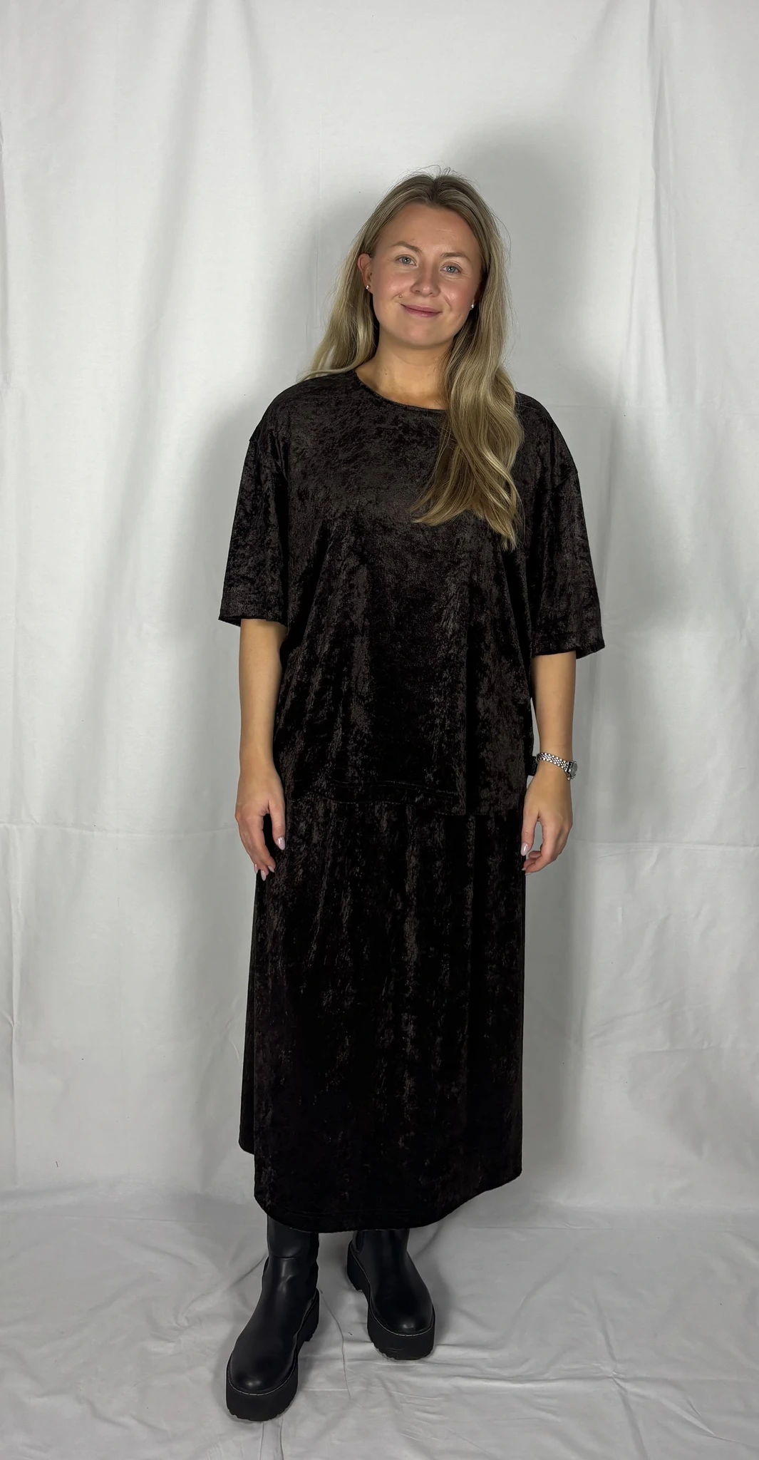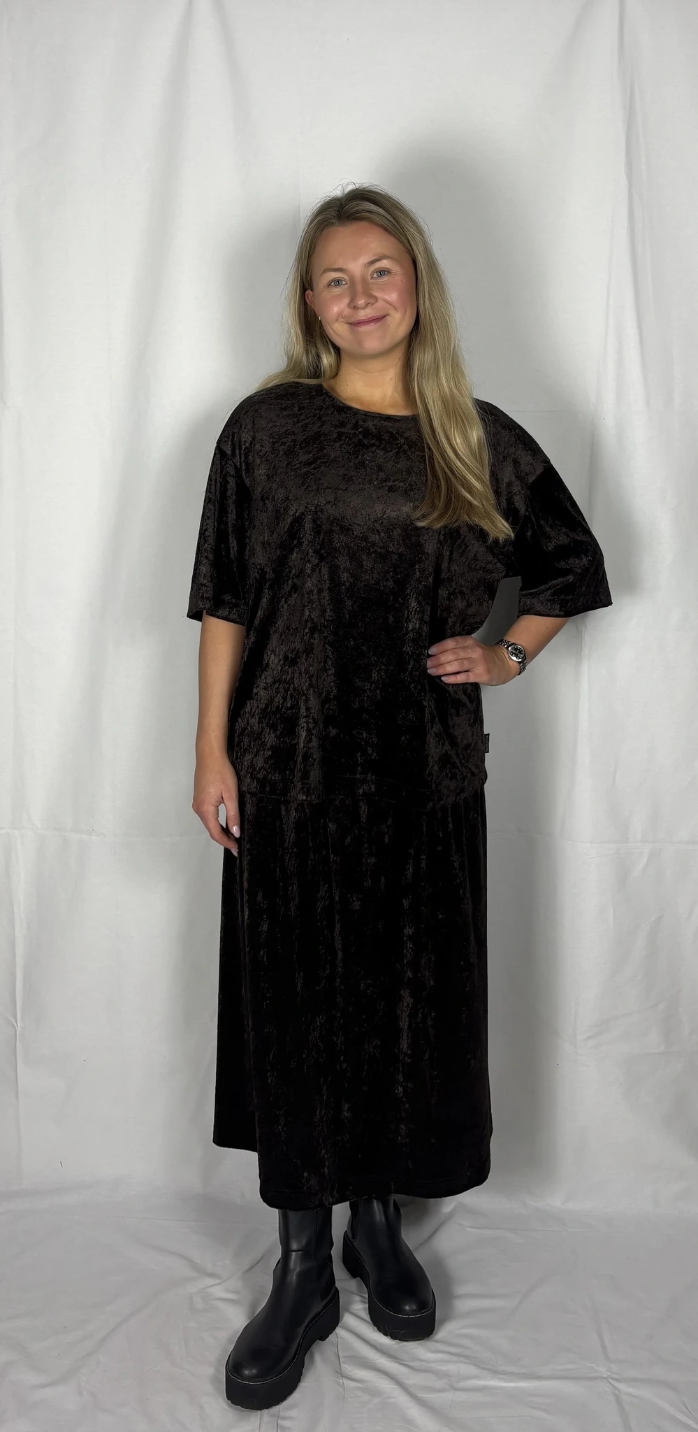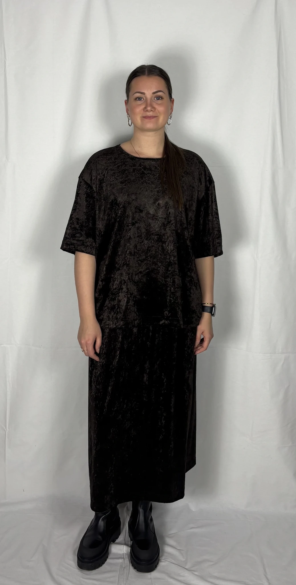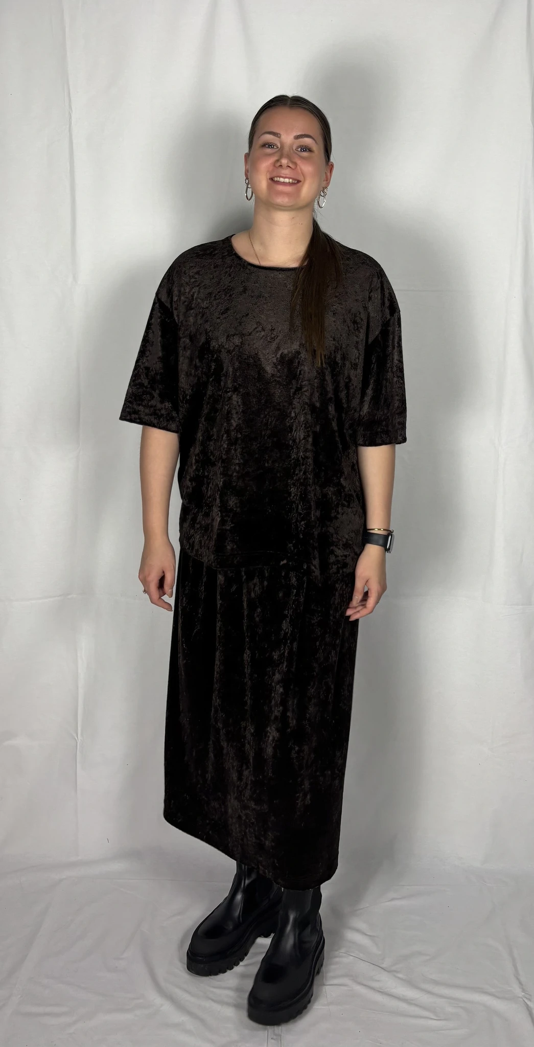 Modellil on seljas tumepruuni värvi seelik, suurus M. Modelli pikkus on 165 cm.
