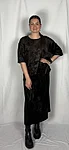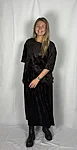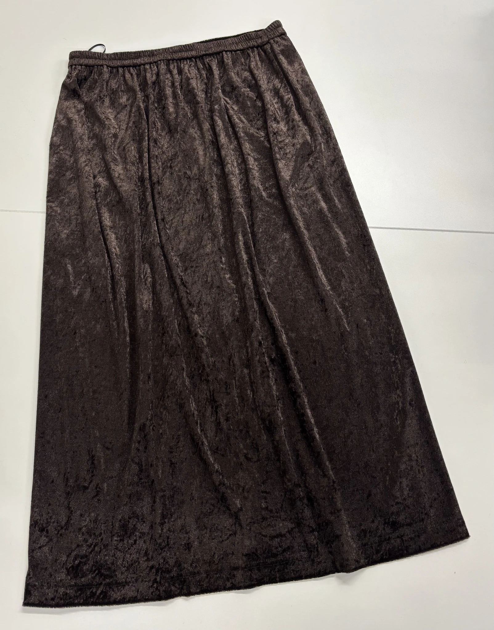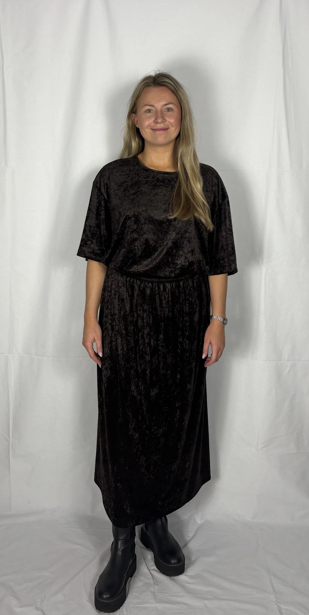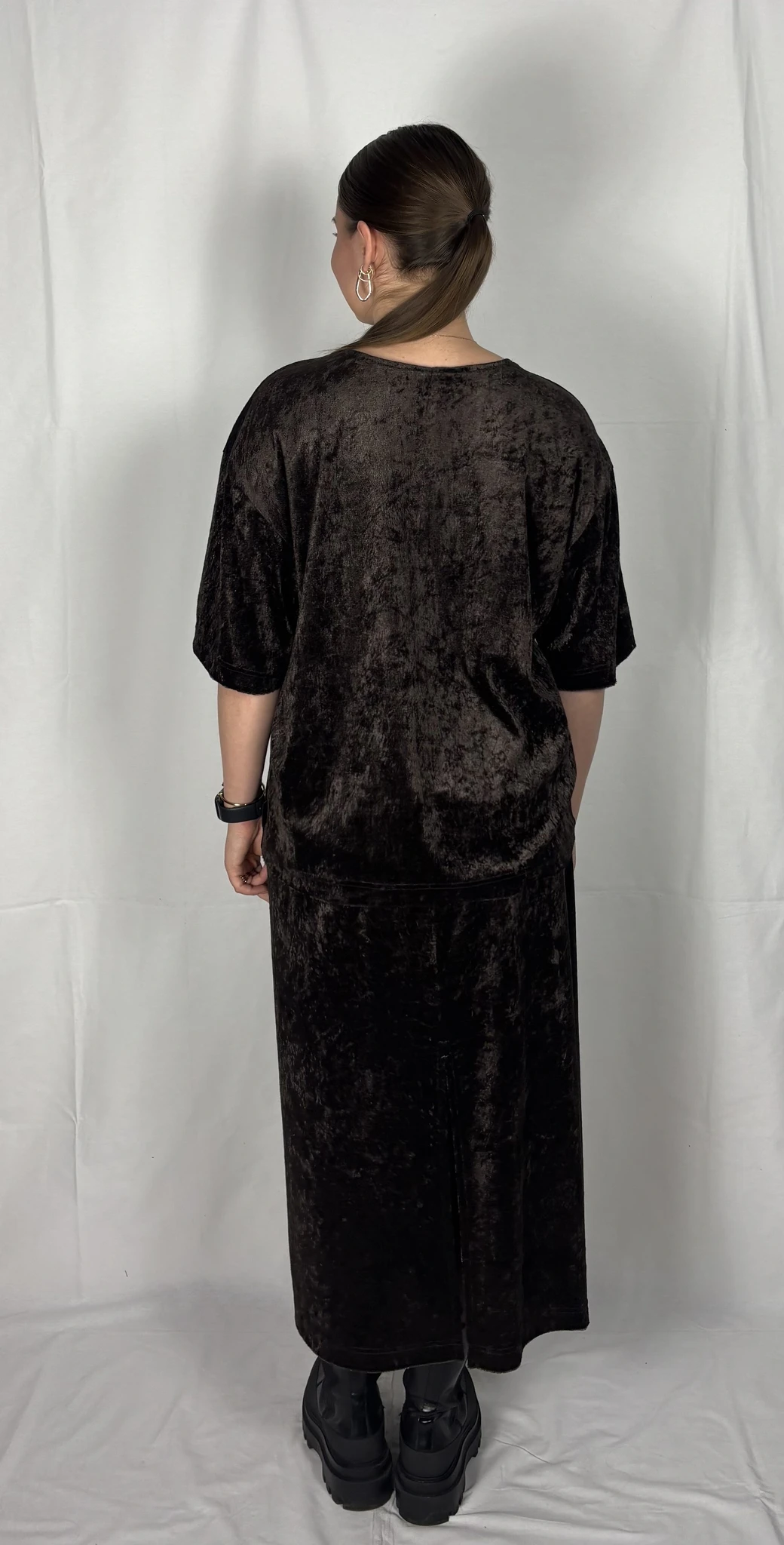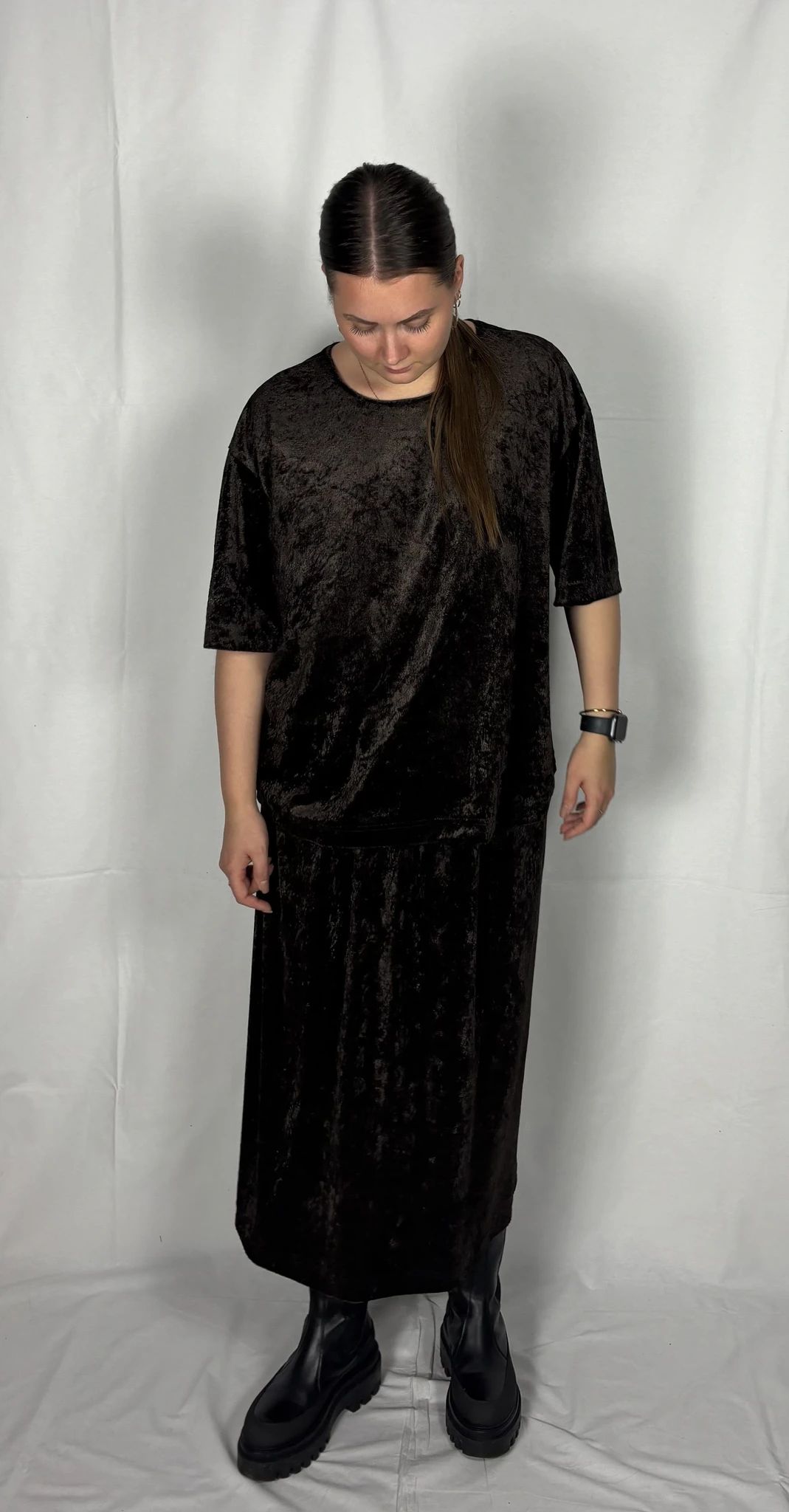 Modellil on seljas tumepruuni värvi seelik, suurus M. Modelli pikkus on 165 cm.