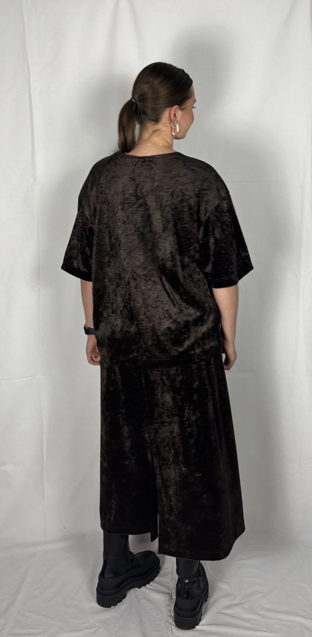Modellil on seljas tumepruuni värvi seelik, suurus M. Piltidel värvid -