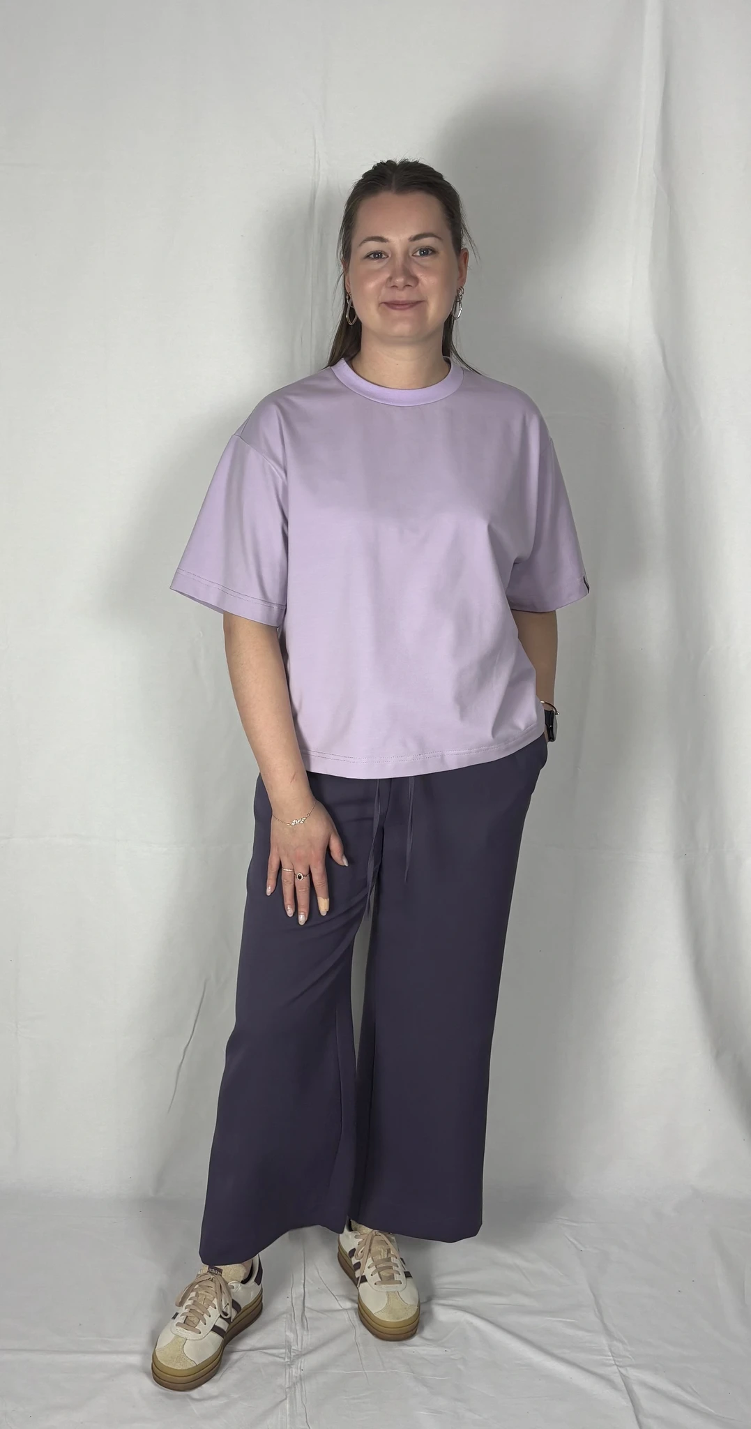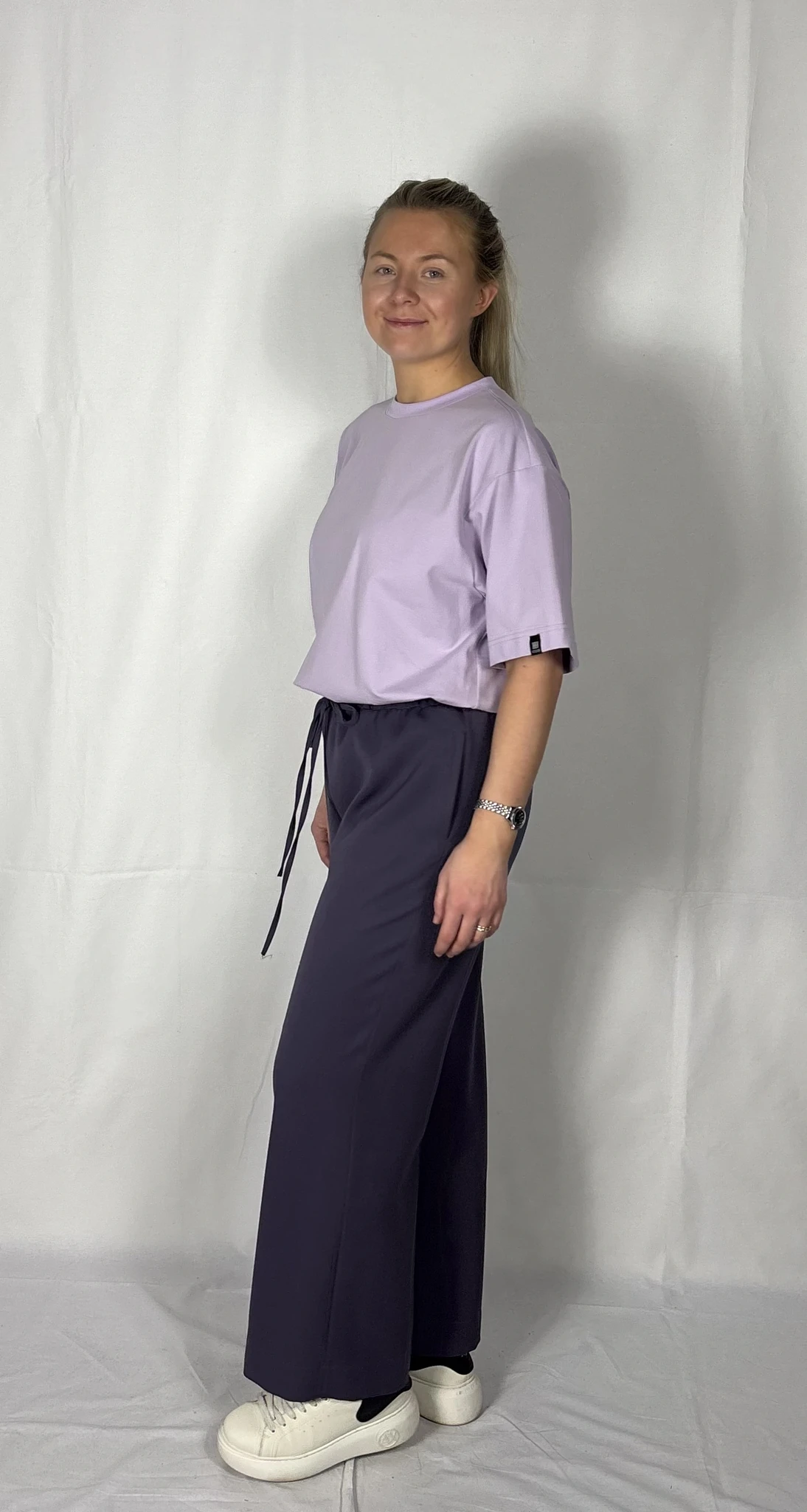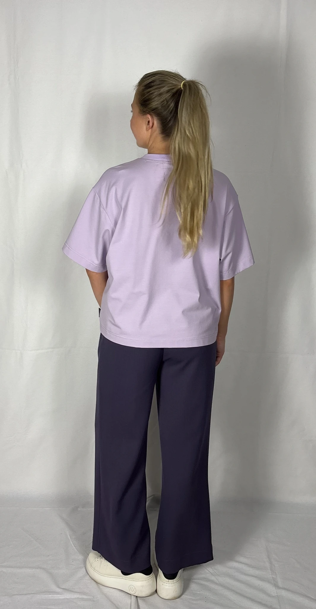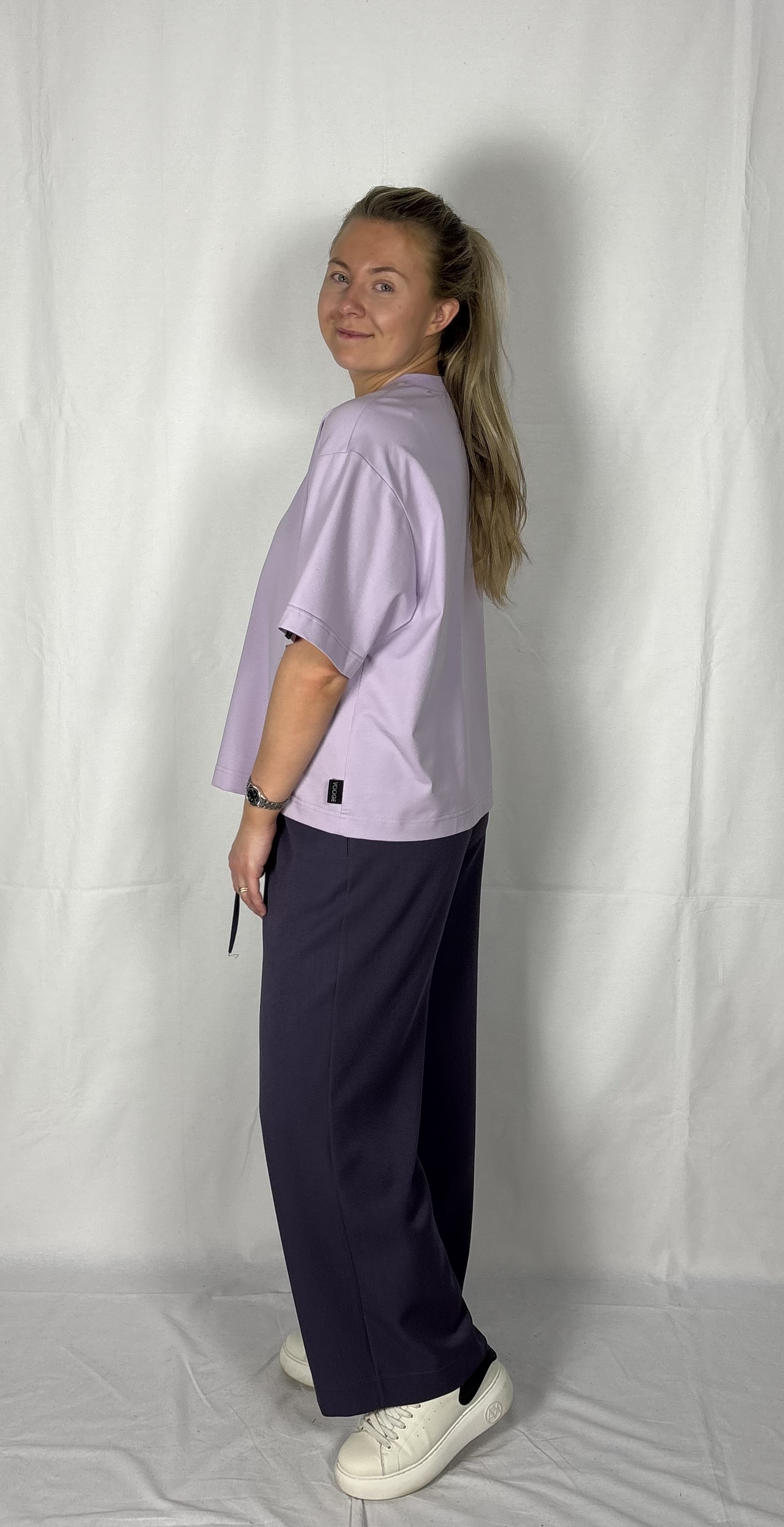 Modellil on seljas musta värvi T-särk,suurus M ja helelillat värvi särk, suurus M.