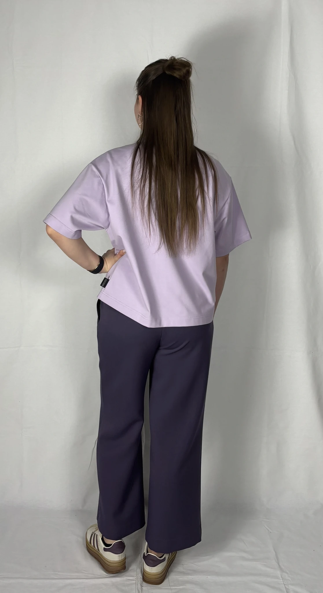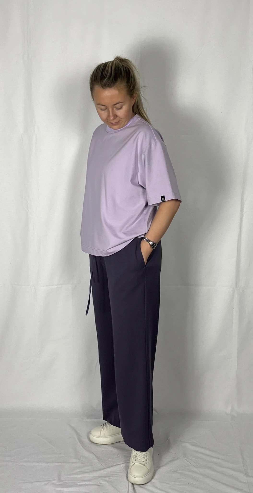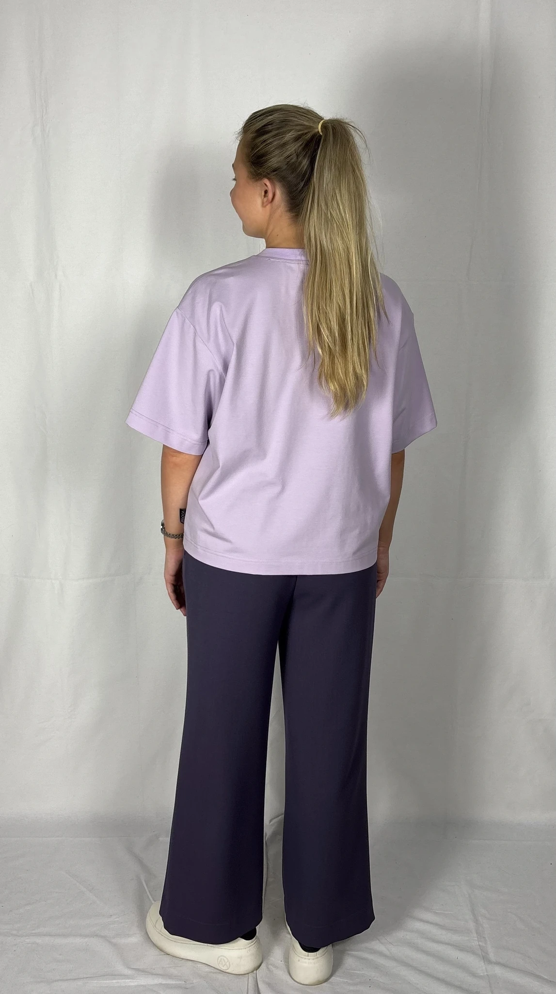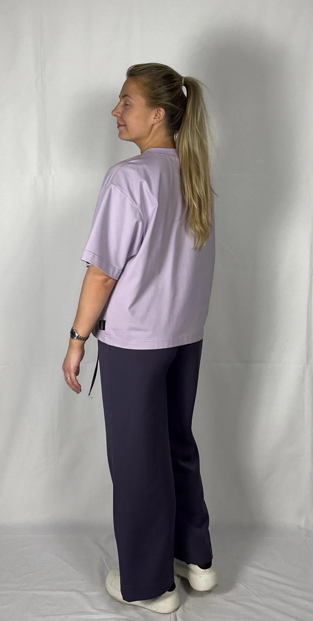 Modellil on seljas musta värvi T-särk,suurus M ja helelillat värvi särk, suurus M.
