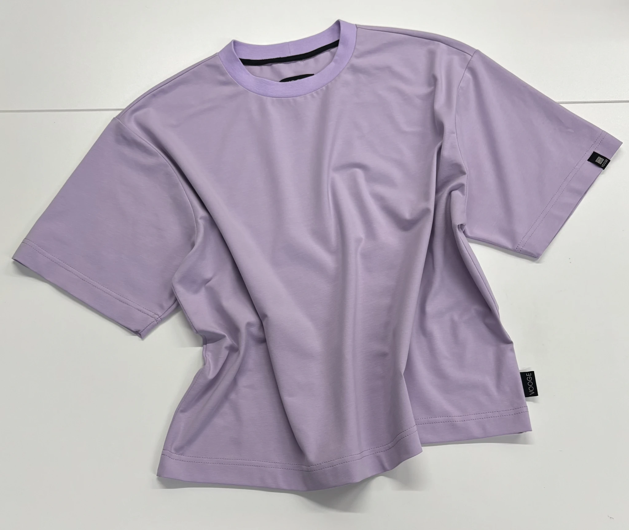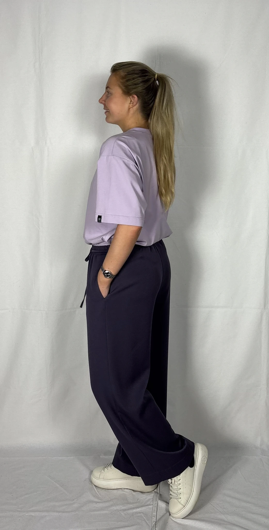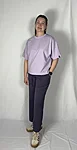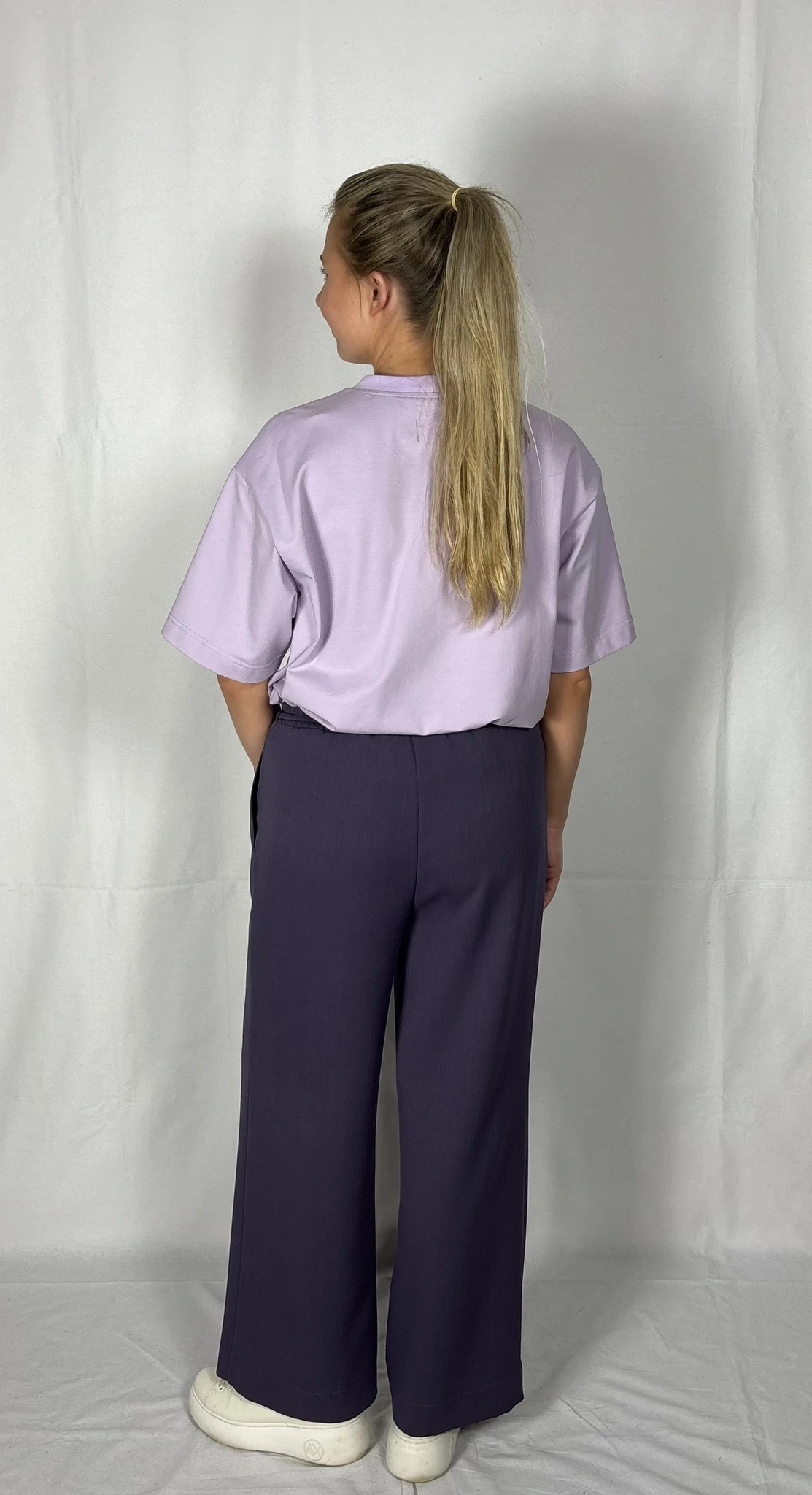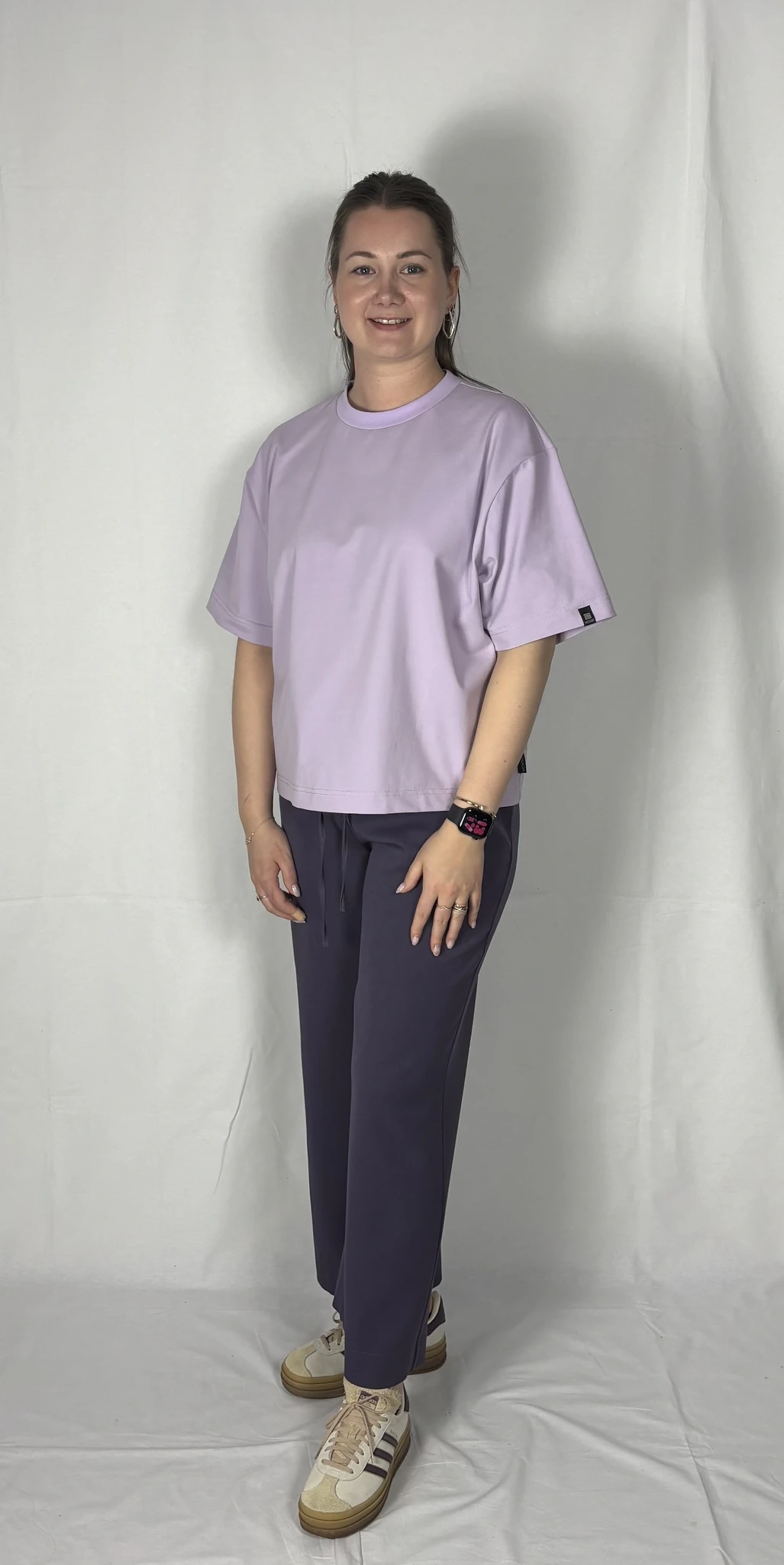 Modellil on seljas musta värvi T-särk,suurus M ja helelillat värvi särk, suurus M.