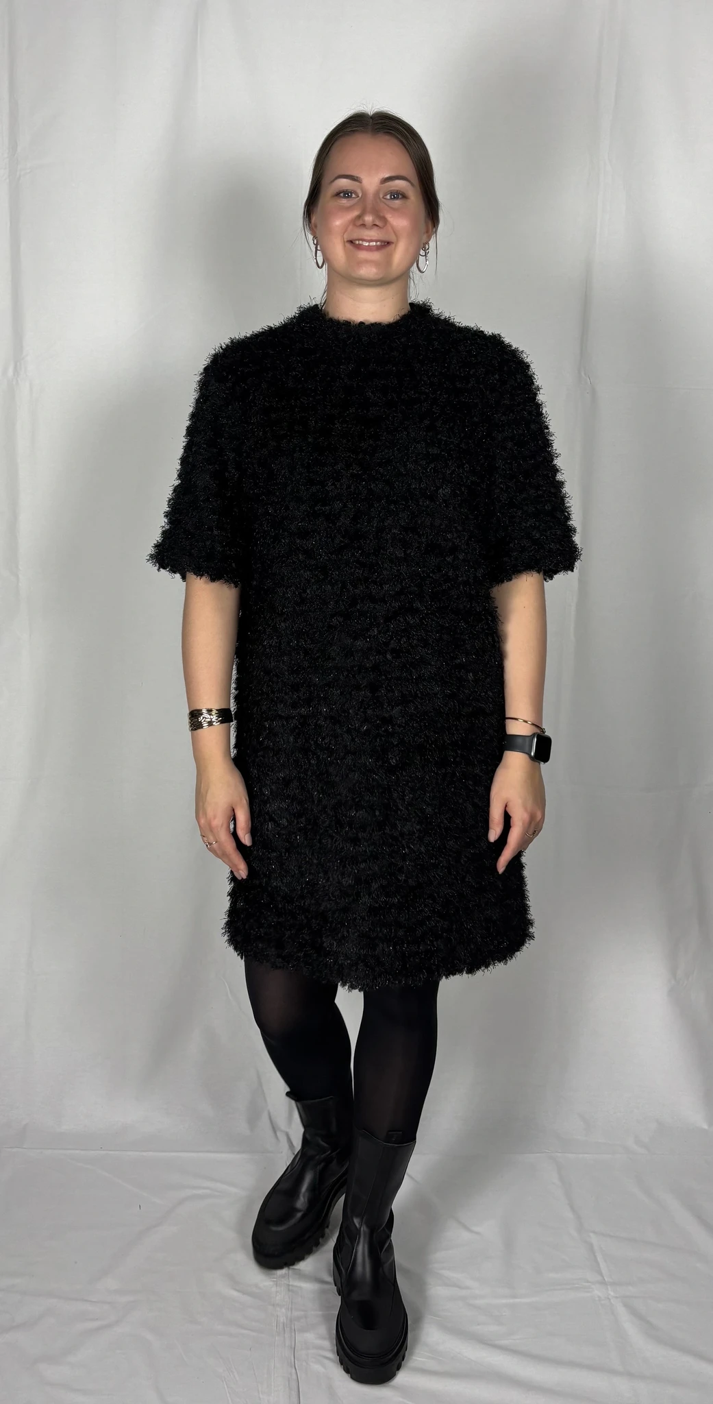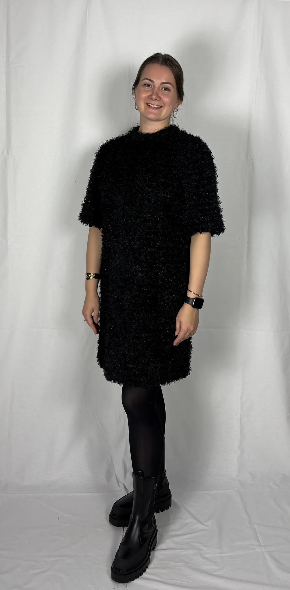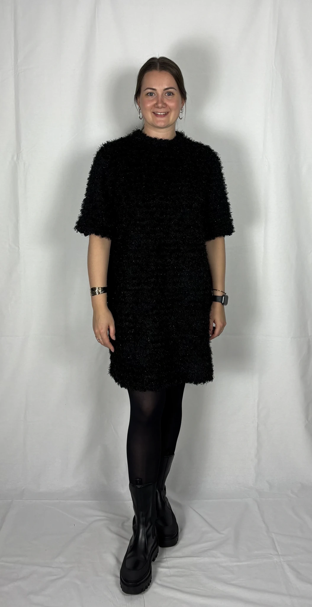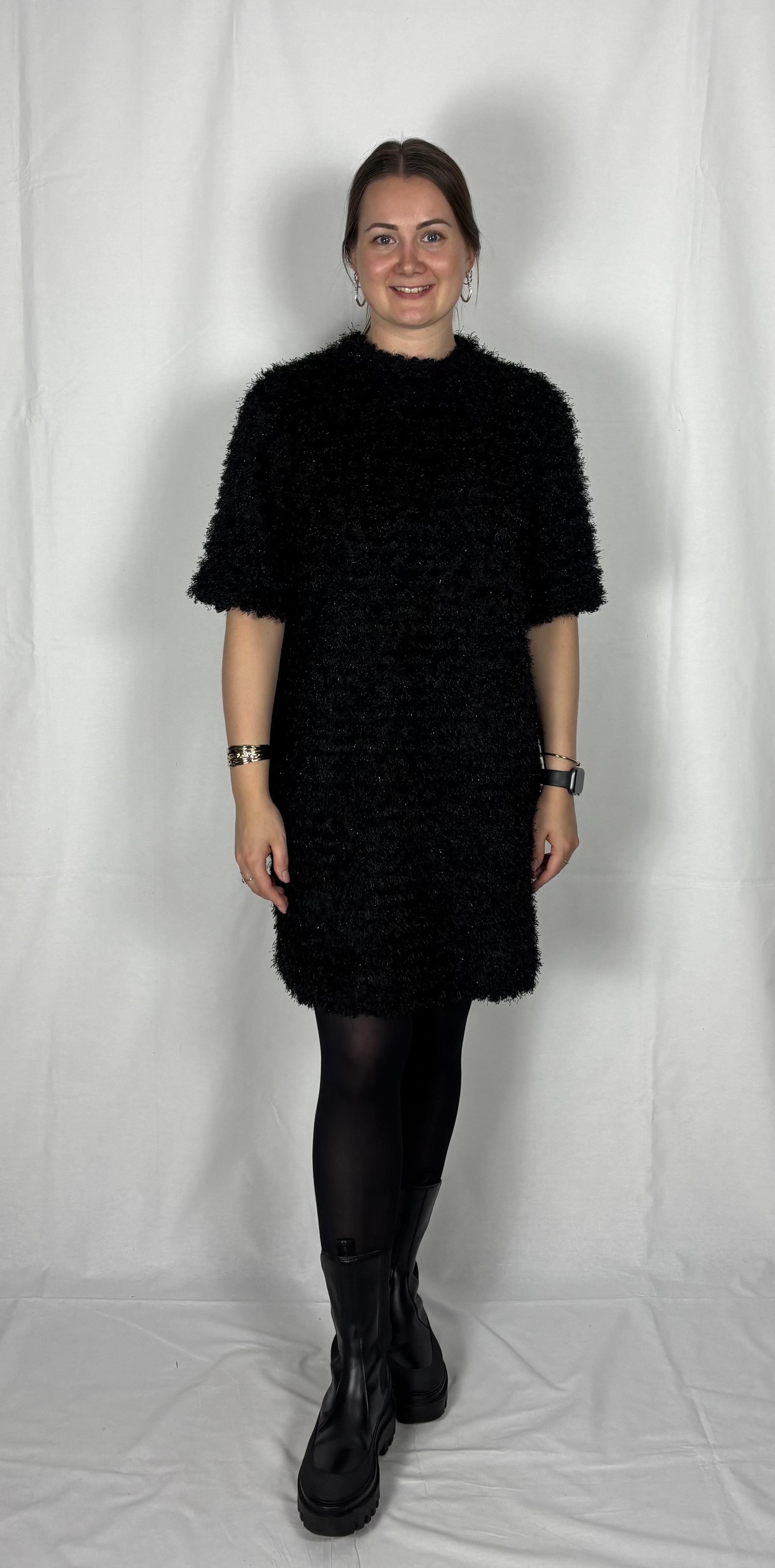 Modellil on seljas musta värvi S suuruses kleit. Modelli pikkus on 169 cm.
