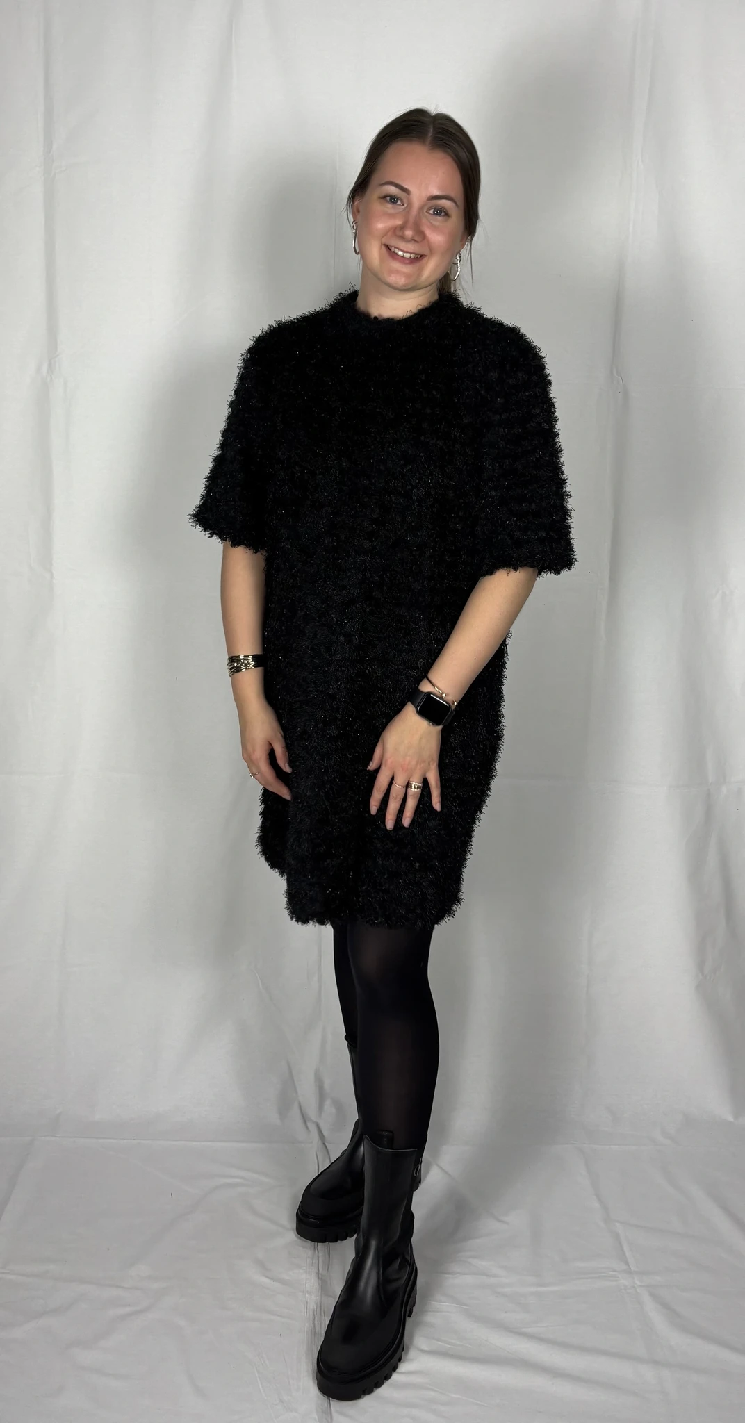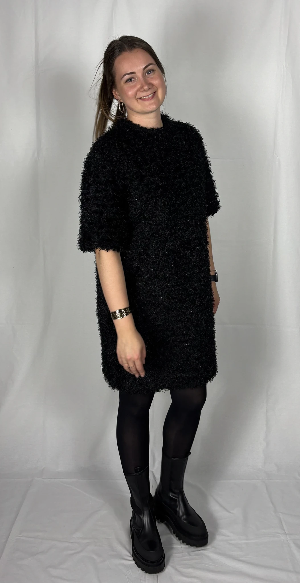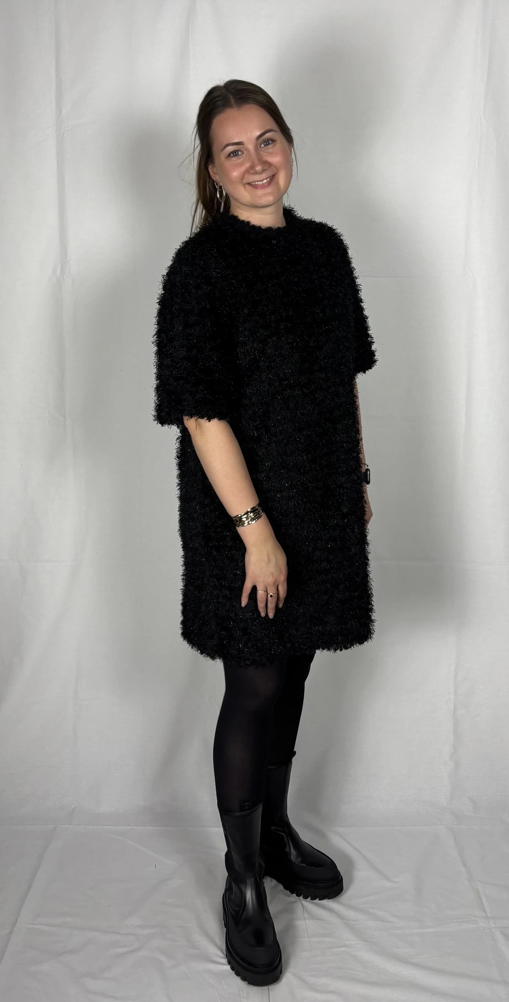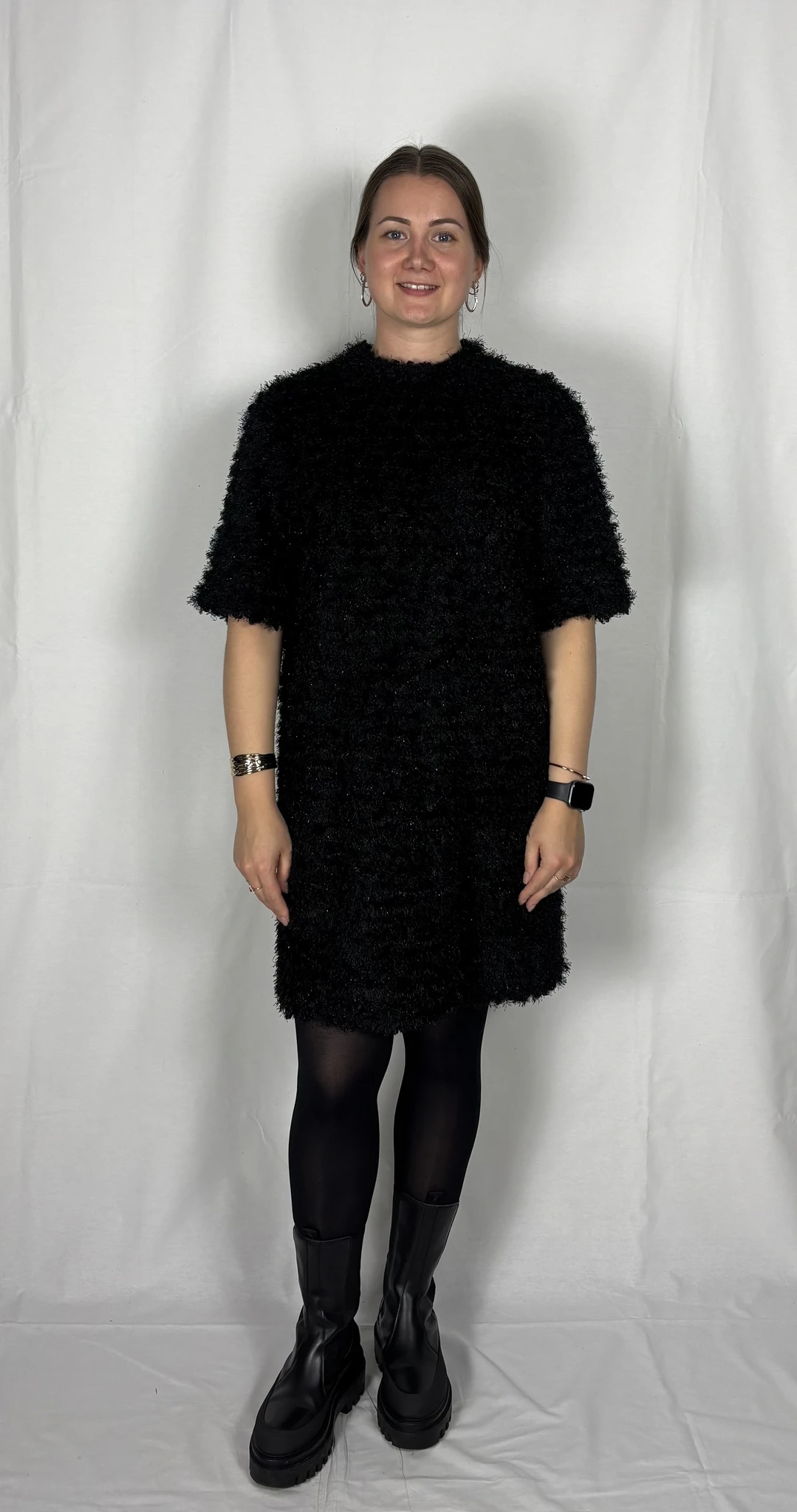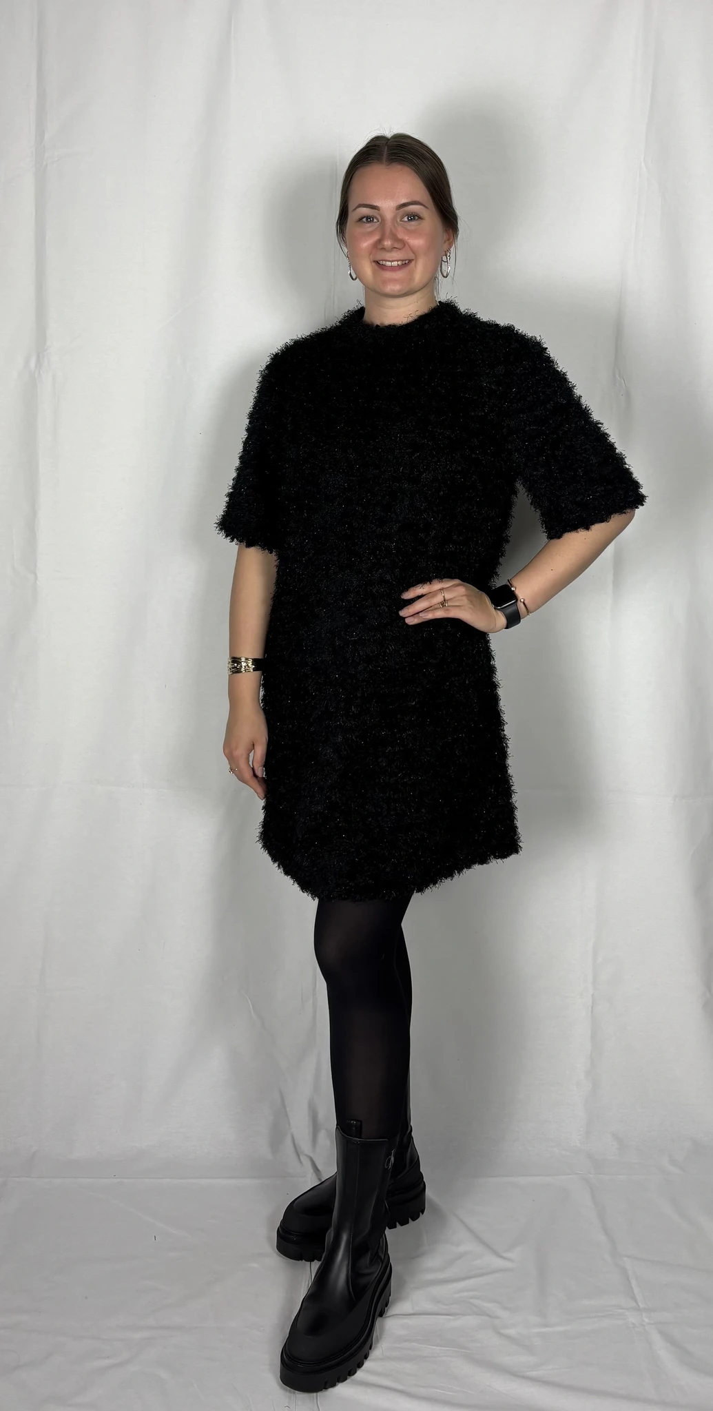 Modellil on seljas musta värvi S suuruses kleit. Modelli pikkus on 169 cm.