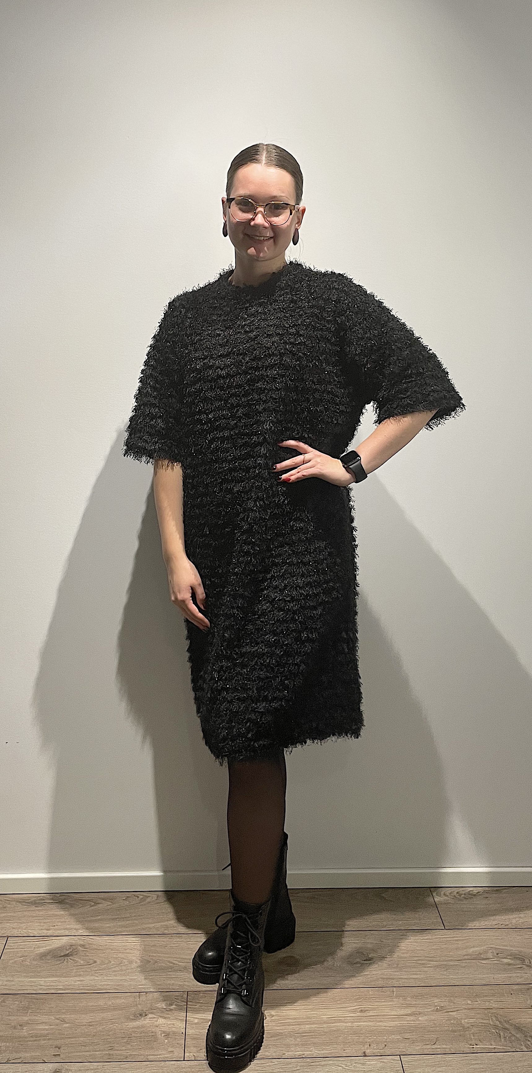 Modellil on seljas musta värvi kleit, suurus S.Piltidel värvid -