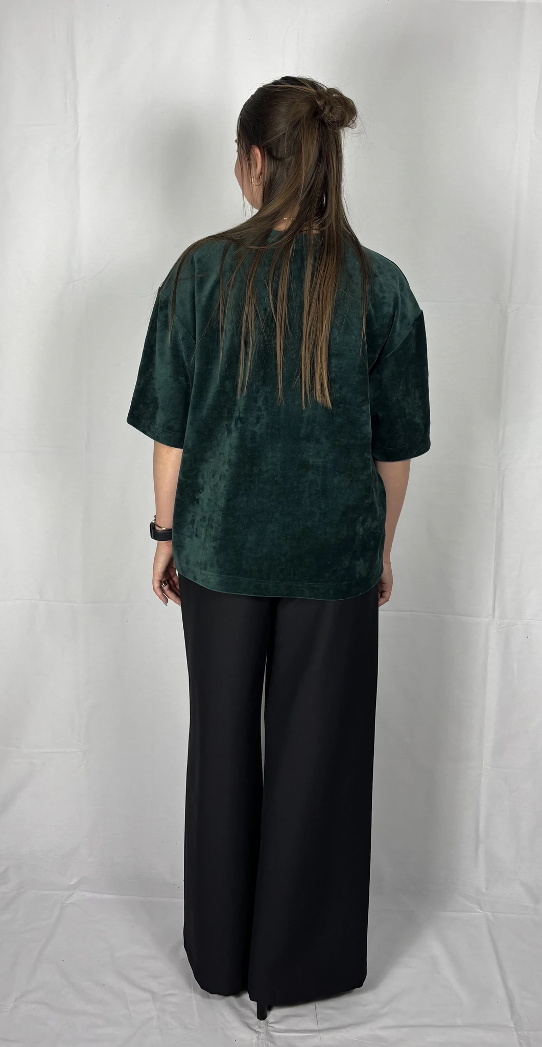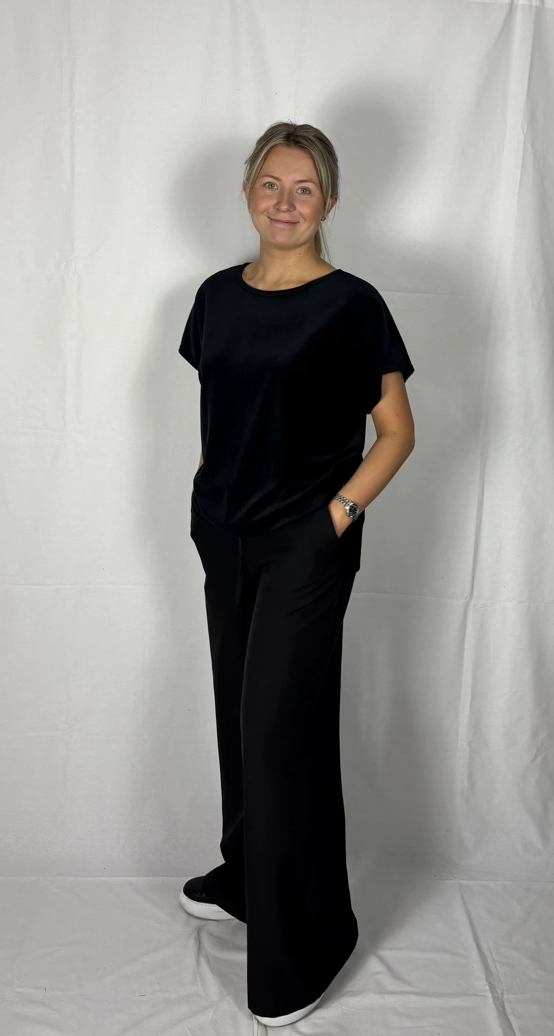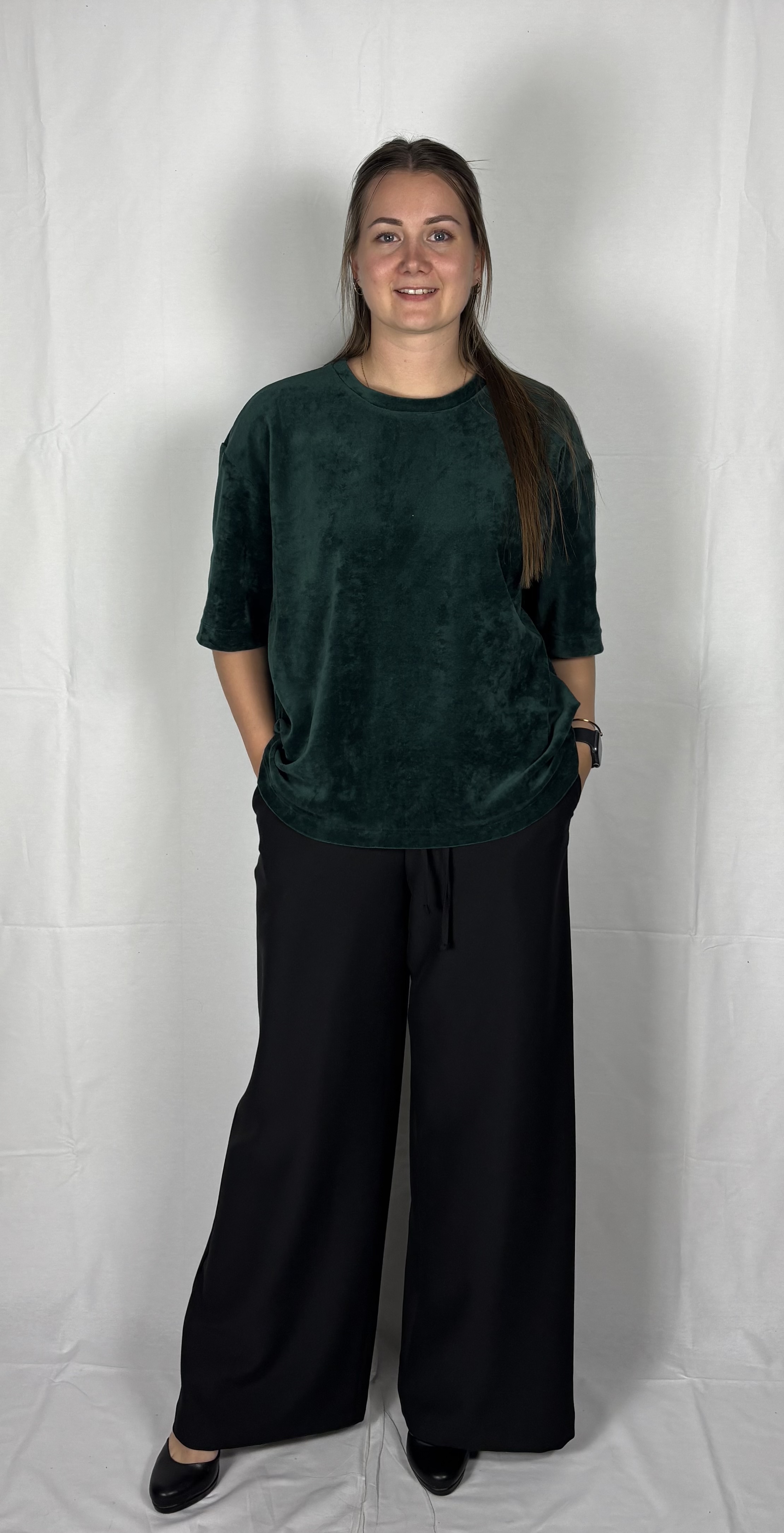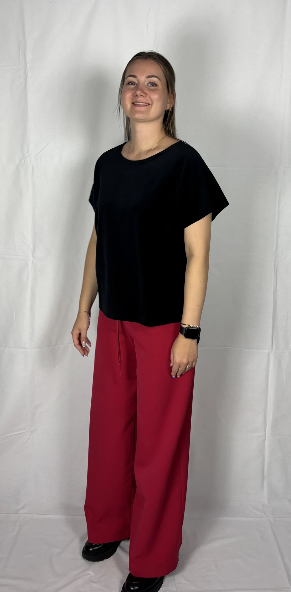 Modellil on jalas musta värvi püksid, suurus M, pikkus II. Piltidel värvid -