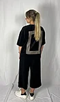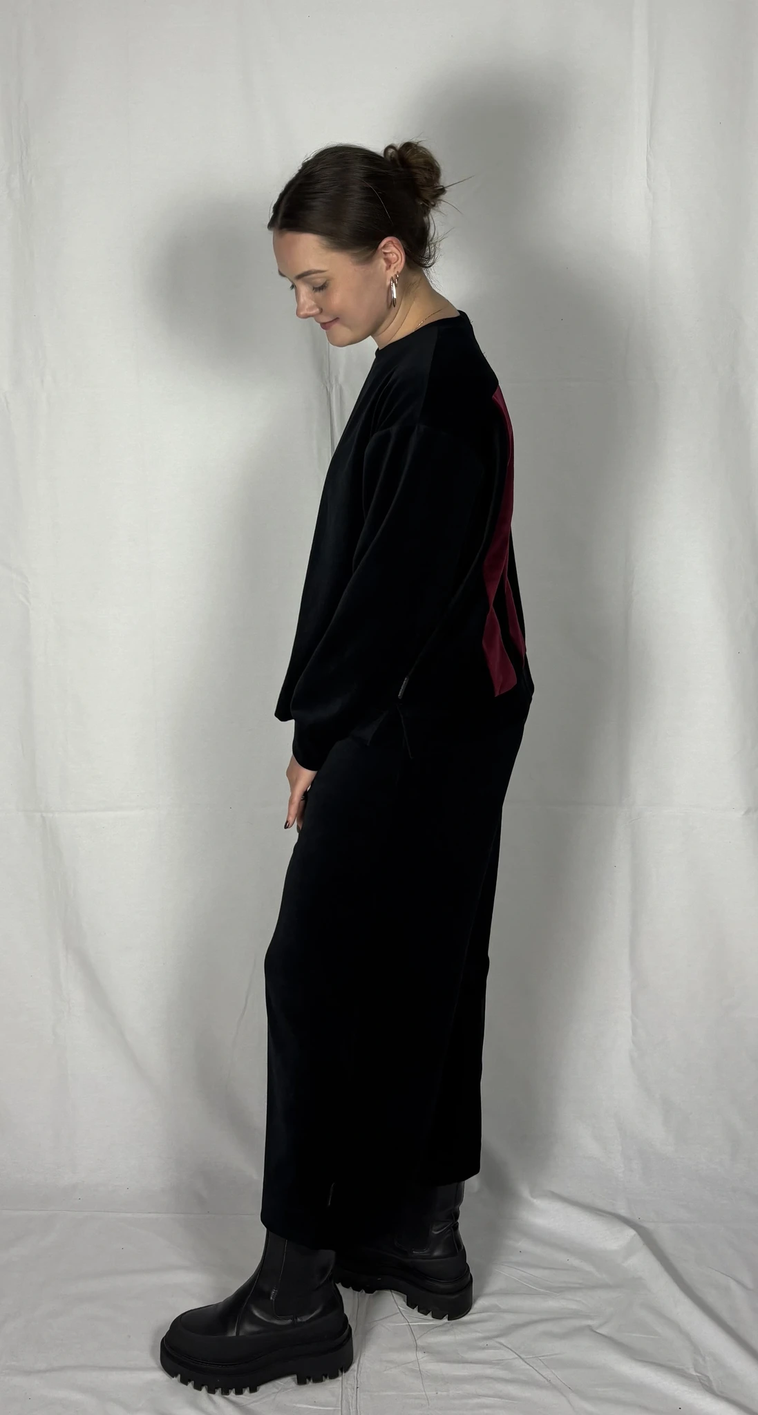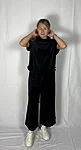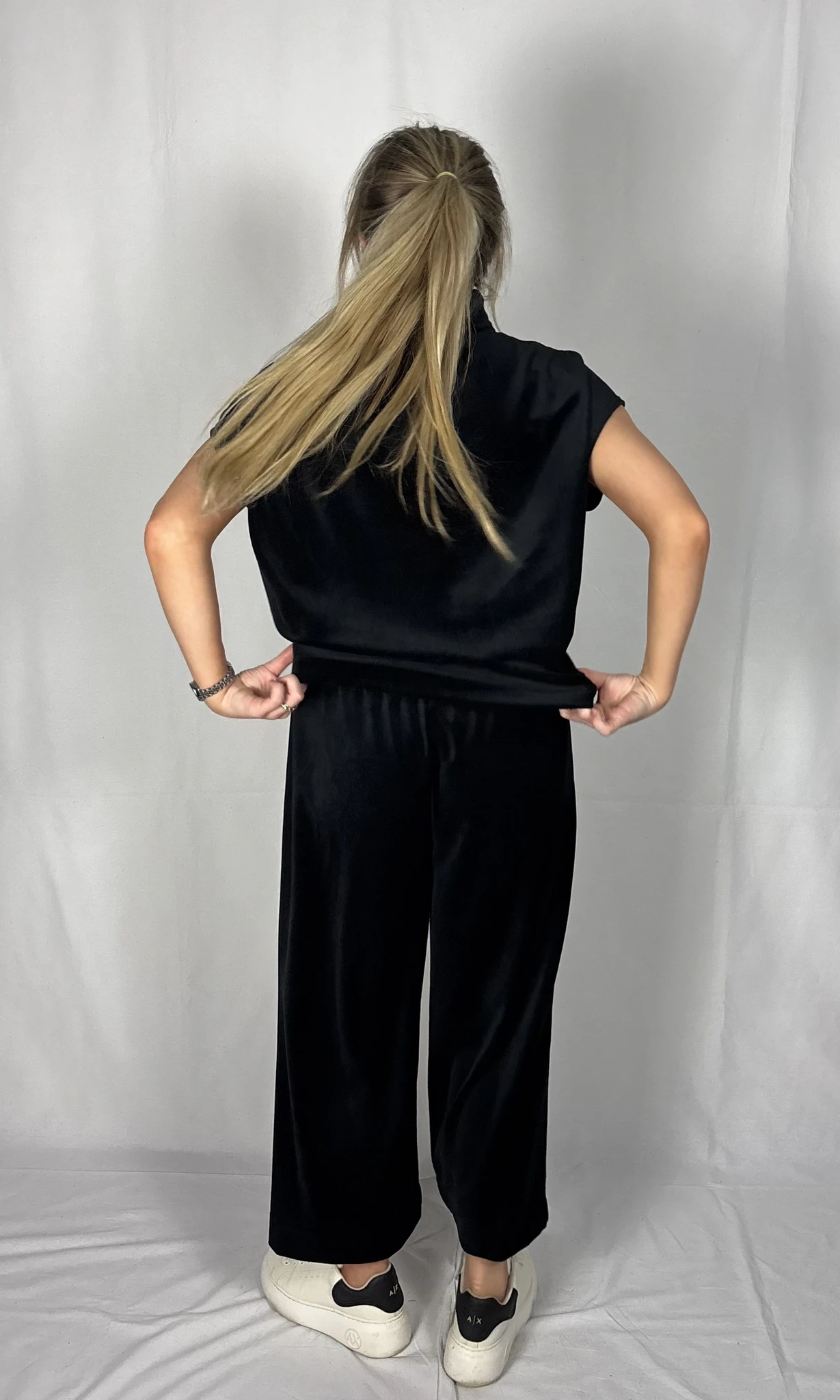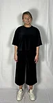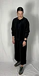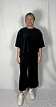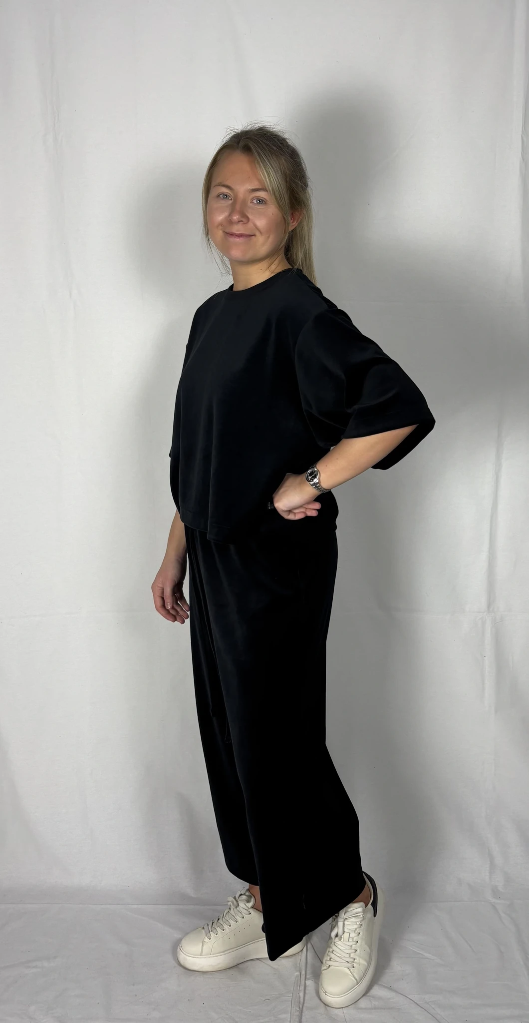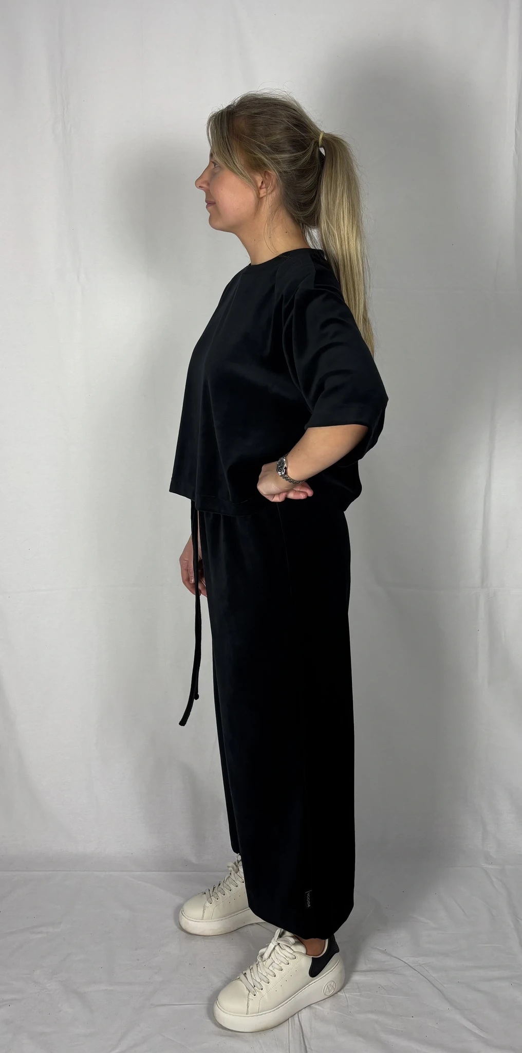 Modellil on jalas musta värvi püksid, suurus M, pikkus I (85cm).