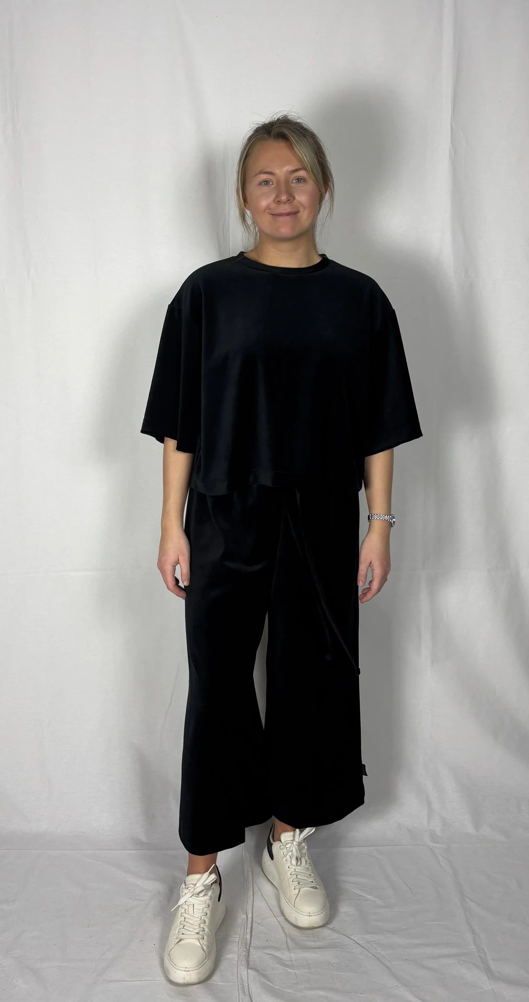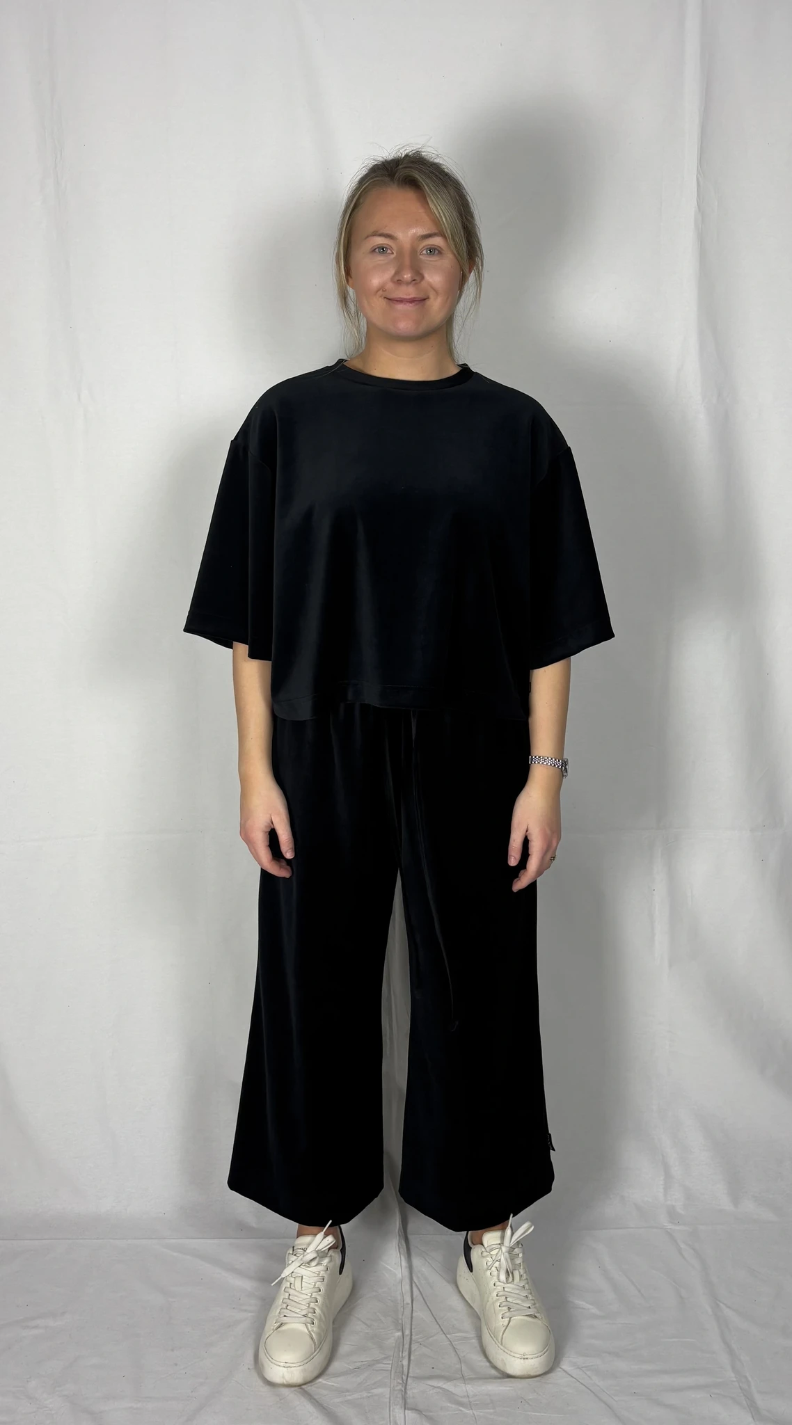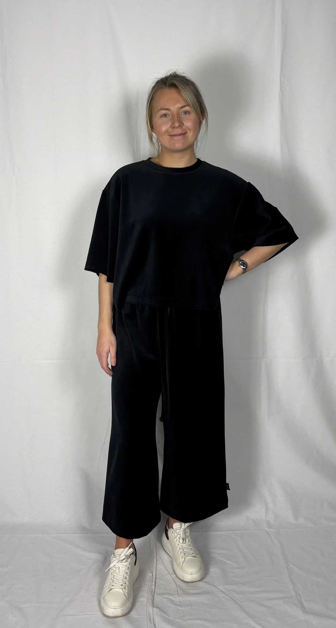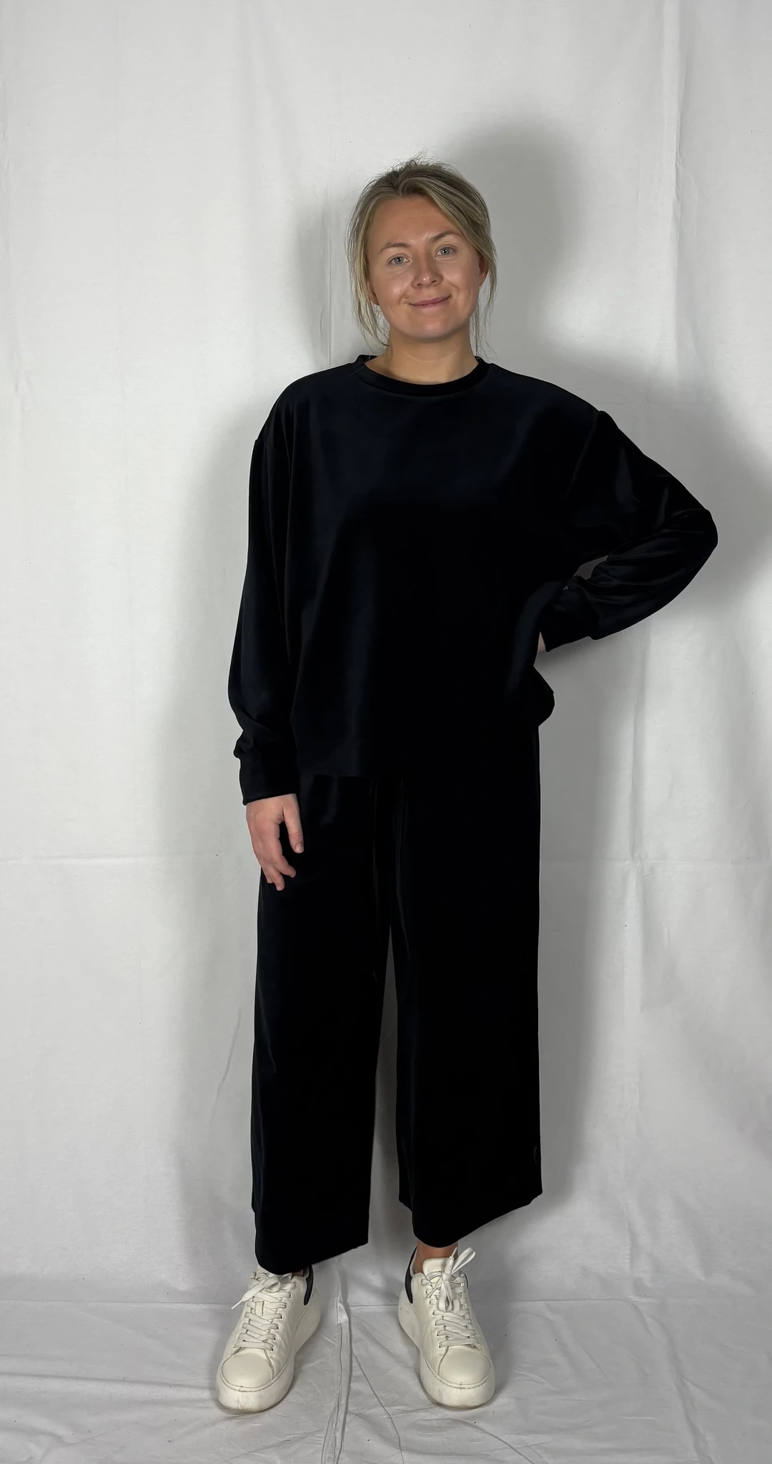 Modellil on jalas musta värvi püksid, suurus M, pikkus I (85cm) ja musta värvi püksid, suurus M, pikkus II (80cm). Modelli pikkus on 169cm.