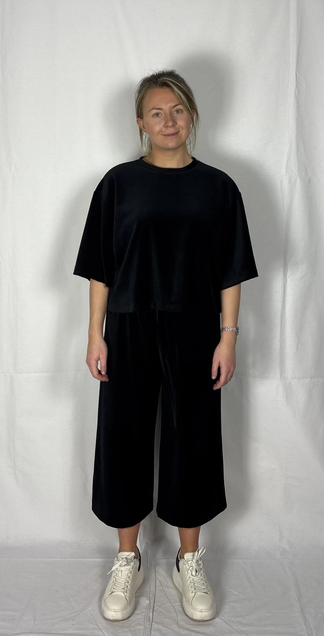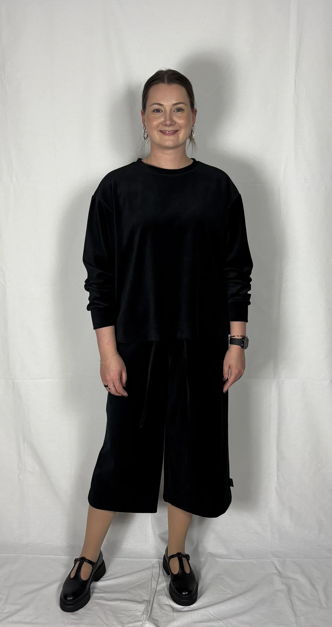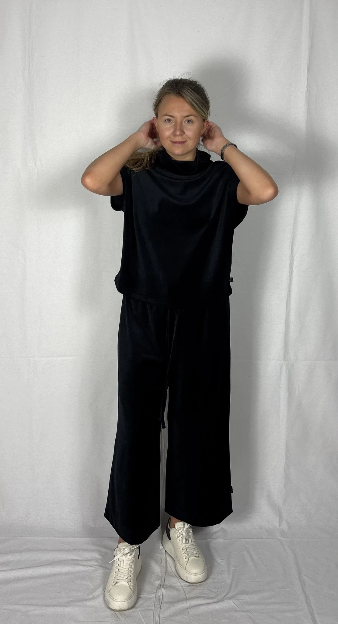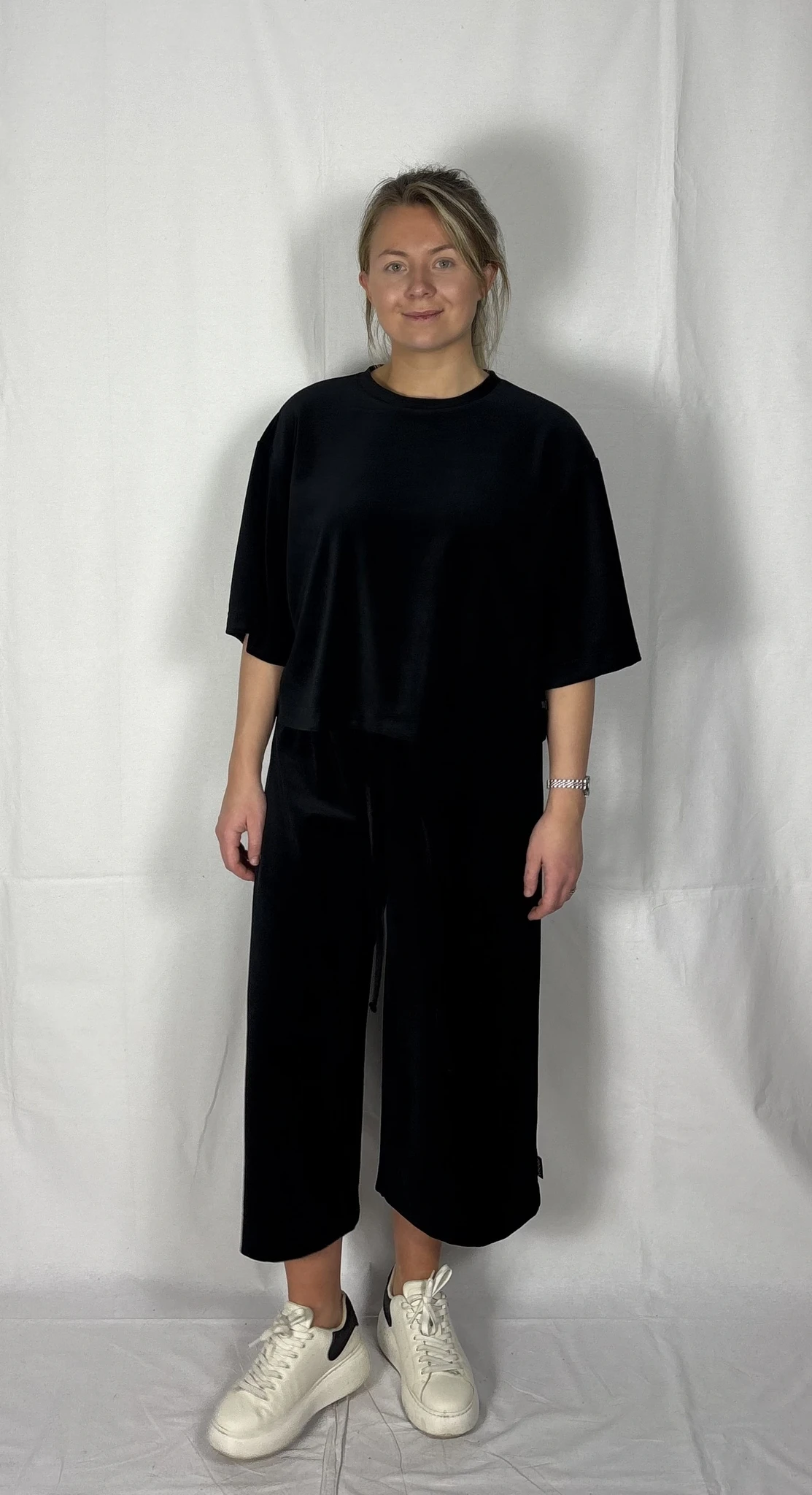 Modellil on jalas musta värvi püksid, suurus M, pikkus I (85cm) ja musta värvi püksid, suurus M, pikkus II (80cm). Modelli pikkus on 169cm.