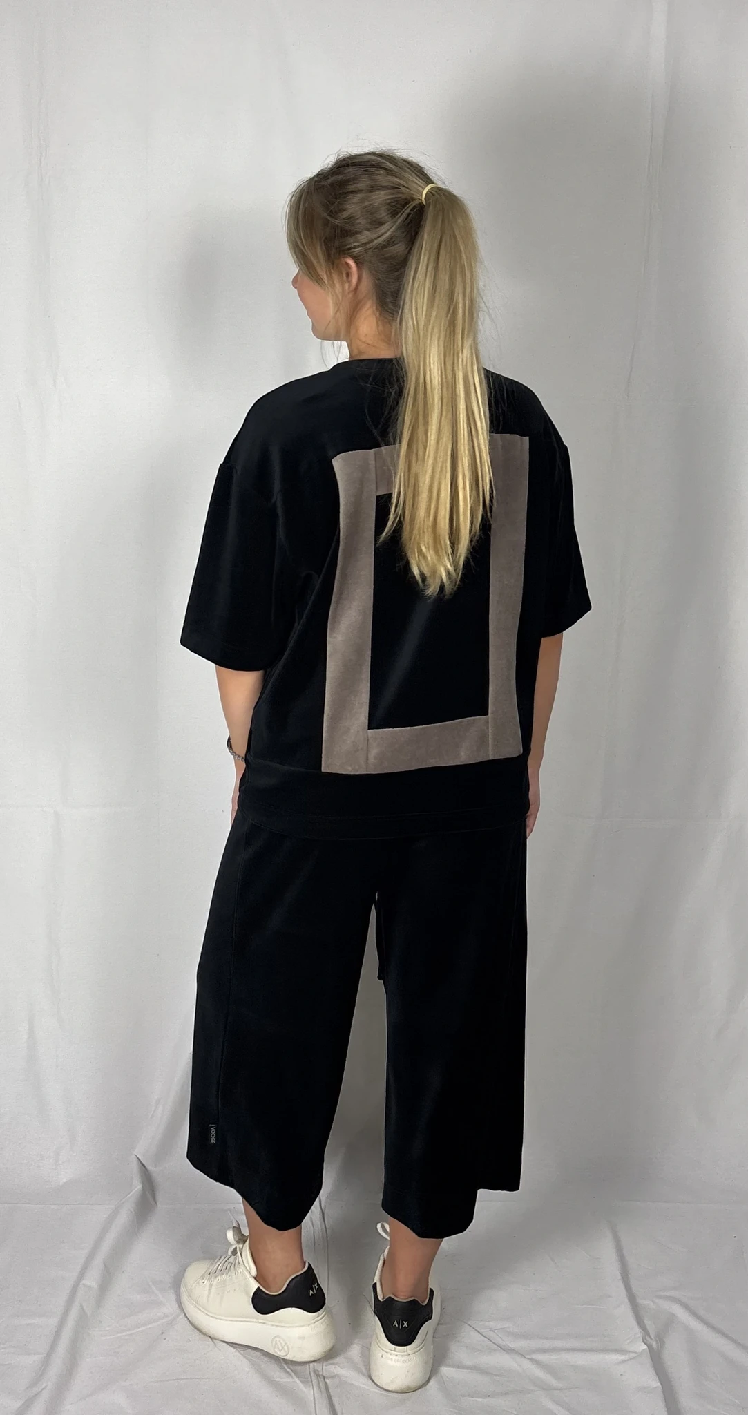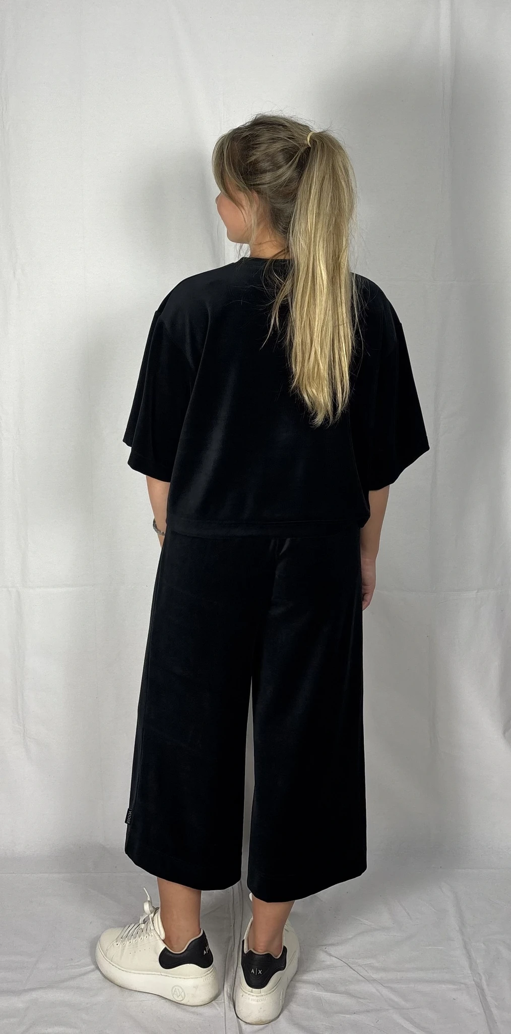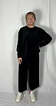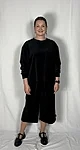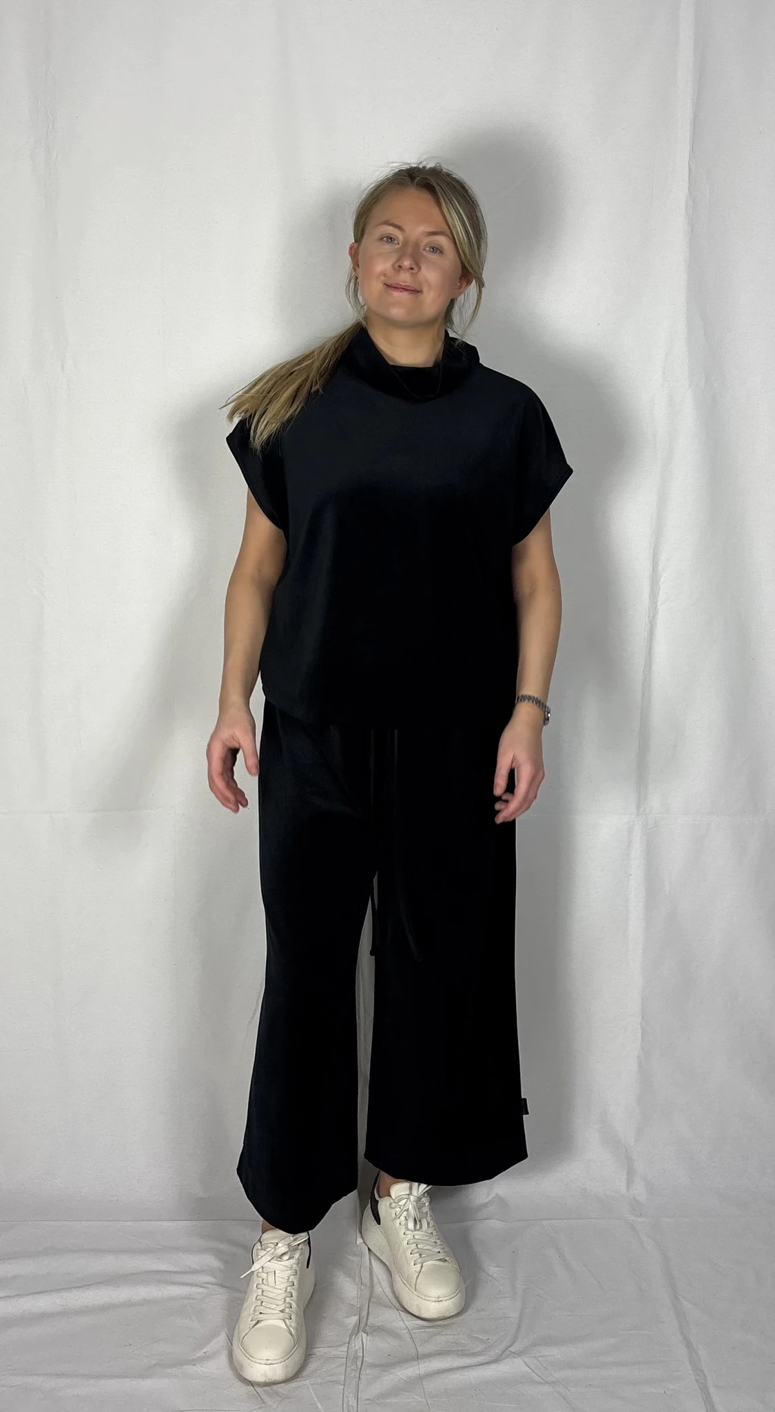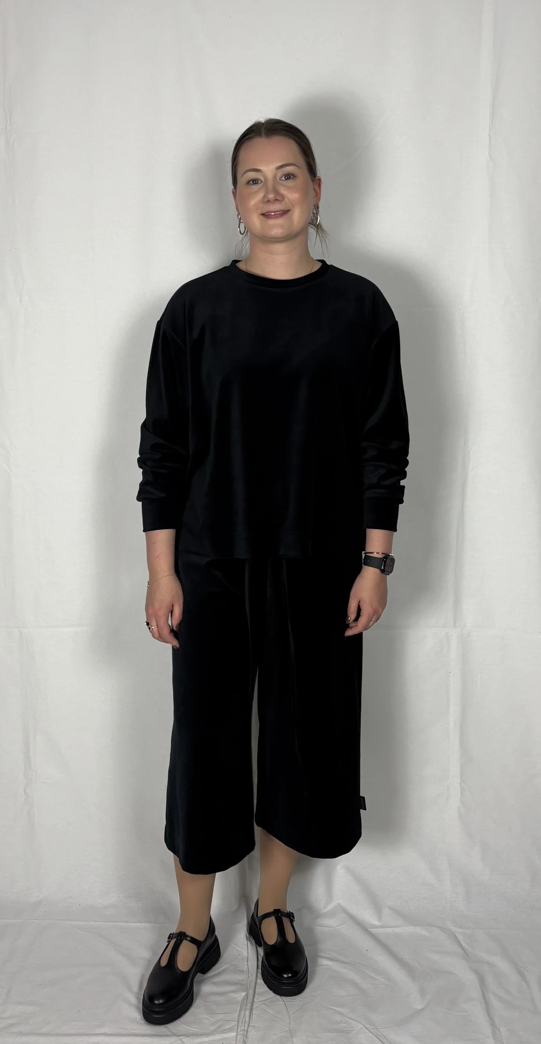 Modellil on jalas musta värvi püksid, suurus M, pikkus I (85cm) ja musta värvi püksid, suurus M, pikkus II (80cm). Modelli pikkus on 169cm.