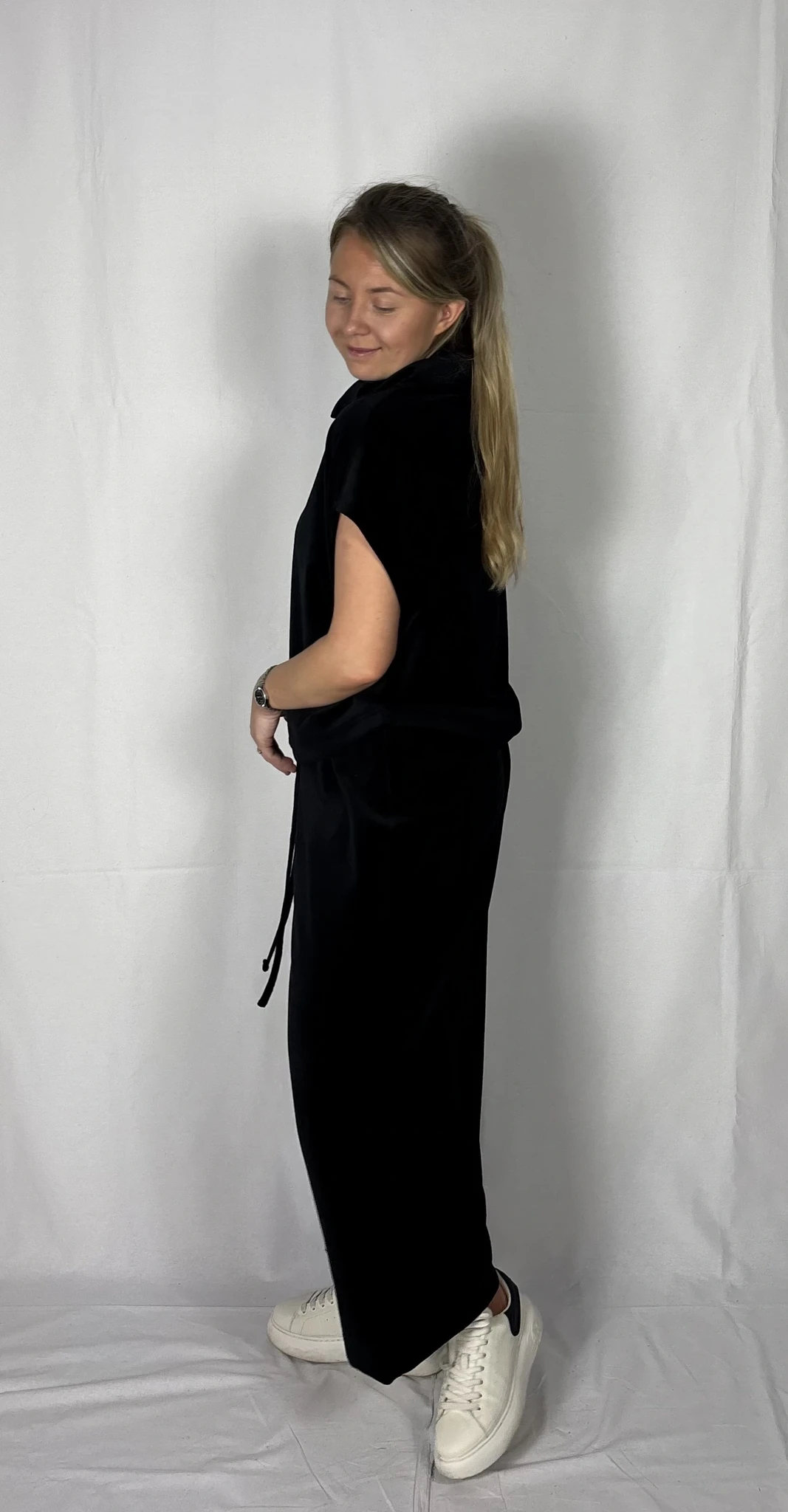 Modellil on jalas musta värvi püksid, suurus M, pikkus II (80cm). Piltidel värvid -