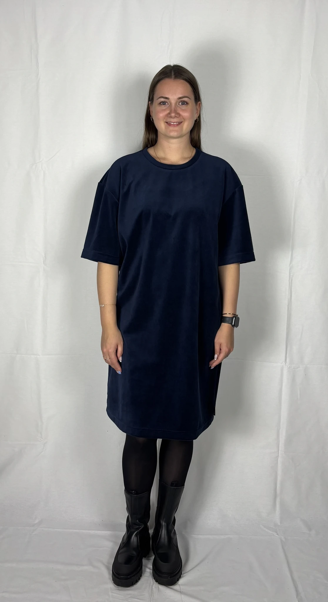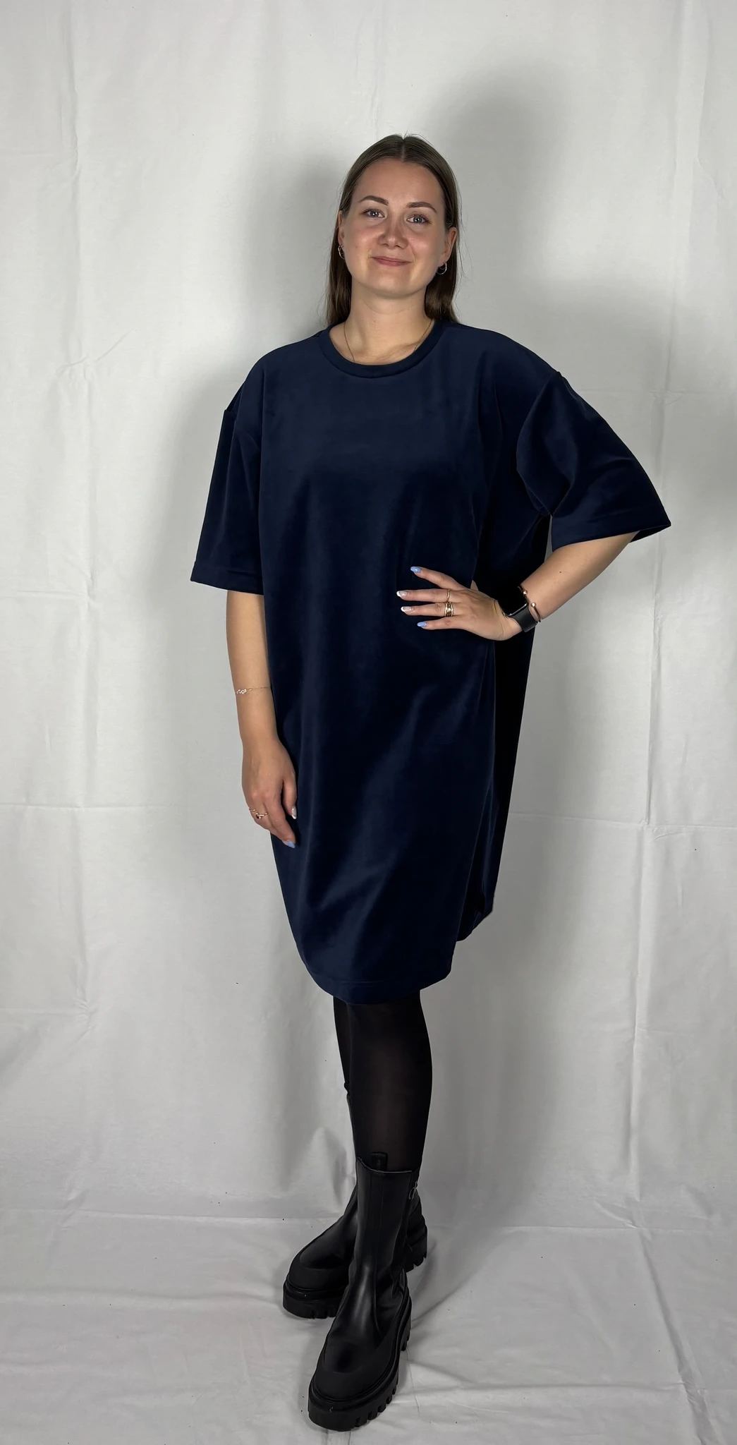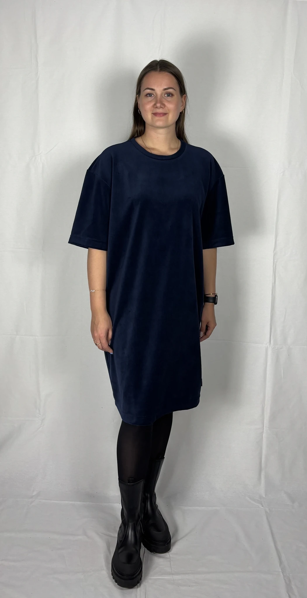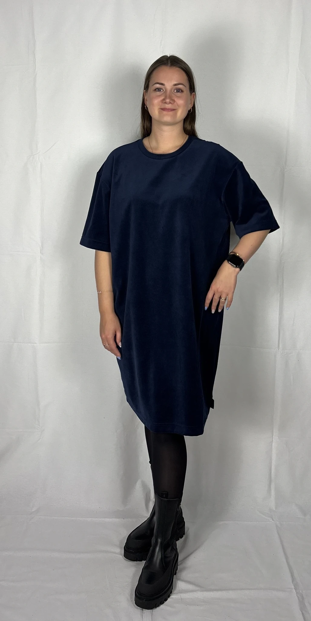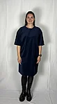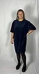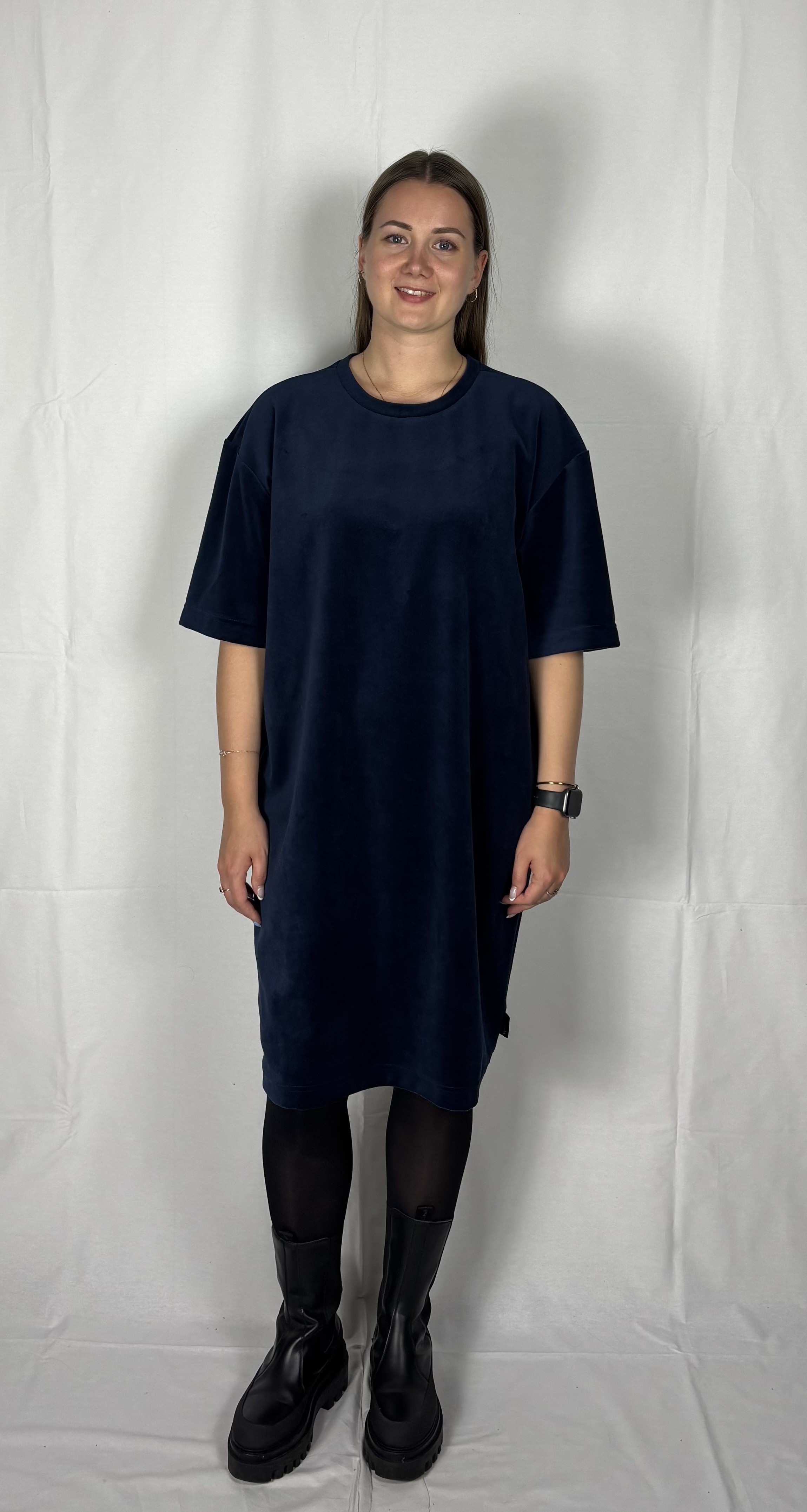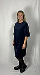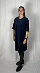Modellil on seljas tumesinist värvi kleit, suurus M. Piltidel värvid -