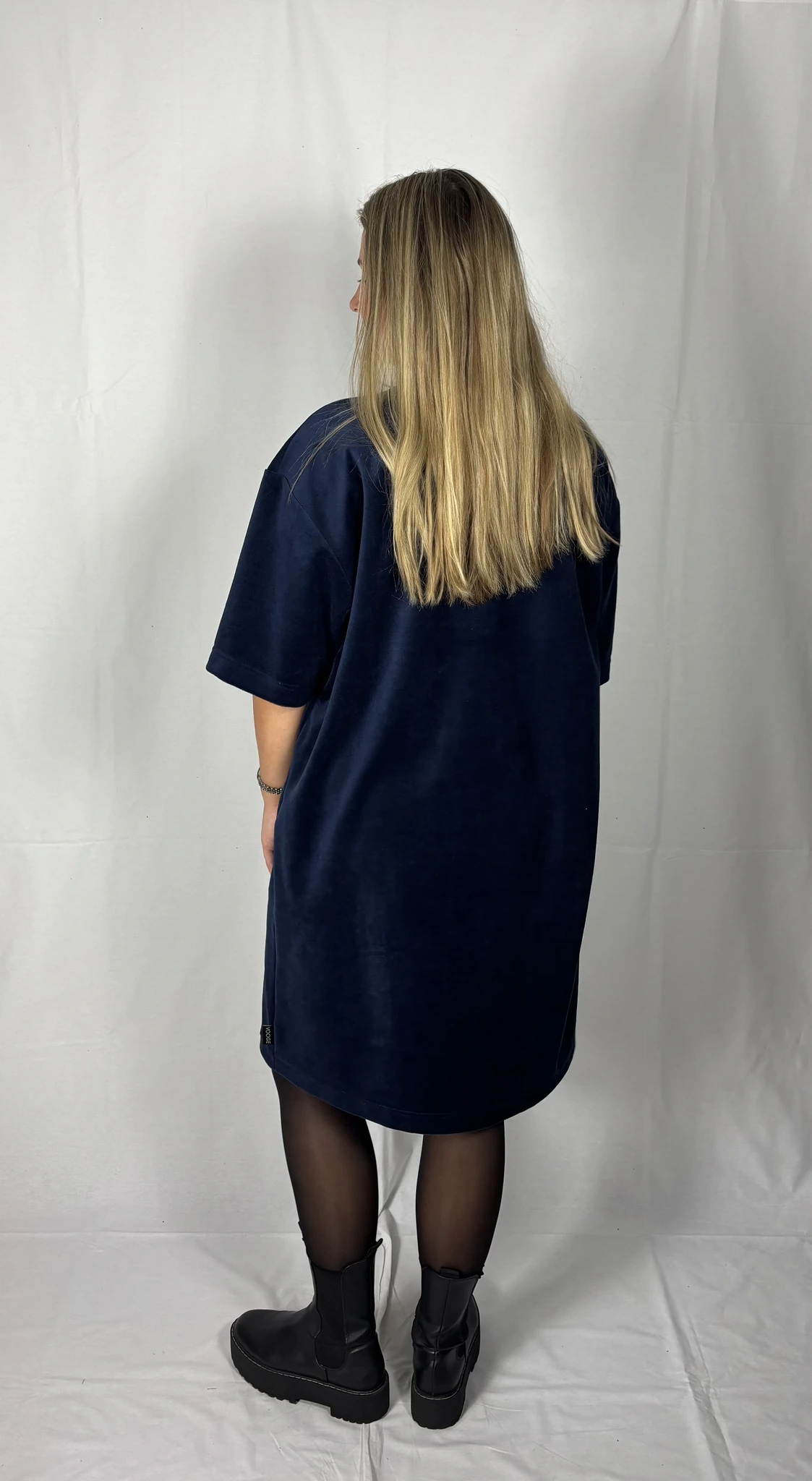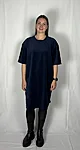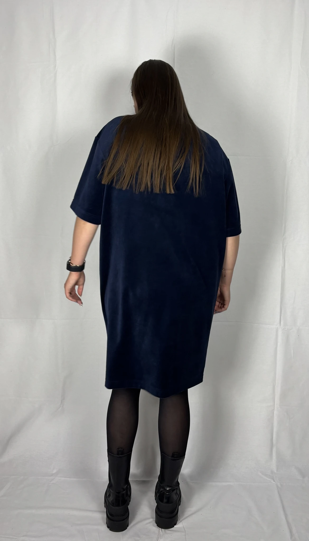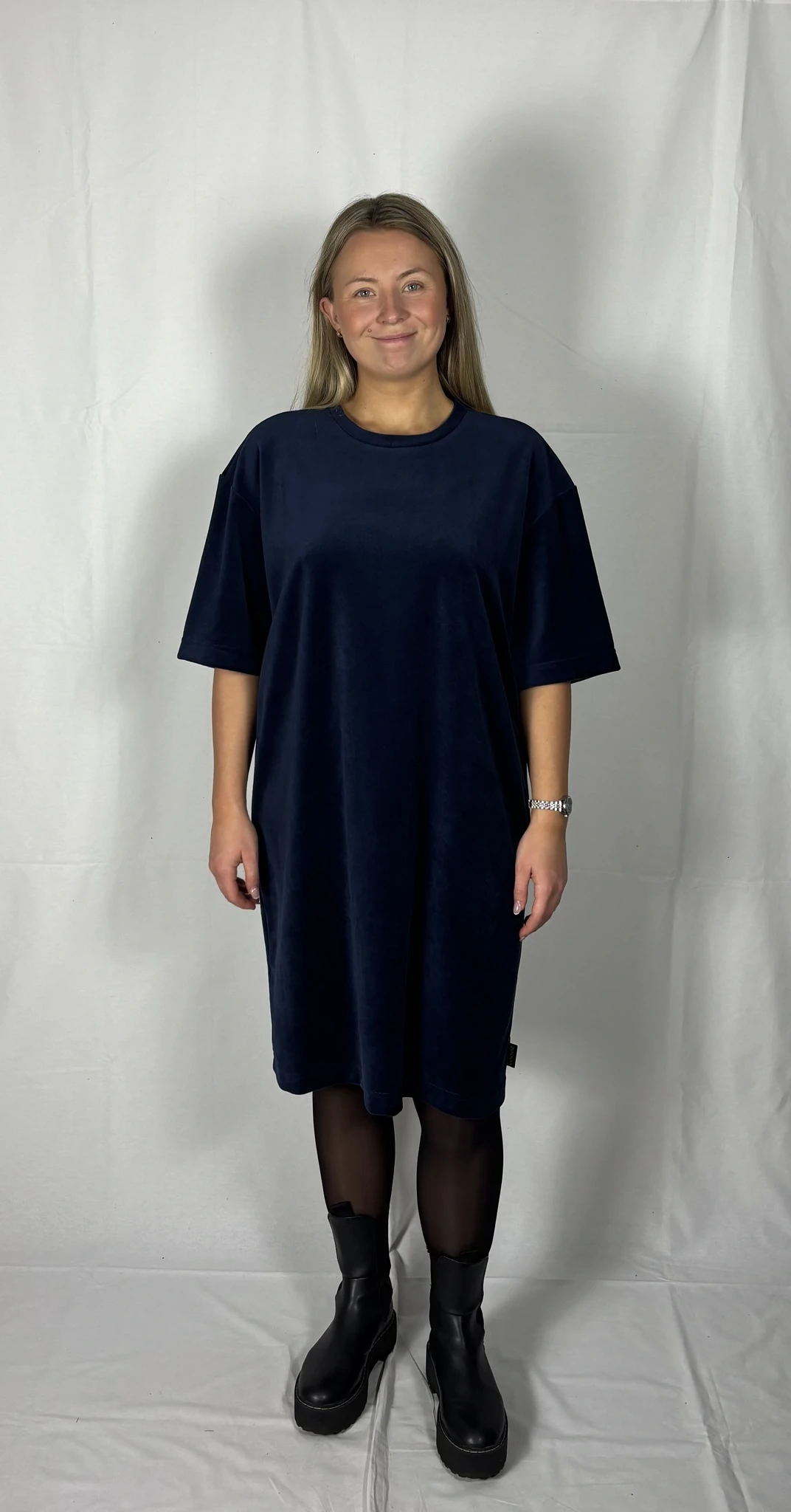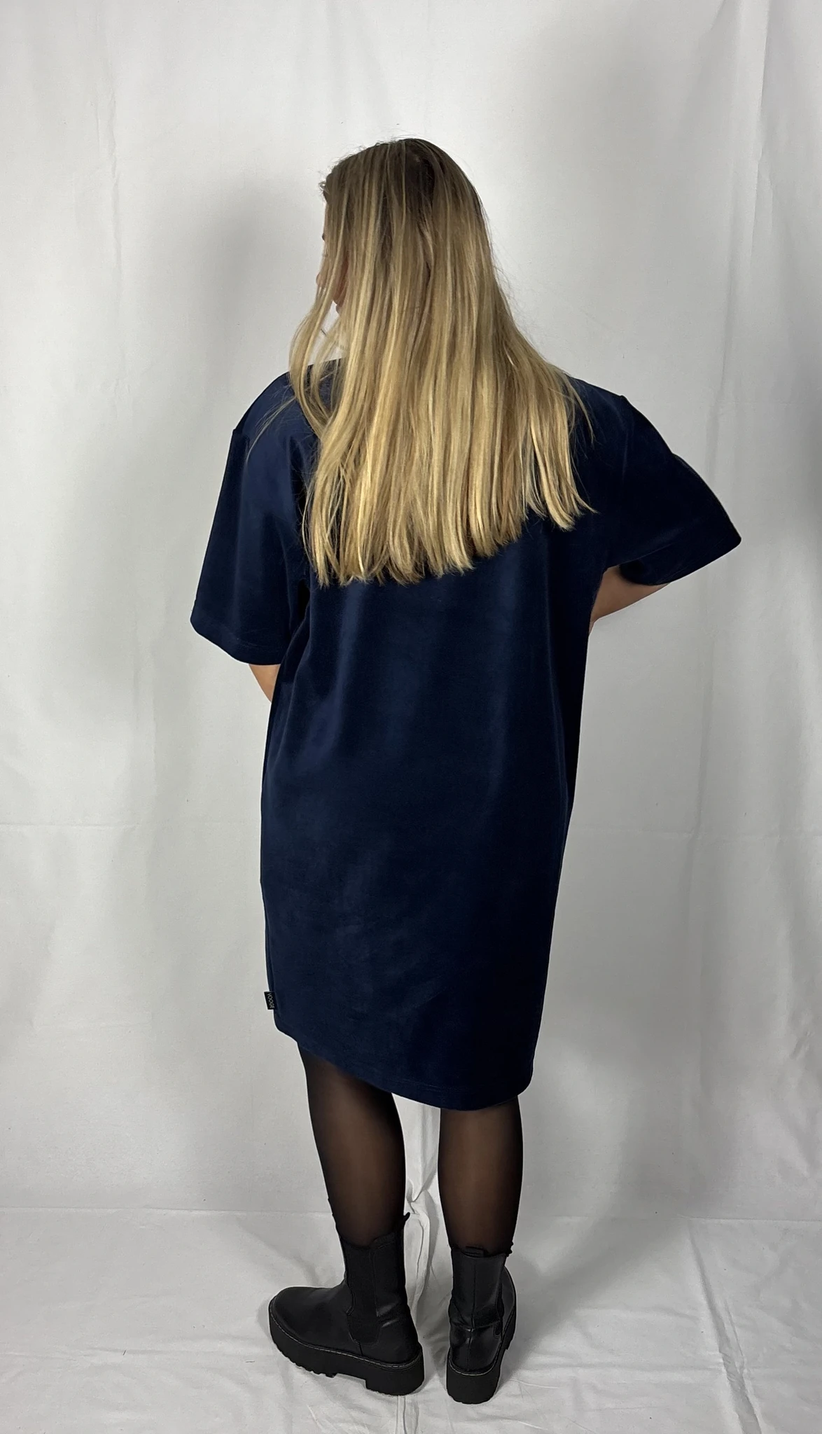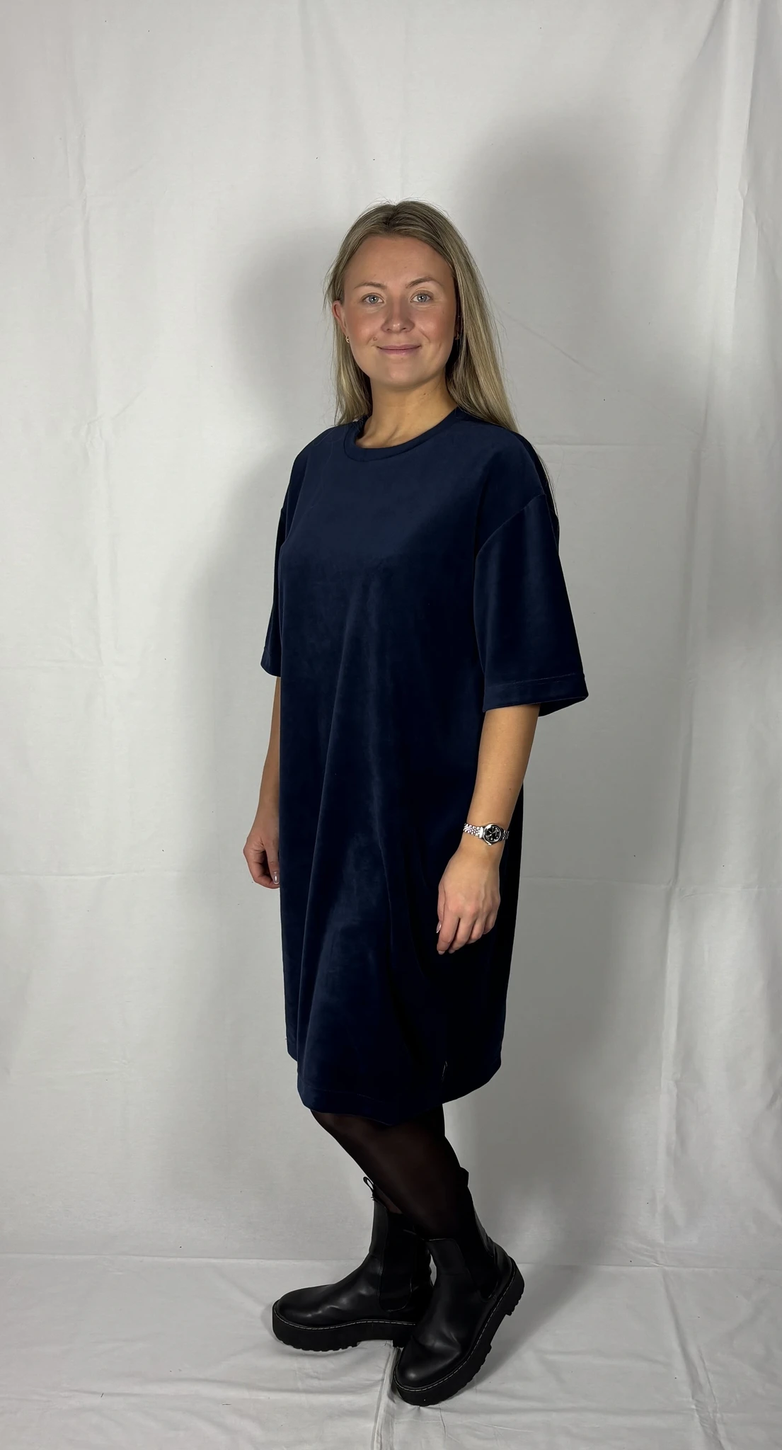 Modellil on seljas tumesinist värvi kleit, suurus M. Piltidel värvid -