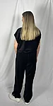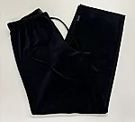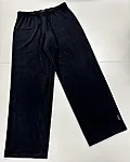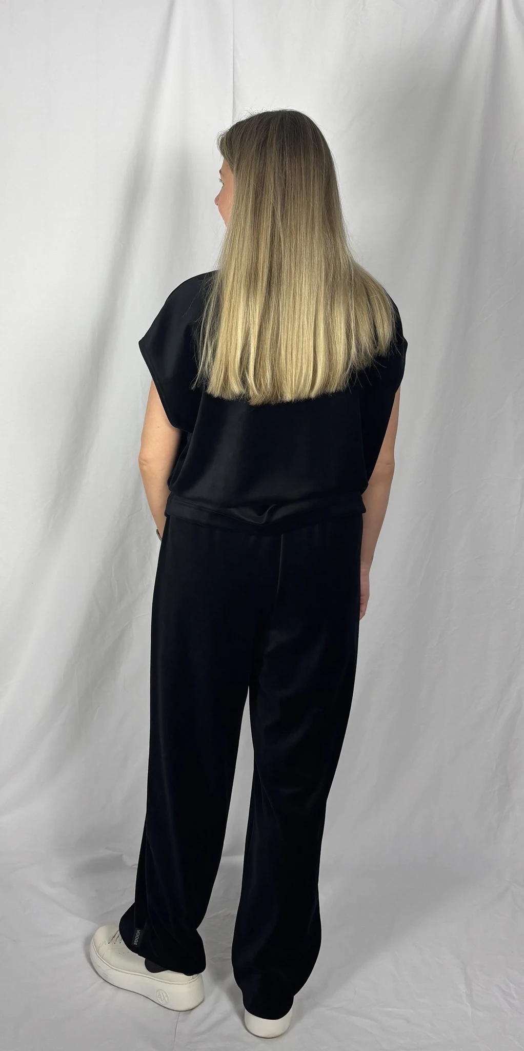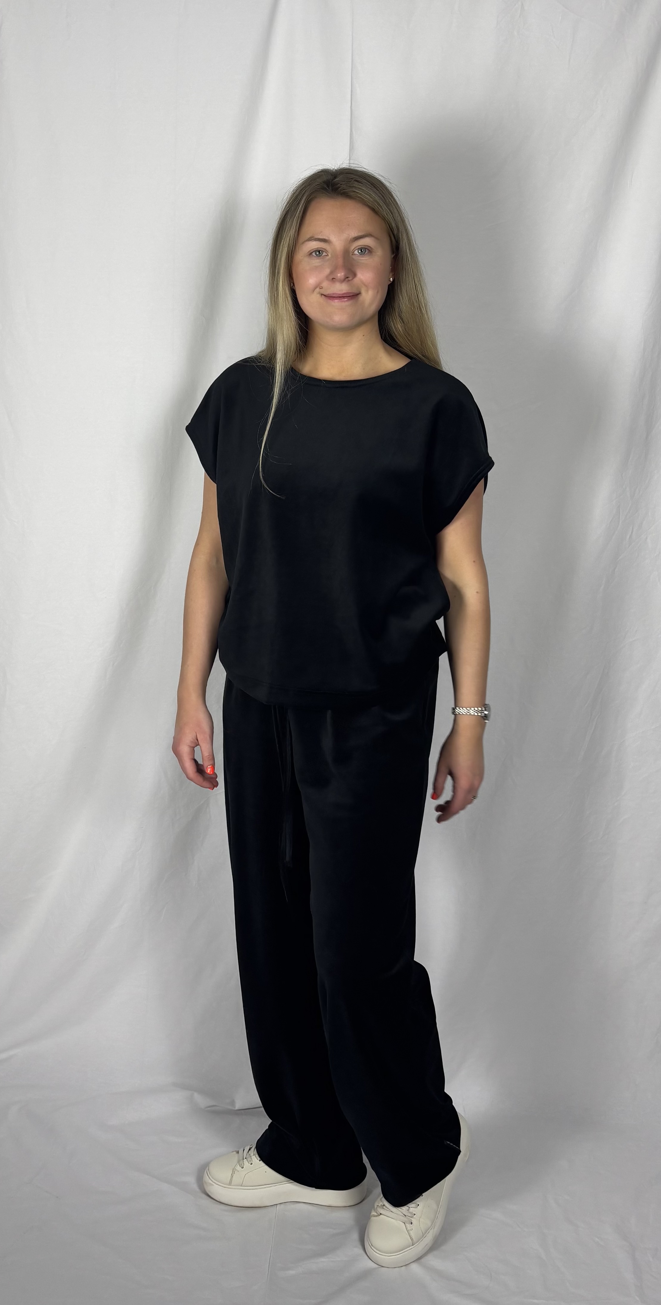 Modellil on jalas musta värvi ilma taskuteta veluurpüksid, suurus M.