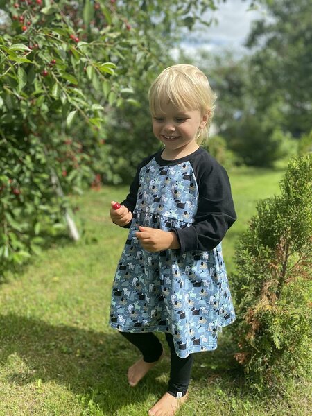 Eritellimusel kirjul kleidil ühevärvilised, musta värvi varrukad.